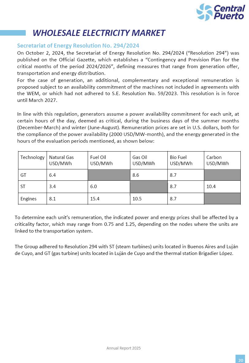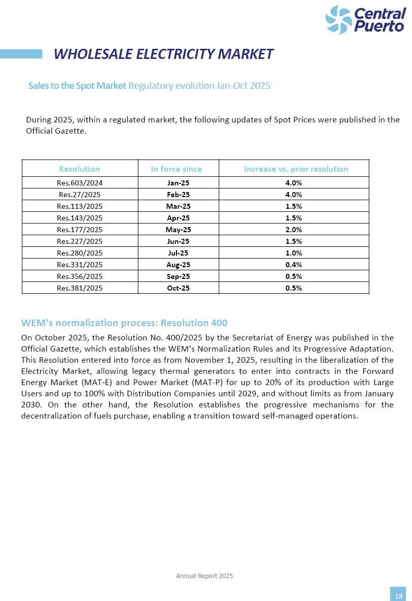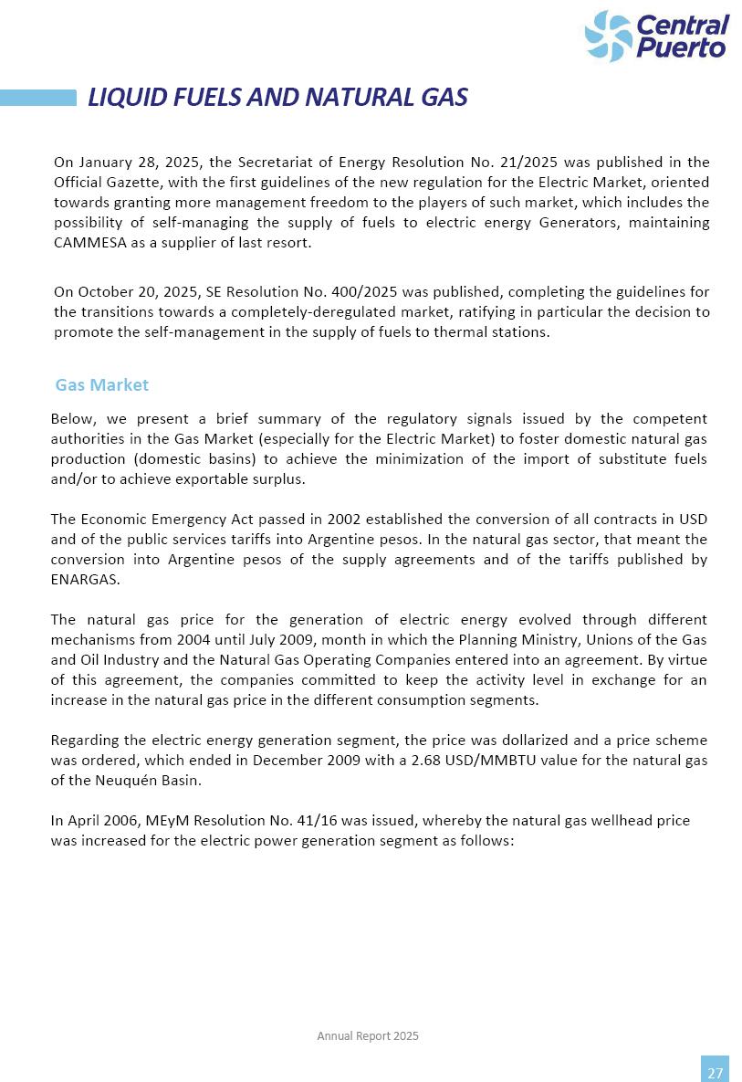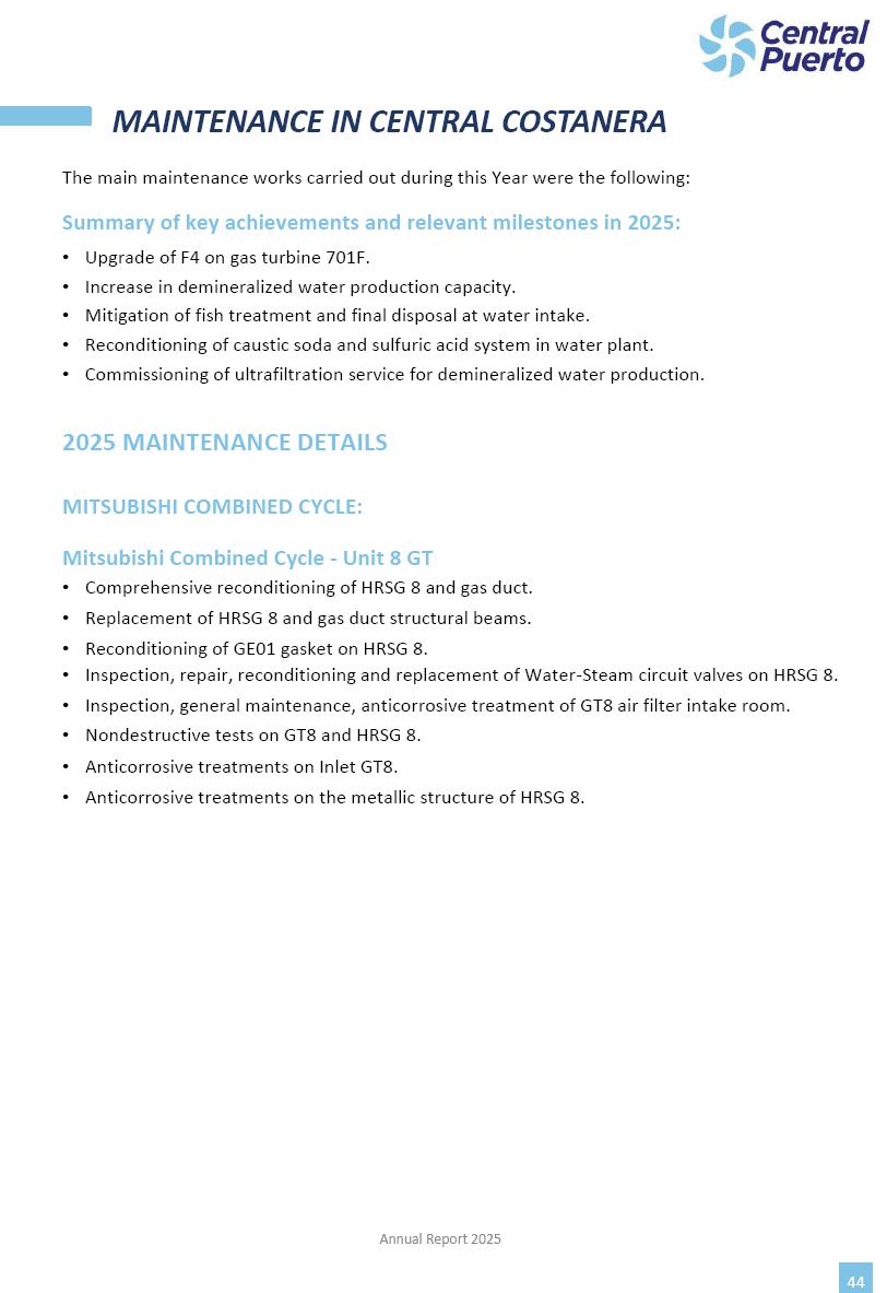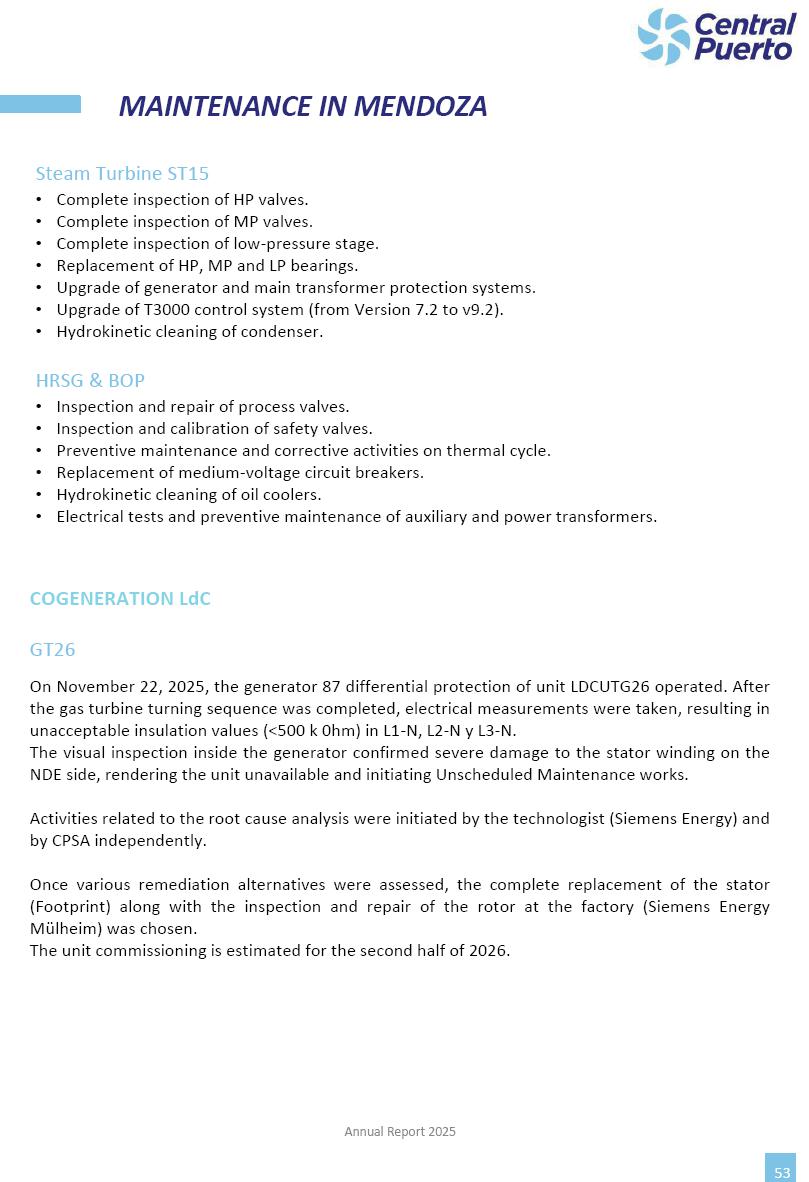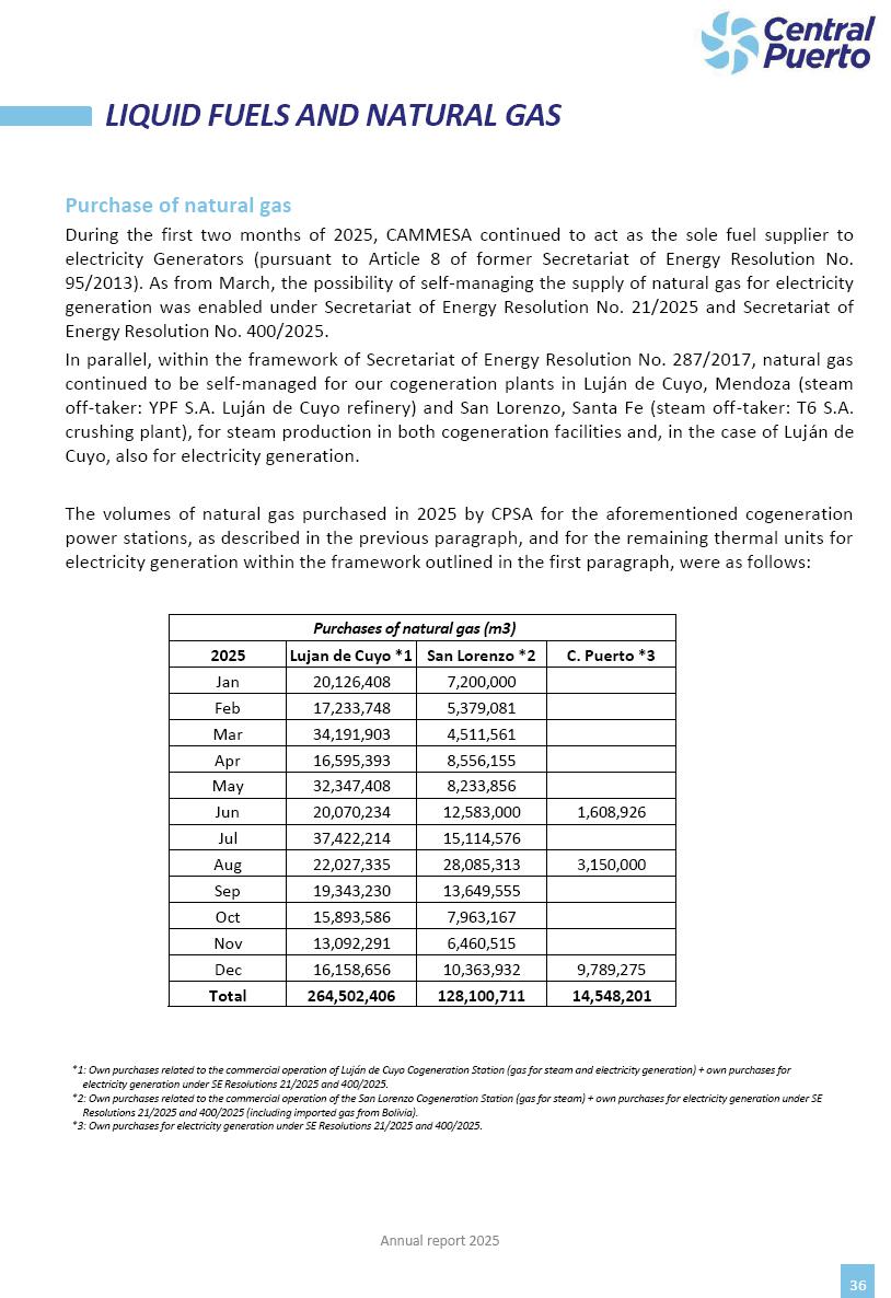 Annual Report Central Puerto December 2025 2 CONTENT 1. Company’s overview Corporate Governance Board of Directors, Statutory Audit Committee and Supervisory Committee Corporate information 2. Macroeconomic context 3. The Argentine Wholesale Electricity Market Trade Agreements in the forward market Liquid fuels and natural gas 4. Maintenance Puerto Nuevo & Nuevo Puerto Site Mendoza Piedra del Águila Site Brigadier López Site San Lorenzo Site – Terminal 6 5. Human Resource 6. Environment, Health & Safety and Quality Commitment Policy Environment Health & Safety Quality 7. Finances General remarks Outlook for the current fiscal year Allocation of fiscal year results Financial performance 01 Company’s overview CORPORATE GOVERNANCE Annual Report 2025 4 Directors Osvaldo Arturo RECA (Chairman) Miguel DODERO (Vice-Chairman) José Luis MOREA Tomás José WHITE Marcelo Atilio SUVA Jorge Eduardo VILLEGAS Martina BLANCO Diego Gustavo PETRACCHI Martín LHEZ Deputy Directors Fernando Roberto BONNET José Manuel ORTIZ Adrián Gustavo SALVATORE Martín OROZCO Mario ELIZALDE José Manuel PAZOS Alejo VILLEGAS Ramón Nazareno ULLOA CORPORATE GOVERNANCE Annual Report 2025 5 STATUTORY AUDIT COMMITTEE Statutory Auditors Carlos César Adolfo HALLADJIAN Eduardo Antonio EROSA Juan Antonio NICHOLSON Deputy Statutory Auditors Carlos Adolfo ZLOTNITZKY Cristina Margarita DE GIORGIO Lucas NICHOLSON SUPERVISORY COMMITTEE Members José Luis MOREA Tomás José WHITE (financial expert) Jorge Eduardo VILLEGAS Deputy members Juan Manuel ORTIZ Mario ELIZALDE Annual Report 2025 6 CORPORATE INFORMATION Central Puerto S.A. (the “Company” or “CPSA”) and the companies that make up the economic group (the “Group”) form an integrated group of companies related to the energy sector, mainly engaged in electric power generation and trade. CPSA was incorporated pursuant to the Executive Power (“PEN”) Decree No. 122/92, in accordance with Law No. 24065, which subjected to total privatization the electricity generation, transportation, distribution and trade in charge of Servicios Eléctricos del Gran Buenos Aires S.A. Our shares are listed on Bolsas y Mercados Argentinos (“BYMA”) and, since February 1, 2018, on the NYSE (“New York Stock Exchange”), under the ticker “CEPU”. The Company has the following assets to conduct its electric power generation activity: THERMAL AND HYDROELECTRIC POWER STATIONS (*) ST 140 MW with Commercial Authorization expected for 2026 Luján de Cuyo Thermal Station has a capacity of 125 tn/h of steam production and Terminal 6 – San Lorenzo Cogeneration Thermal Station has a steam production capacity of 340 tn/h. Annual Report 2025 7 CORPORATE INFORMATION The Company has a total installed capacity of 568.8 MW of commercially-authorized power from renewable sources, which is distributed as follows: RENEWABLE ENERGY FARMS (*) CPSA’s acquisition of the complex in September 2025 (**) Generation is considered from the Commercial Authorization of the farm in November 2025 Annual Report 2025 8 CORPORATE INFORMATION Central Puerto has shareholdings in three thermal companies: INVESTEES Annual Report 2025 9 CORPORATE INFORMATION ✓ On July 19, 2028, Ente Nacional Regulador del Gas (Enargas, Argentine Gas Regulating Entity) registered the Company in the Traders and Trade Agreements Register of Enargas. ✓ The company Puerto Energia S.A.U. (completely controlled by CPSA), was registered as trader of natural gas in the Traders Register of Enargas on March 22, 2024, and on September 20, 2024 its entry as Trader Participant in Wholesale Electricity Market (WEM) was authorized. ✓ On March 31, 2025, CPSA’s Board of Directors approved a corporate reorganization by which, subject to the approval of the Shareholders’ Meetings of the companies involved, CPSA absorbed the assets and liabilities of the subsidiary CPR. Since CPSA owned 100% of CPR’s shares, its equity did not increase as a result of the merger. Subsidiary CPR will be dissolved without liquidation. On May 22, 2025, the corresponding Shareholders’ Meetings approved the corporate reorganization. The merger’s effective date was defined to be October 1, 2025, once all the conditions established in the Merger Final Agreement were met and after the approval of the corporate reorganization by CNV, which occurred on September 10, 2025. ✓ Regarding the mining sector, the Company has a shareholding of: a) 9.9% in AbraSilver Resource Corp. (“AbraSilver”), a company listed on the Canadian Stock Exchange with mining concessions in Argentina, which includes the silver-gold project Diablillos, located in the Northwest area of Argentina, on the limit between the provinces of Salta and Catamarca, and b) 27.5% of the share capital of 3C Lithium Pte. Ltd. (“3C”) (incorporated under the regulations of Singapore), which owns 100% of the share capital of Minera Cordillera S.A., an Argentine company owning the mining rights of the project “Tres Cruces”, located in Catamarca, Argentina. The project “Tres Cruces” involves a recently-discovered lithium deposit, with the aim of developing exploring, drilling and exploitation activities of the mineral. ✓ The Group participates in the forestry sector with assets in the provinces of Entre Ríos and Corrientes, through the following subsidiaries of Proener S.A.U (a company completely owned by CPSA): a) Forestal Argentina S.A., owner of forestry assets consisting of approximately 141,000 hectares in the provinces of Entre Ríos and Corrientes, of which 67,000 hectares are planted with eucalyptus and pine, over a total of 77,500 arable hectares; and b) Loma Alta Forestal S.A., owner of forestry assets consisting of approximately 19,400 hectares in the province of Corrientes, of which approximately 10,400 hectares are planted with pine. Annual Report 2025 10 CORPORATE INFORMATION ✓ Finally, the Group was involved in the natural gas distribution sector in the regions of Cuyo 