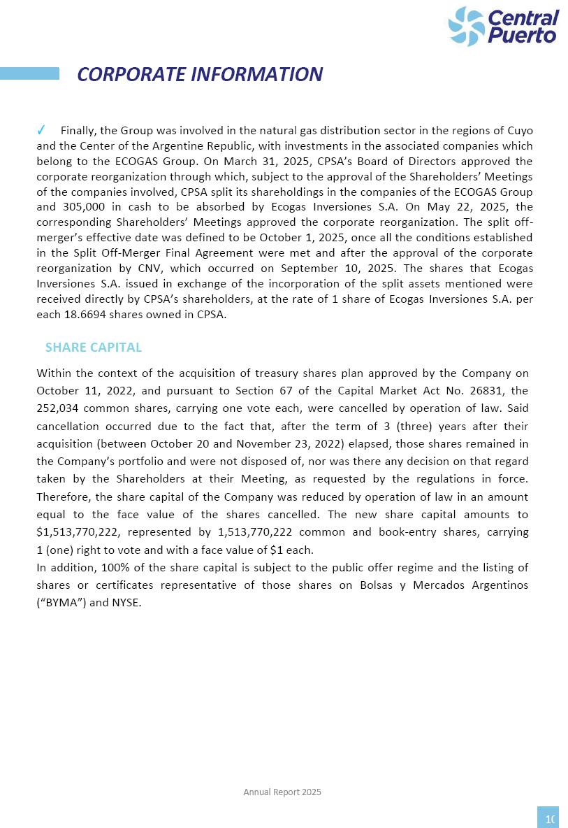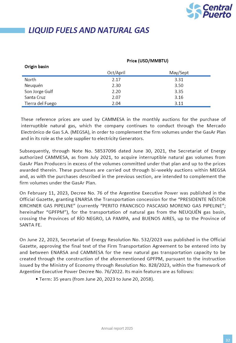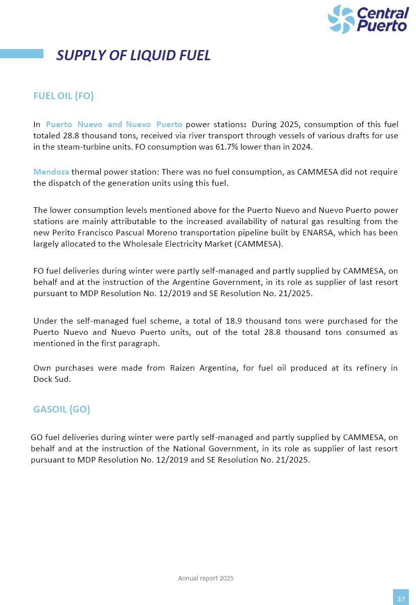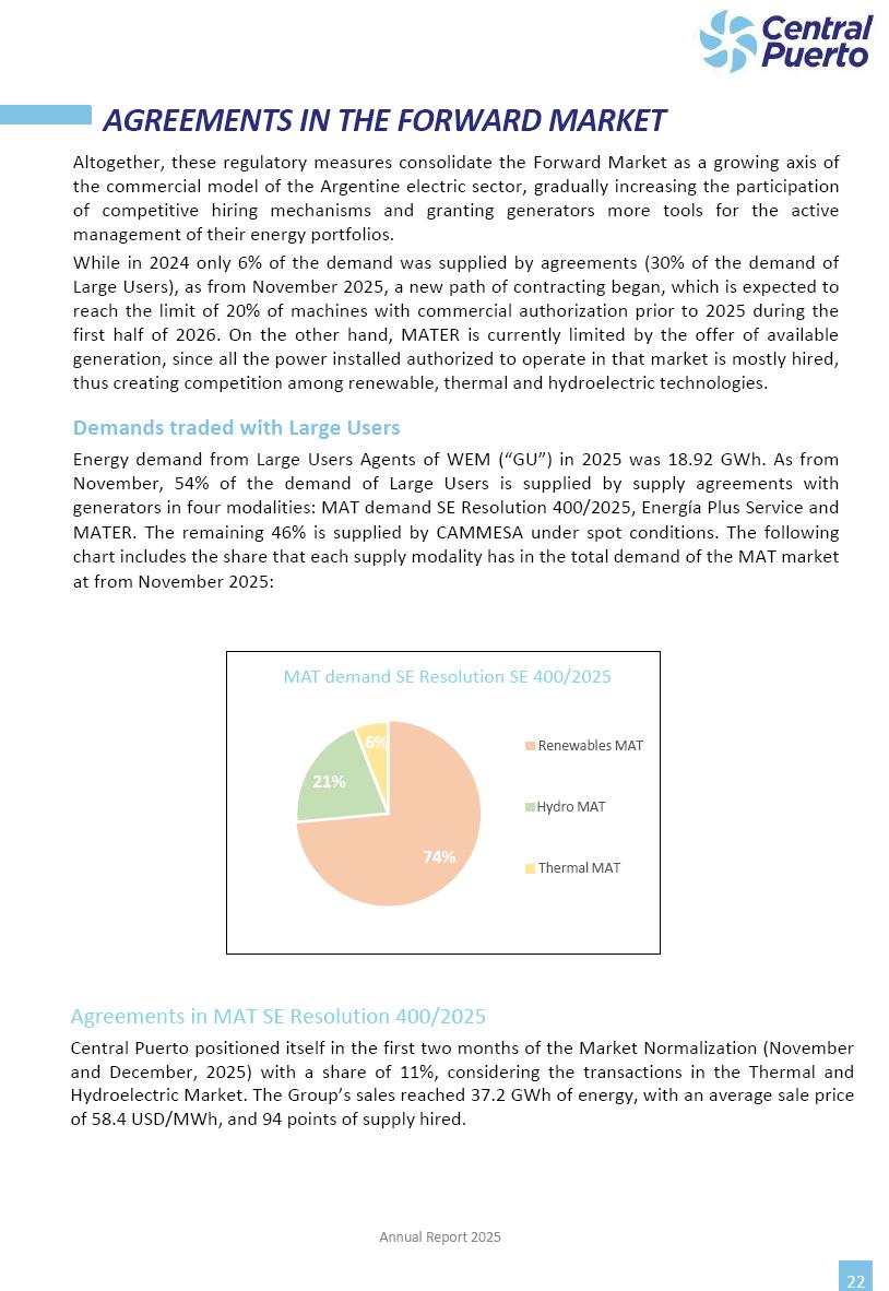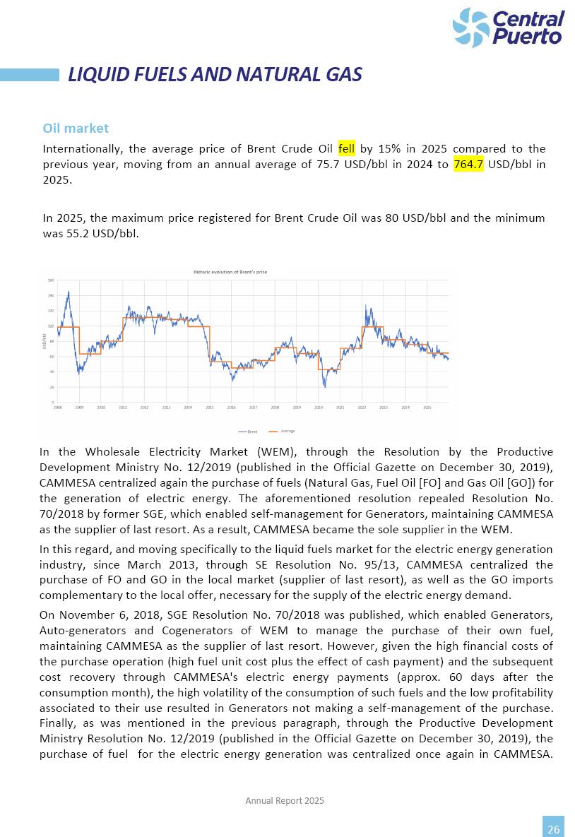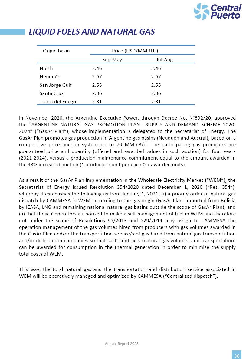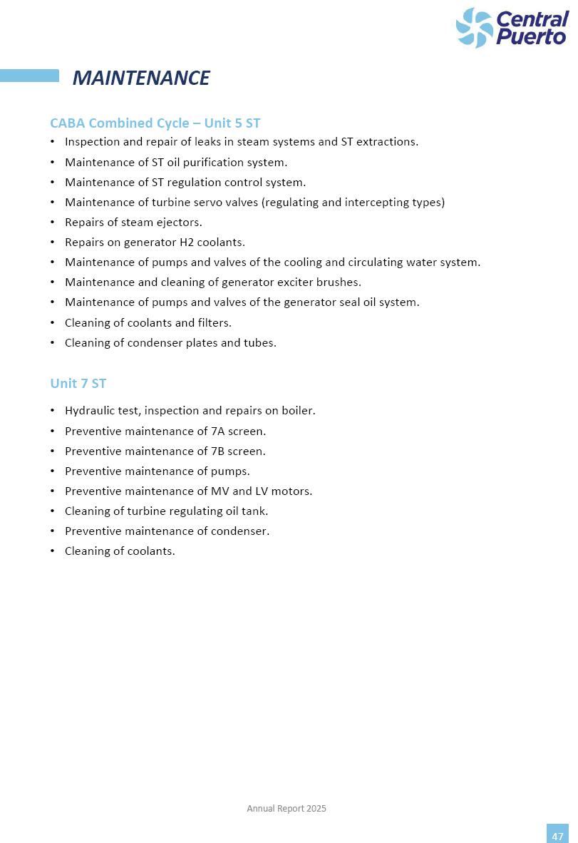 Annual Report Central Puerto December 2025 2 CONTENT 1. Company’s overview Corporate Governance Board of Directors, Statutory Audit Committee and Supervisory Committee Corporate information 2. Macroeconomic context 3. The Argentine Wholesale Electricity Market Trade Agreements in the forward market Liquid fuels and natural gas 4. Maintenance Puerto Nuevo & Nuevo Puerto Site Mendoza Piedra del Águila Site Brigadier López Site San Lorenzo Site – Terminal 6 5. Human Resource 6. Environment, Health & Safety and Quality Commitment Policy Environment Health & Safety Quality 7. Finances General remarks Outlook for the current fiscal year Allocation of fiscal year results Financial performance 01 Company’s overview CORPORATE GOVERNANCE Annual Report 2025 4 Directors Osvaldo Arturo RECA (Chairman) Miguel DODERO (Vice-Chairman) José Luis MOREA Tomás José WHITE Marcelo Atilio SUVA Jorge Eduardo VILLEGAS Martina BLANCO Diego Gustavo PETRACCHI Martín LHEZ Deputy Directors Fernando Roberto BONNET José Manuel ORTIZ Adrián Gustavo SALVATORE Martín OROZCO Mario ELIZALDE José Manuel PAZOS Alejo VILLEGAS Ramón Nazareno ULLOA CORPORATE GOVERNANCE Annual Report 2025 5 STATUTORY AUDIT COMMITTEE Statutory Auditors Carlos César Adolfo HALLADJIAN Eduardo Antonio EROSA Juan Antonio NICHOLSON Deputy Statutory Auditors Carlos Adolfo ZLOTNITZKY Cristina Margarita DE GIORGIO Lucas NICHOLSON SUPERVISORY COMMITTEE Members José Luis MOREA Tomás José WHITE (financial expert) Jorge Eduardo VILLEGAS Deputy members Juan Manuel ORTIZ Mario ELIZALDE Annual Report 2025 6 CORPORATE INFORMATION Central Puerto S.A. (the “Company” or “CPSA”) and the companies that make up the economic group (the “Group”) form an integrated group of companies related to the energy sector, mainly engaged in electric power generation and trade. CPSA was incorporated pursuant to the Executive Power (“PEN”) Decree No. 122/92, in accordance with Law No. 24065, which subjected to total privatization the electricity generation, transportation, distribution and trade in charge of Servicios Eléctricos del Gran Buenos Aires S.A. Our shares are listed on Bolsas y Mercados Argentinos (“BYMA”) and, since February 1, 2018, on the NYSE (“New York Stock Exchange”), under the ticker “CEPU”. The Company has the following assets to conduct its electric power generation activity: THERMAL AND HYDROELECTRIC POWER STATIONS (*) ST 140 MW with Commercial Authorization expected for 2026 Luján de Cuyo Thermal Station has a capacity of 125 tn/h of steam production and Terminal 6 – San Lorenzo Cogeneration Thermal Station has a steam production capacity of 340 tn/h. Annual Report 2025 7 CORPORATE INFORMATION The Company has a total installed capacity of 568.8 MW of commercially-authorized power from renewable sources, which is distributed as follows: RENEWABLE ENERGY FARMS (*) CPSA’s acquisition of the complex in September 2025 (**) Generation is considered from the Commercial Authorization of the farm in November 2025 Annual Report 2025 8 CORPORATE INFORMATION Central Puerto has shareholdings in three thermal companies: INVESTEES Annual Report 2025 9 CORPORATE INFORMATION ✓ On July 19, 2028, Ente Nacional Regulador del Gas (Enargas, Argentine Gas Regulating Entity) registered the Company in the Traders and Trade Agreements Register of Enargas. ✓ The company Puerto Energia S.A.U. (completely controlled by CPSA), was registered as trader of natural gas in the Traders Register of Enargas on March 22, 2024, and on September 20, 2024 its entry as Trader Participant in Wholesale Electricity Market (WEM) was authorized. ✓ On March 31, 2025, CPSA’s Board of Directors approved a corporate reorganization by which, subject to the approval of the Shareholders’ Meetings of the companies involved, CPSA absorbed the assets and liabilities of the subsidiary CPR. Since CPSA owned 100% of CPR’s shares, its equity did not increase as a result of the merger. Subsidiary CPR will be dissolved without liquidation. On May 22, 2025, the corresponding Shareholders’ Meetings approved the corporate reorganization. The merger’s effective date was defined to be October 1, 2025, once all the conditions established in the Merger Final Agreement were met and after the approval of the corporate reorganization by CNV, which occurred on September 10, 2025. ✓ Regarding the mining sector, the Company has a shareholding of: a) 9.9% in AbraSilver Resource Corp. (“AbraSilver”), a company listed on the Canadian Stock Exchange with mining concessions in Argentina, which includes the silver-gold project Diablillos, located in the Northwest area of Argentina, on the limit between the provinces of Salta and Catamarca, and b) 27.5% of the share capital of 3C Lithium Pte. Ltd. (“3C”) (incorporated under the regulations of Singapore), which owns 100% of the share capital of Minera Cordillera S.A., an Argentine company owning the mining rights of the project “Tres Cruces”, located in Catamarca, Argentina. The project “Tres Cruces” involves a recently-discovered lithium deposit, with the aim of developing exploring, drilling and exploitation activities of the mineral. ✓ The Group participates in the forestry sector with assets in the provinces of Entre Ríos and Corrientes, through the following subsidiaries of Proener S.A.U (a company completely owned by CPSA): a) Forestal Argentina S.A., owner of forestry assets consisting of approximately 141,000 hectares in the provinces of Entre Ríos and Corrientes, of which 67,000 hectares are planted with eucalyptus and pine, over a total of 77,500 arable hectares; and b) Loma Alta Forestal S.A., owner of forestry assets consisting of approximately 19,400 hectares in the province of Corrientes, of which approximately 10,400 hectares are planted with pine. Annual Report 2025 10 CORPORATE INFORMATION ✓ Finally, the Group was involved in the natural gas distribution sector in the regions of Cuyo 
