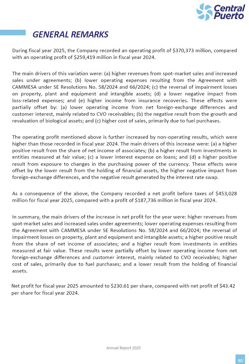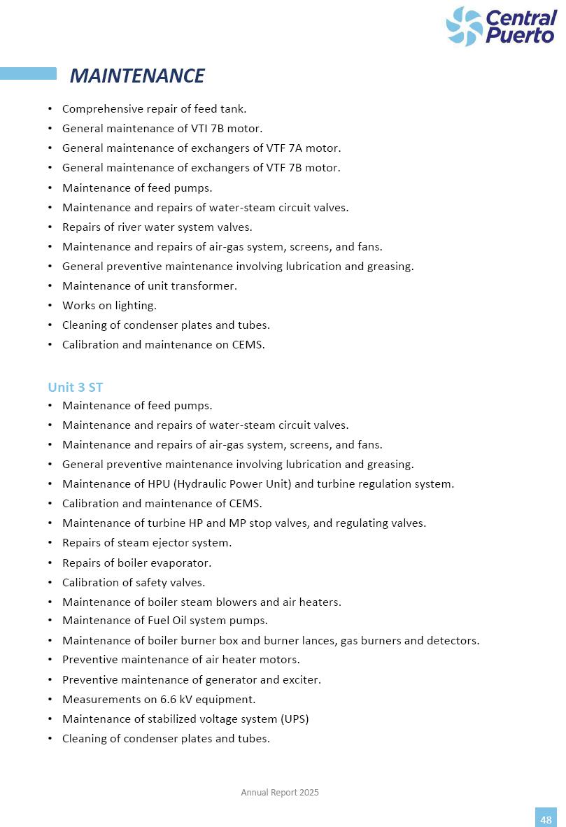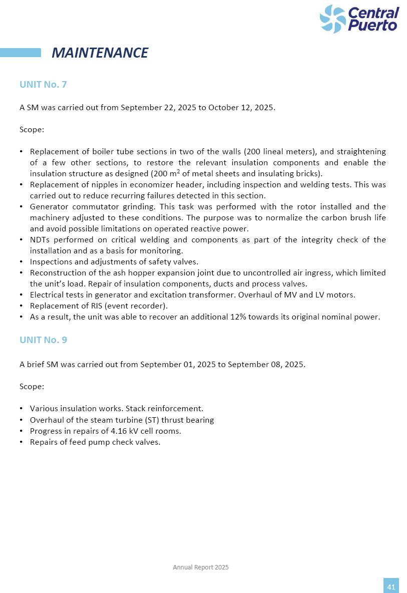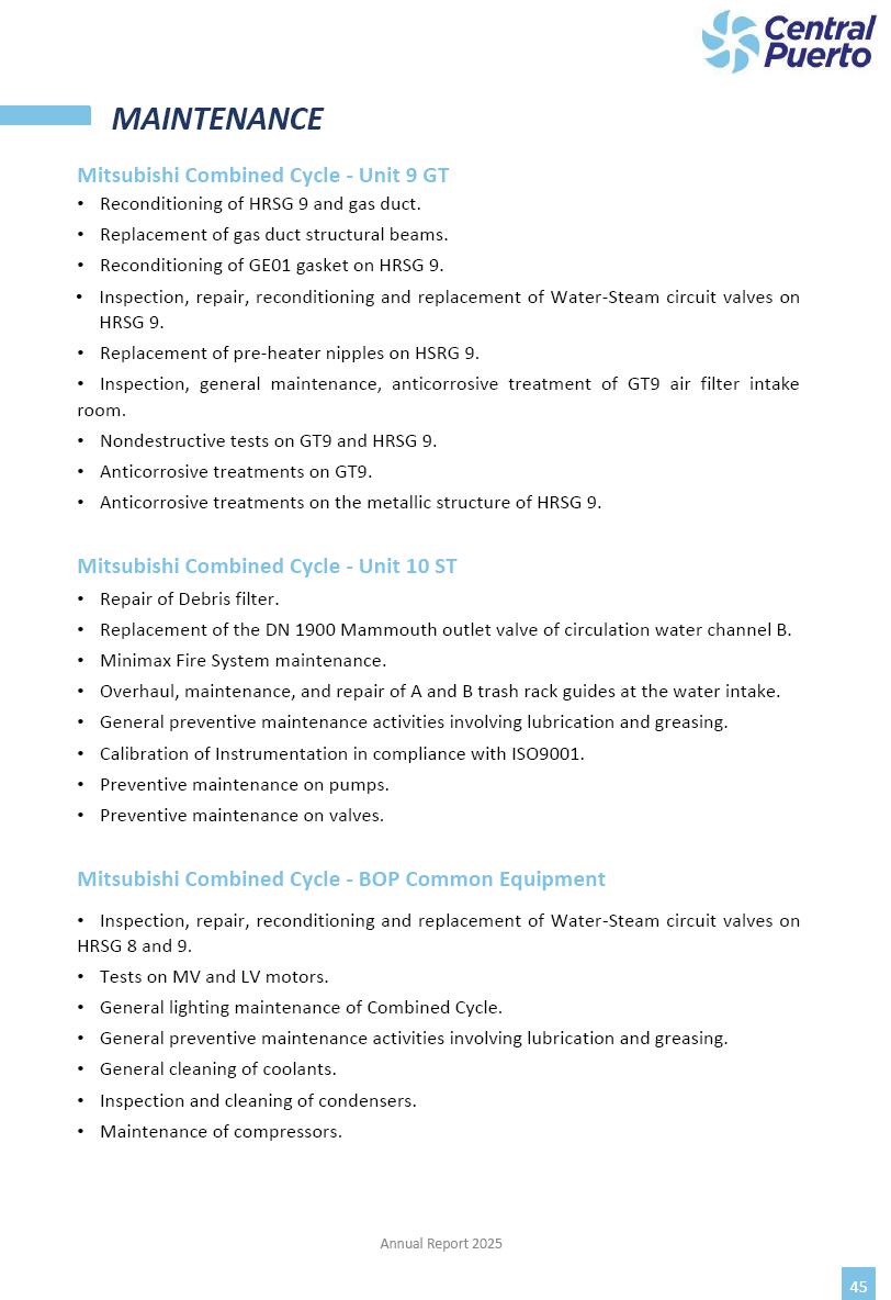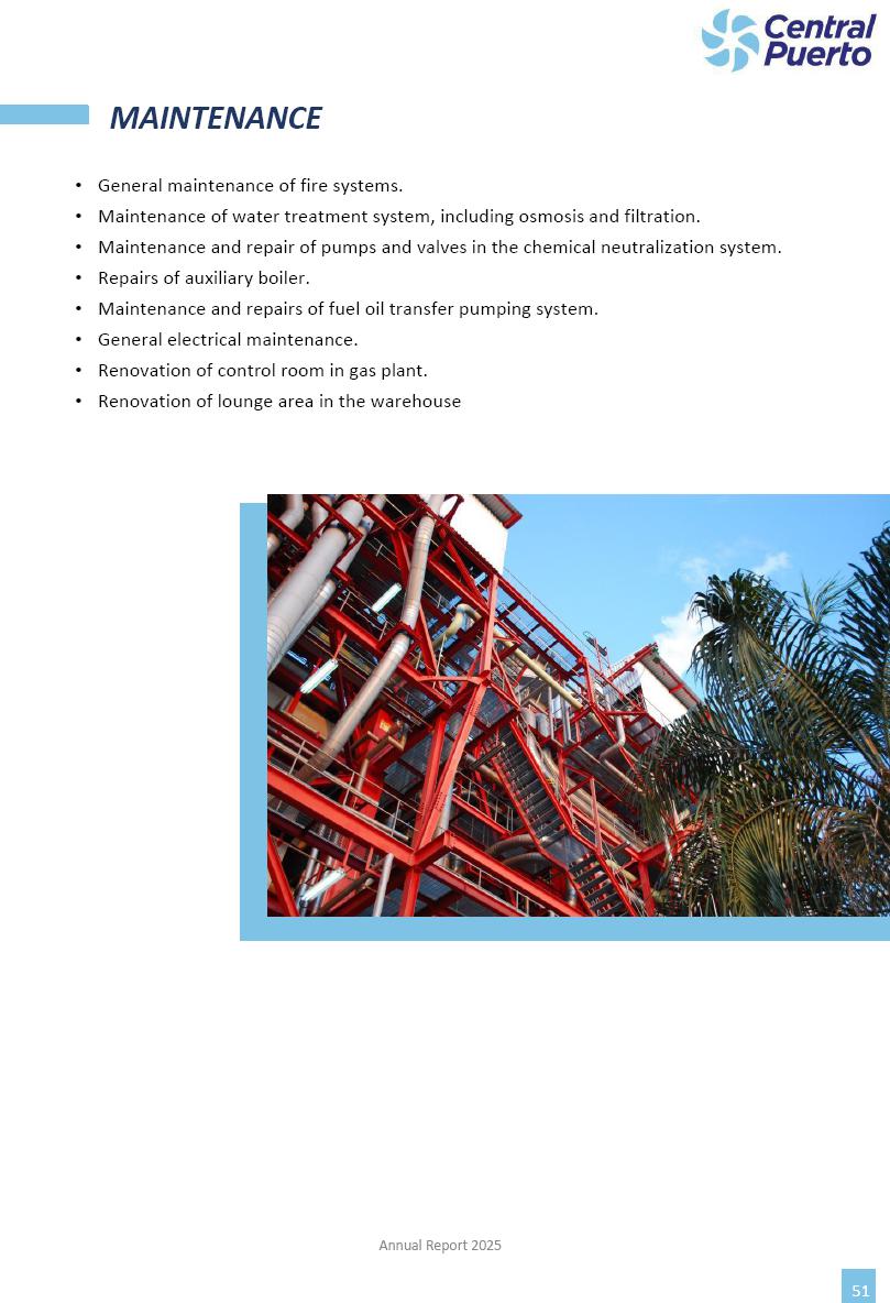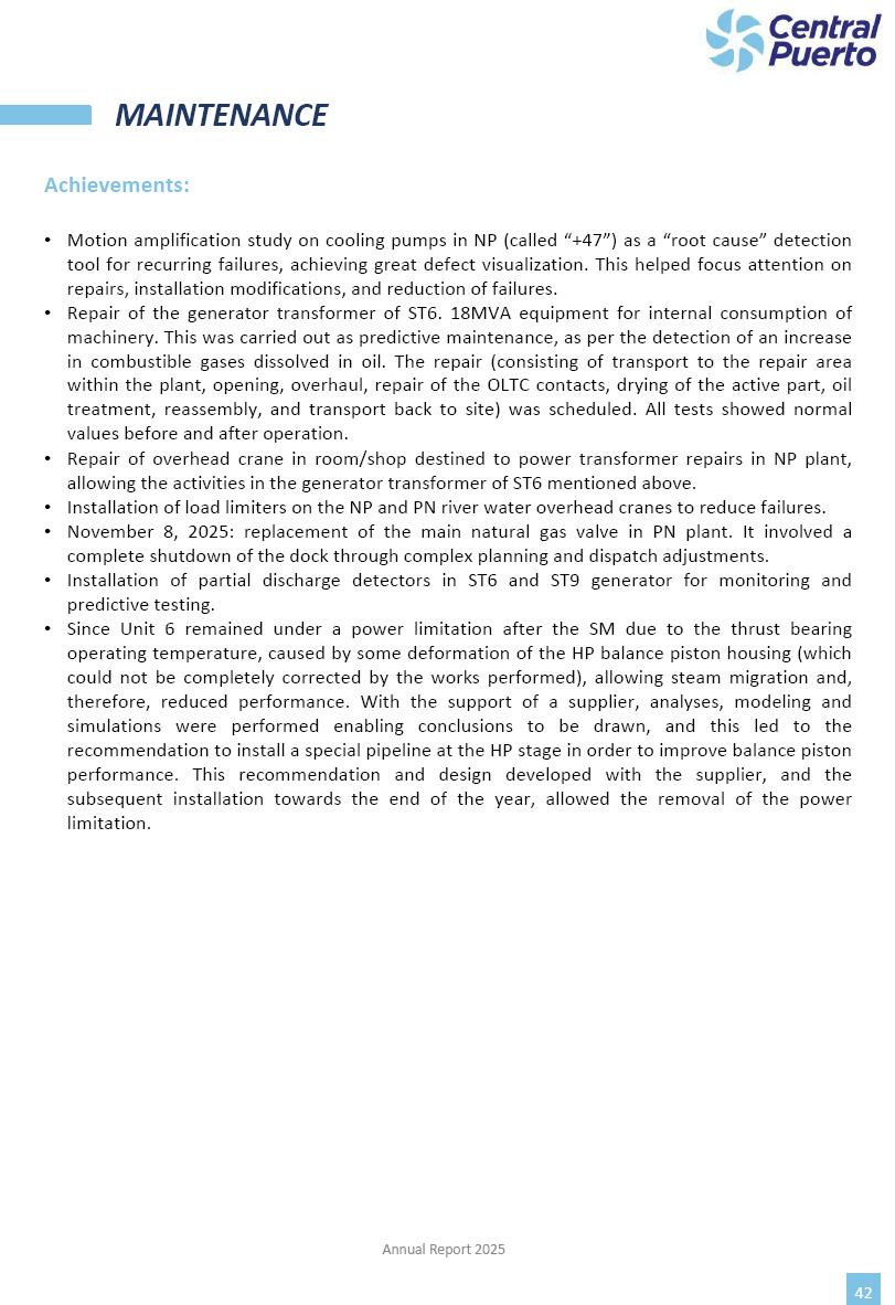 Annual Report Central Puerto December 2025 2 CONTENT 1. Company’s overview Corporate Governance Board of Directors, Statutory Audit Committee and Supervisory Committee Corporate information 2. Macroeconomic context 3. The Argentine Wholesale Electricity Market Trade Agreements in the forward market Liquid fuels and natural gas 4. Maintenance Puerto Nuevo & Nuevo Puerto Site Mendoza Piedra del Águila Site Brigadier López Site San Lorenzo Site – Terminal 6 5. Human Resource 6. Environment, Health & Safety and Quality Commitment Policy Environment Health & Safety Quality 7. Finances General remarks Outlook for the current fiscal year Allocation of fiscal year results Financial performance 01 Company’s overview CORPORATE GOVERNANCE Annual Report 2025 4 Directors Osvaldo Arturo RECA (Chairman) Miguel DODERO (Vice-Chairman) José Luis MOREA Tomás José WHITE Marcelo Atilio SUVA Jorge Eduardo VILLEGAS Martina BLANCO Diego Gustavo PETRACCHI Martín LHEZ Deputy Directors Fernando Roberto BONNET José Manuel ORTIZ Adrián Gustavo SALVATORE Martín OROZCO Mario ELIZALDE José Manuel PAZOS Alejo VILLEGAS Ramón Nazareno ULLOA CORPORATE GOVERNANCE Annual Report 2025 5 STATUTORY AUDIT COMMITTEE Statutory Auditors Carlos César Adolfo HALLADJIAN Eduardo Antonio EROSA Juan Antonio NICHOLSON Deputy Statutory Auditors Carlos Adolfo ZLOTNITZKY Cristina Margarita DE GIORGIO Lucas NICHOLSON SUPERVISORY COMMITTEE Members José Luis MOREA Tomás José WHITE (financial expert) Jorge Eduardo VILLEGAS Deputy members Juan Manuel ORTIZ Mario ELIZALDE Annual Report 2025 6 CORPORATE INFORMATION Central Puerto S.A. (the “Company” or “CPSA”) and the companies that make up the economic group (the “Group”) form an integrated group of companies related to the energy sector, mainly engaged in electric power generation and trade. CPSA was incorporated pursuant to the Executive Power (“PEN”) Decree No. 122/92, in accordance with Law No. 24065, which subjected to total privatization the electricity generation, transportation, distribution and trade in charge of Servicios Eléctricos del Gran Buenos Aires S.A. Our shares are listed on Bolsas y Mercados Argentinos (“BYMA”) and, since February 1, 2018, on the NYSE (“New York Stock Exchange”), under the ticker “CEPU”. The Company has the following assets to conduct its electric power generation activity: THERMAL AND HYDROELECTRIC POWER STATIONS (*) ST 140 MW with Commercial Authorization expected for 2026 Luján de Cuyo Thermal Station has a capacity of 125 tn/h of steam production and Terminal 6 – San Lorenzo Cogeneration Thermal Station has a steam production capacity of 340 tn/h. Annual Report 2025 7 CORPORATE INFORMATION The Company has a total installed capacity of 568.8 MW of commercially-authorized power from renewable sources, which is distributed as follows: RENEWABLE ENERGY FARMS (*) CPSA’s acquisition of the complex in September 2025 (**) Generation is considered from the Commercial Authorization of the farm in November 2025 Annual Report 2025 8 CORPORATE INFORMATION Central Puerto has shareholdings in three thermal companies: INVESTEES Annual Report 2025 9 CORPORATE INFORMATION ✓ On July 19, 2028, Ente Nacional Regulador del Gas (Enargas, Argentine Gas Regulating Entity) registered the Company in the Traders and Trade Agreements Register of Enargas. ✓ The company Puerto Energia S.A.U. (completely controlled by CPSA), was registered as trader of natural gas in the Traders Register of Enargas on March 22, 2024, and on September 20, 2024 its entry as Trader Participant in Wholesale Electricity Market (WEM) was authorized. ✓ On March 31, 2025, CPSA’s Board of Directors approved a corporate reorganization by which, subject to the approval of the Shareholders’ Meetings of the companies involved, CPSA absorbed the assets and liabilities of the subsidiary CPR. Since CPSA owned 100% of CPR’s shares, its equity did not increase as a result of the merger. Subsidiary CPR will be dissolved without liquidation. On May 22, 2025, the corresponding Shareholders’ Meetings approved the corporate reorganization. The merger’s effective date was defined to be October 1, 2025, once all the conditions established in the Merger Final Agreement were met and after the approval of the corporate reorganization by CNV, which occurred on September 10, 2025. ✓ Regarding the mining sector, the Company has a shareholding of: a) 9.9% in AbraSilver Resource Corp. (“AbraSilver”), a company listed on the Canadian Stock Exchange with mining concessions in Argentina, which includes the silver-gold project Diablillos, located in the Northwest area of Argentina, on the limit between the provinces of Salta and Catamarca, and b) 27.5% of the share capital of 3C Lithium Pte. Ltd. (“3C”) (incorporated under the regulations of Singapore), which owns 100% of the share capital of Minera Cordillera S.A., an Argentine company owning the mining rights of the project “Tres Cruces”, located in Catamarca, Argentina. The project “Tres Cruces” involves a recently-discovered lithium deposit, with the aim of developing exploring, drilling and exploitation activities of the mineral. ✓ The Group participates in the forestry sector with assets in the provinces of Entre Ríos and Corrientes, through the following subsidiaries of Proener S.A.U (a company completely owned by CPSA): a) Forestal Argentina S.A., owner of forestry assets consisting of approximately 141,000 hectares in the provinces of Entre Ríos and Corrientes, of which 67,000 hectares are planted with eucalyptus and pine, over a total of 77,500 arable hectares; and b) Loma Alta Forestal S.A., owner of forestry assets consisting of approximately 19,400 hectares in the province of Corrientes, of which approximately 10,400 hectares are planted with pine. Annual Report 2025 10 CORPORATE INFORMATION ✓ Finally, the Group was involved in the natural gas distribution sector in the regions of Cuyo 