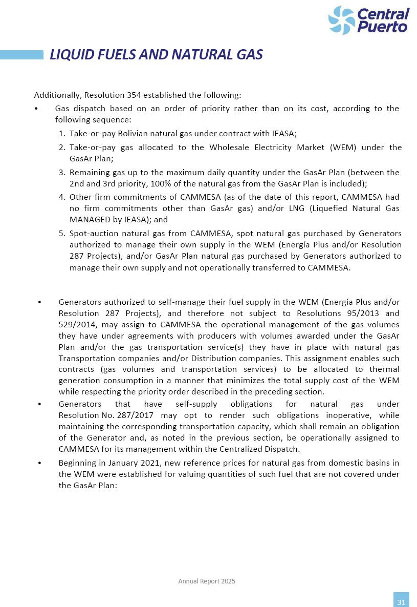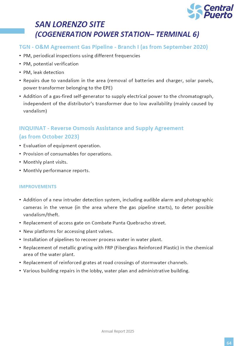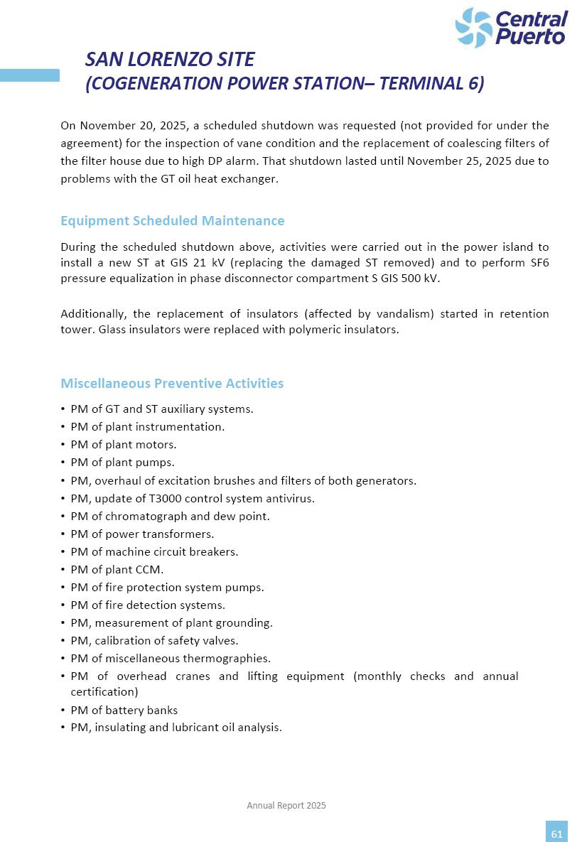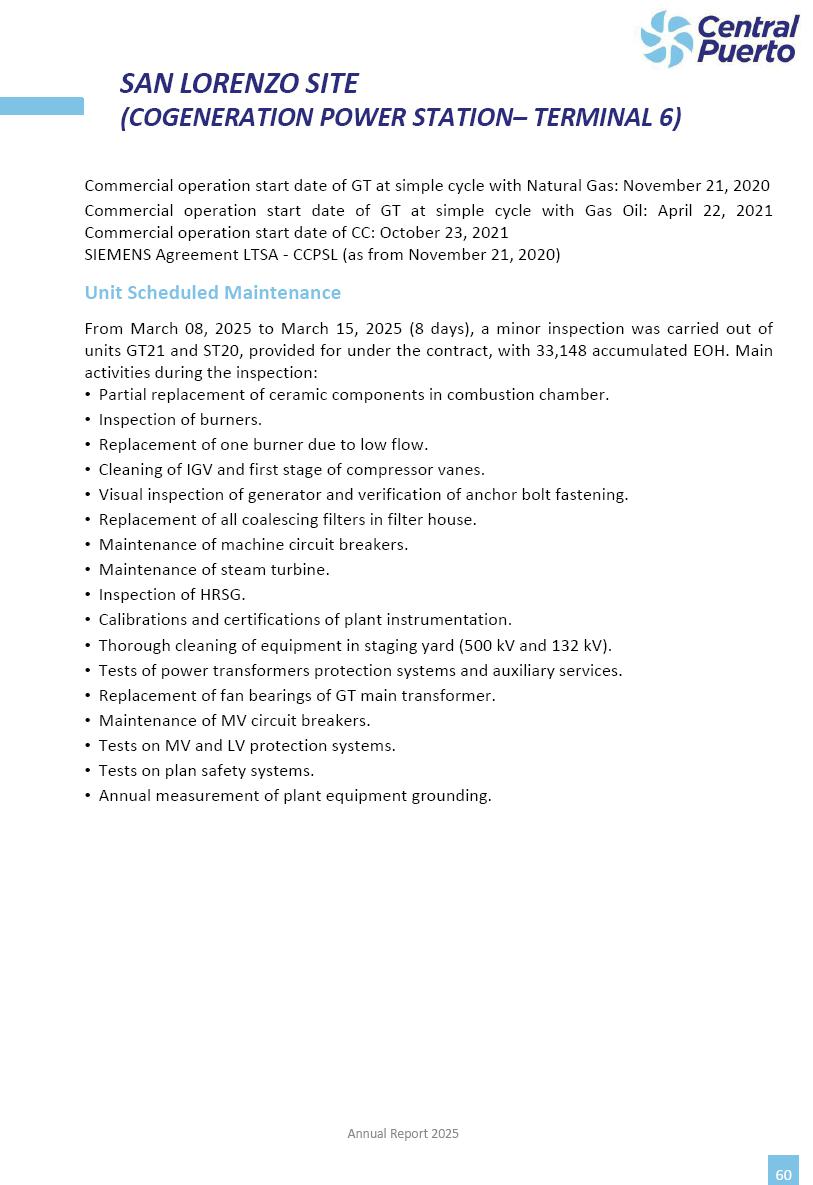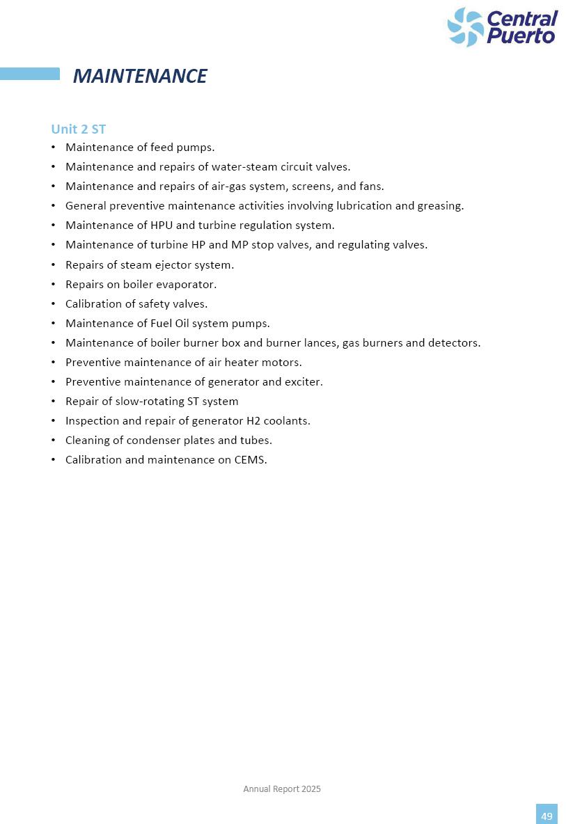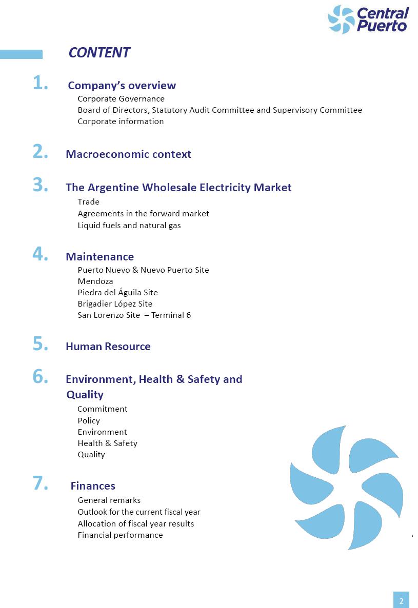Annual Report Central Puerto December 2025 2 CONTENT 1. Company’s overview Corporate Governance Board of Directors, Statutory Audit Committee and Supervisory Committee Corporate information 2. Macroeconomic context 3. The Argentine Wholesale Electricity Market Trade Agreements in the forward market Liquid fuels and natural gas 4. Maintenance Puerto Nuevo & Nuevo Puerto Site Mendoza Piedra del Águila Site Brigadier López Site San Lorenzo Site – Terminal 6 5. Human Resource 6. Environment, Health & Safety and Quality Commitment Policy Environment Health & Safety Quality 7. Finances General remarks Outlook for the current fiscal year Allocation of fiscal year results Financial performance 01 Company’s overview CORPORATE GOVERNANCE Annual Report 2025 4 Directors Osvaldo Arturo RECA (Chairman) Miguel DODERO (Vice-Chairman) José Luis MOREA Tomás José WHITE Marcelo Atilio SUVA Jorge Eduardo VILLEGAS Martina BLANCO Diego Gustavo PETRACCHI Martín LHEZ Deputy Directors Fernando Roberto BONNET José Manuel ORTIZ Adrián Gustavo SALVATORE Martín OROZCO Mario ELIZALDE José Manuel PAZOS Alejo VILLEGAS Ramón Nazareno ULLOA CORPORATE GOVERNANCE Annual Report 2025 5 STATUTORY AUDIT COMMITTEE Statutory Auditors Carlos César Adolfo HALLADJIAN Eduardo Antonio EROSA Juan Antonio NICHOLSON Deputy Statutory Auditors Carlos Adolfo ZLOTNITZKY Cristina Margarita DE GIORGIO Lucas NICHOLSON SUPERVISORY COMMITTEE Members José Luis MOREA Tomás José WHITE (financial expert) Jorge Eduardo VILLEGAS Deputy members Juan Manuel ORTIZ Mario ELIZALDE Annual Report 2025 6 CORPORATE INFORMATION Central Puerto S.A. (the “Company” or “CPSA”) and the companies that make up the economic group (the “Group”) form an integrated group of companies related to the energy sector, mainly engaged in electric power generation and trade. CPSA was incorporated pursuant to the Executive Power (“PEN”) Decree No. 122/92, in accordance with Law No. 24065, which subjected to total privatization the electricity generation, transportation, distribution and trade in charge of Servicios Eléctricos del Gran Buenos Aires S.A. Our shares are listed on Bolsas y Mercados Argentinos (“BYMA”) and, since February 1, 2018, on the NYSE (“New York Stock Exchange”), under the ticker “CEPU”. The Company has the following assets to conduct its electric power generation activity: THERMAL AND HYDROELECTRIC POWER STATIONS (*) ST 140 MW with Commercial Authorization expected for 2026 Luján de Cuyo Thermal Station has a capacity of 125 tn/h of steam production and Terminal 6 – San Lorenzo Cogeneration Thermal Station has a steam production capacity of 340 tn/h. Annual Report 2025 7 CORPORATE INFORMATION The Company has a total installed capacity of 568.8 MW of commercially-authorized power from renewable sources, which is distributed as follows: RENEWABLE ENERGY FARMS (*) CPSA’s acquisition of the complex in September 2025 (**) Generation is considered from the Commercial Authorization of the farm in November 2025 Annual Report 2025 8 CORPORATE INFORMATION Central Puerto has shareholdings in three thermal companies: INVESTEES Annual Report 2025 9 CORPORATE INFORMATION ✓ On July 19, 2028, Ente Nacional Regulador del Gas (Enargas, Argentine Gas Regulating Entity) registered the Company in the Traders and Trade Agreements Register of Enargas. ✓ The company Puerto Energia S.A.U. (completely controlled by CPSA), was registered as trader of natural gas in the Traders Register of Enargas on March 22, 2024, and on September 20, 2024 its entry as Trader Participant in Wholesale Electricity Market (WEM) was authorized. ✓ On March 31, 2025, CPSA’s Board of Directors approved a corporate reorganization by which, subject to the approval of the Shareholders’ Meetings of the companies involved, CPSA absorbed the assets and liabilities of the subsidiary CPR. Since CPSA owned 100% of CPR’s shares, its equity did not increase as a result of the merger. Subsidiary CPR will be dissolved without liquidation. On May 22, 2025, the corresponding Shareholders’ Meetings approved the corporate reorganization. The merger’s effective date was defined to be October 1, 2025, once all the conditions established in the Merger Final Agreement were met and after the approval of the corporate reorganization by CNV, which occurred on September 10, 2025. ✓ Regarding the mining sector, the Company has a shareholding of: a) 9.9% in AbraSilver Resource Corp. (“AbraSilver”), a company listed on the Canadian Stock Exchange with mining concessions in Argentina, which includes the silver-gold project Diablillos, located in the Northwest area of Argentina, on the limit between the provinces of Salta and Catamarca, and b) 27.5% of the share capital of 3C Lithium Pte. Ltd. (“3C”) (incorporated under the regulations of Singapore), which owns 100% of the share capital of Minera Cordillera S.A., an Argentine company owning the mining rights of the project “Tres Cruces”, located in Catamarca, Argentina. The project “Tres Cruces” involves a recently-discovered lithium deposit, with the aim of developing exploring, drilling and exploitation activities of the mineral. ✓ The Group participates in the forestry sector with assets in the provinces of Entre Ríos and Corrientes, through the following subsidiaries of Proener S.A.U (a company completely owned by CPSA): a) Forestal Argentina S.A., owner of forestry assets consisting of approximately 141,000 hectares in the provinces of Entre Ríos and Corrientes, of which 67,000 hectares are planted with eucalyptus and pine, over a total of 77,500 arable hectares; and b) Loma Alta Forestal S.A., owner of forestry assets consisting of approximately 19,400 hectares in the province of Corrientes, of which approximately 10,400 hectares are planted with pine. Annual Report 2025 10 CORPORATE INFORMATION ✓ Finally, the Group was involved in the natural gas distribution sector in the regions of Cuyo 