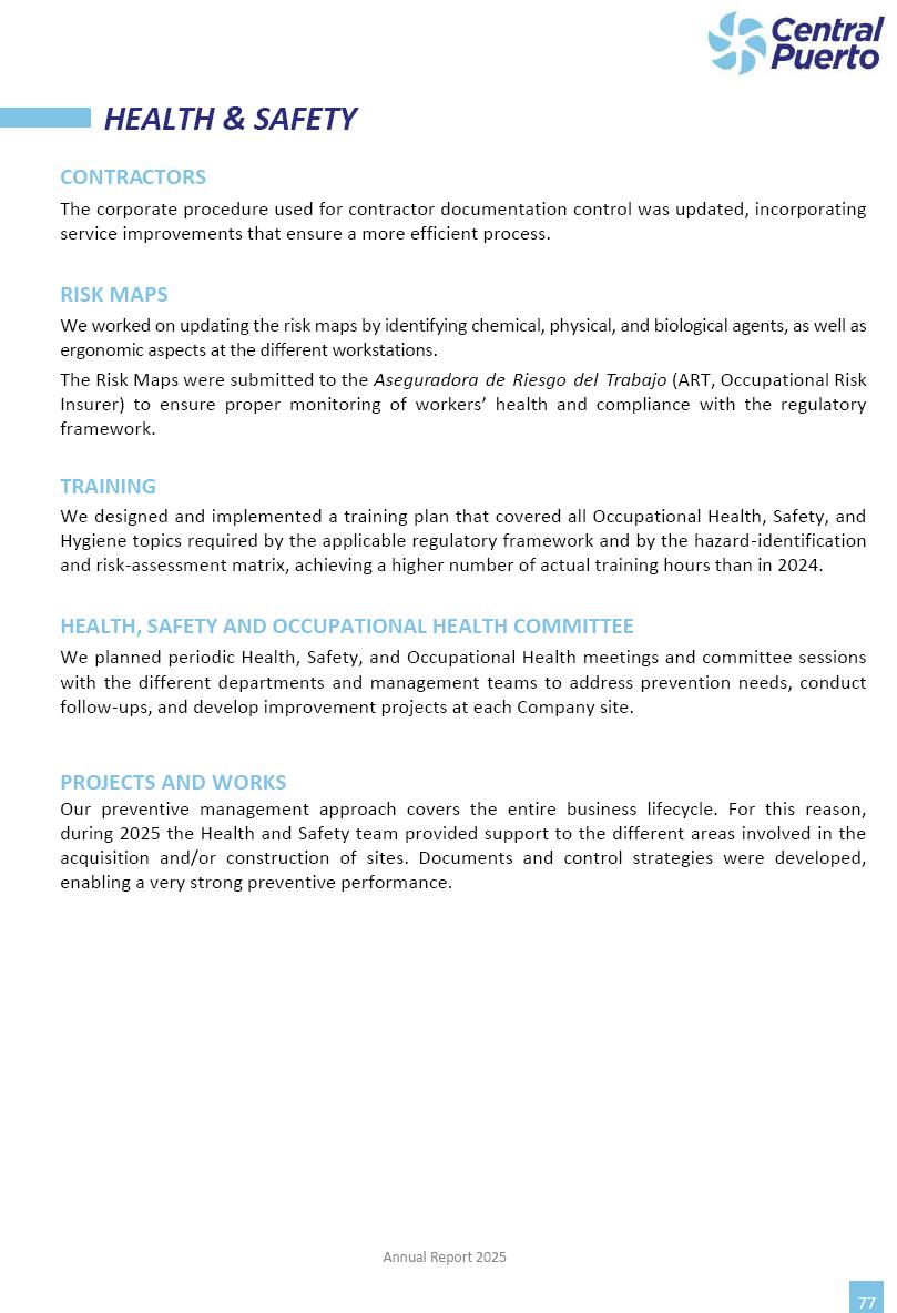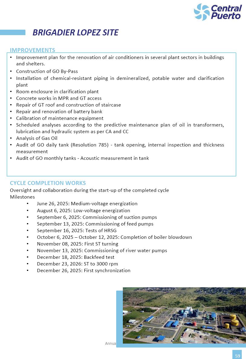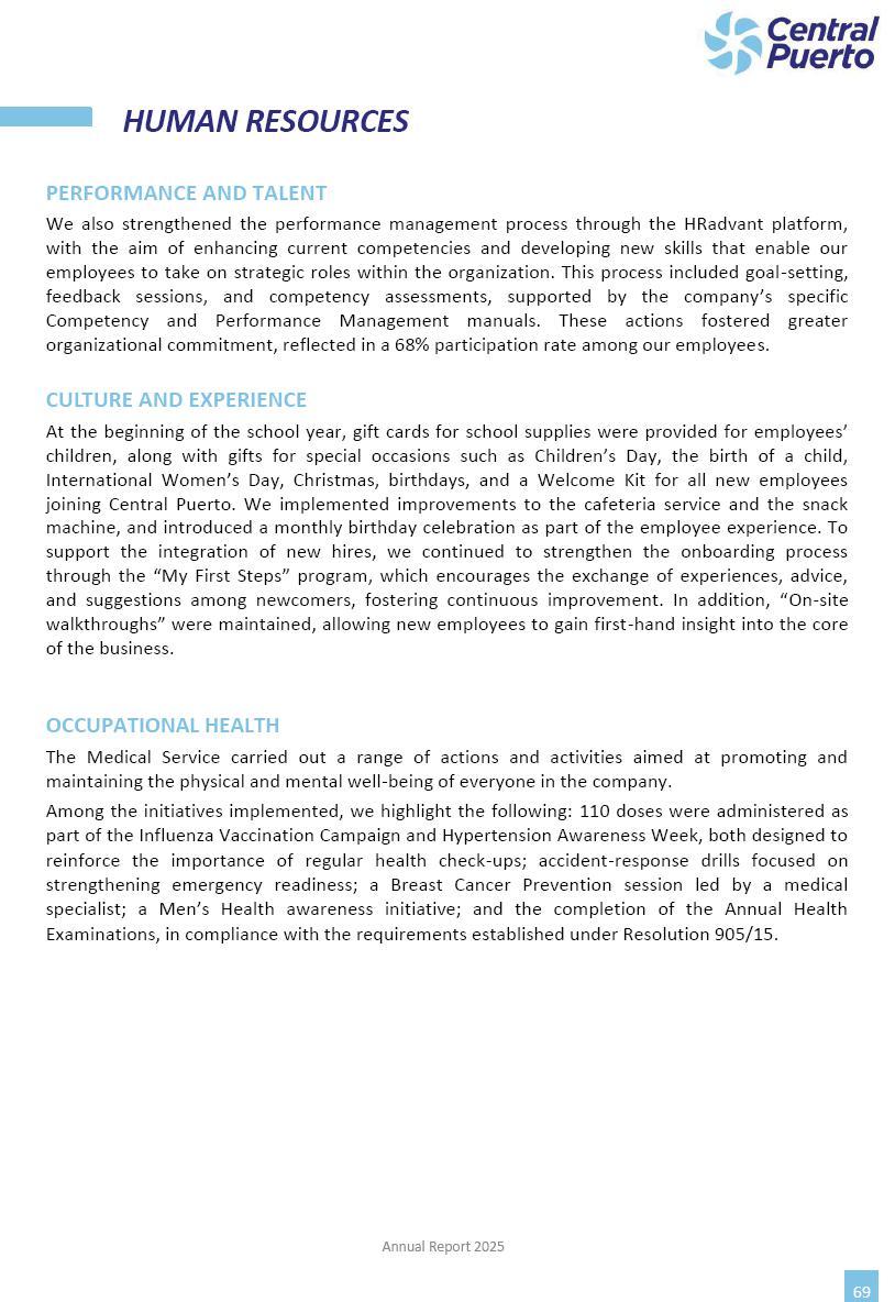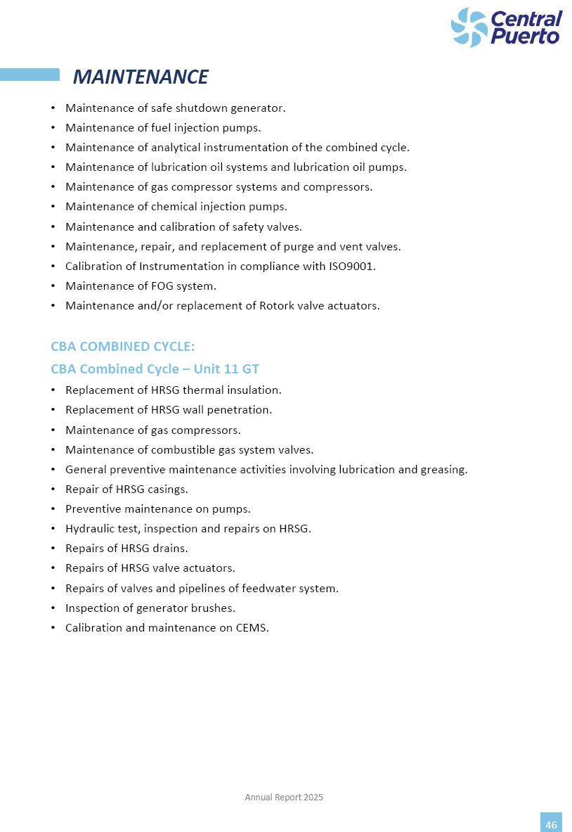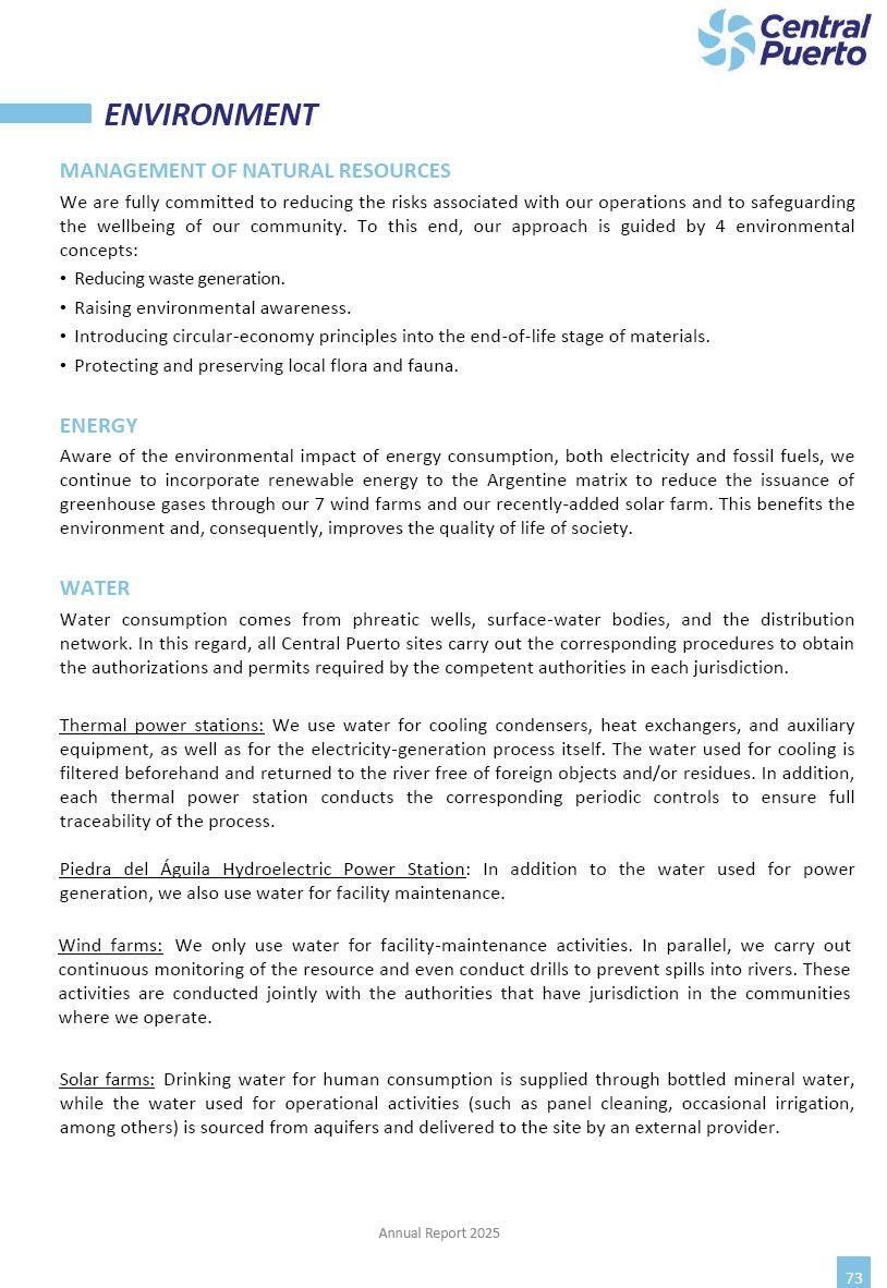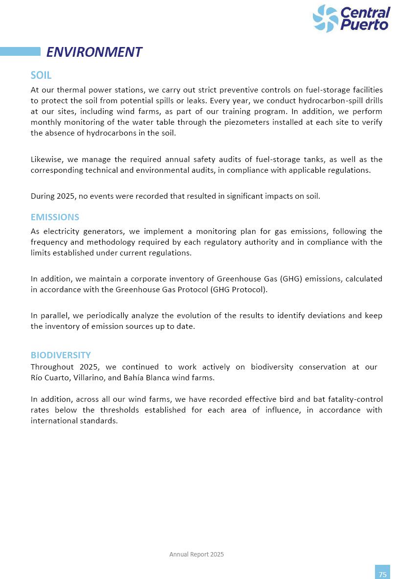 Annual Report Central Puerto December 2025 2 CONTENT 1. Company’s overview Corporate Governance Board of Directors, Statutory Audit Committee and Supervisory Committee Corporate information 2. Macroeconomic context 3. The Argentine Wholesale Electricity Market Trade Agreements in the forward market Liquid fuels and natural gas 4. Maintenance Puerto Nuevo & Nuevo Puerto Site Mendoza Piedra del Águila Site Brigadier López Site San Lorenzo Site – Terminal 6 5. Human Resource 6. Environment, Health & Safety and Quality Commitment Policy Environment Health & Safety Quality 7. Finances General remarks Outlook for the current fiscal year Allocation of fiscal year results Financial performance 01 Company’s overview CORPORATE GOVERNANCE Annual Report 2025 4 Directors Osvaldo Arturo RECA (Chairman) Miguel DODERO (Vice-Chairman) José Luis MOREA Tomás José WHITE Marcelo Atilio SUVA Jorge Eduardo VILLEGAS Martina BLANCO Diego Gustavo PETRACCHI Martín LHEZ Deputy Directors Fernando Roberto BONNET José Manuel ORTIZ Adrián Gustavo SALVATORE Martín OROZCO Mario ELIZALDE José Manuel PAZOS Alejo VILLEGAS Ramón Nazareno ULLOA CORPORATE GOVERNANCE Annual Report 2025 5 STATUTORY AUDIT COMMITTEE Statutory Auditors Carlos César Adolfo HALLADJIAN Eduardo Antonio EROSA Juan Antonio NICHOLSON Deputy Statutory Auditors Carlos Adolfo ZLOTNITZKY Cristina Margarita DE GIORGIO Lucas NICHOLSON SUPERVISORY COMMITTEE Members José Luis MOREA Tomás José WHITE (financial expert) Jorge Eduardo VILLEGAS Deputy members Juan Manuel ORTIZ Mario ELIZALDE Annual Report 2025 6 CORPORATE INFORMATION Central Puerto S.A. (the “Company” or “CPSA”) and the companies that make up the economic group (the “Group”) form an integrated group of companies related to the energy sector, mainly engaged in electric power generation and trade. CPSA was incorporated pursuant to the Executive Power (“PEN”) Decree No. 122/92, in accordance with Law No. 24065, which subjected to total privatization the electricity generation, transportation, distribution and trade in charge of Servicios Eléctricos del Gran Buenos Aires S.A. Our shares are listed on Bolsas y Mercados Argentinos (“BYMA”) and, since February 1, 2018, on the NYSE (“New York Stock Exchange”), under the ticker “CEPU”. The Company has the following assets to conduct its electric power generation activity: THERMAL AND HYDROELECTRIC POWER STATIONS (*) ST 140 MW with Commercial Authorization expected for 2026 Luján de Cuyo Thermal Station has a capacity of 125 tn/h of steam production and Terminal 6 – San Lorenzo Cogeneration Thermal Station has a steam production capacity of 340 tn/h. Annual Report 2025 7 CORPORATE INFORMATION The Company has a total installed capacity of 568.8 MW of commercially-authorized power from renewable sources, which is distributed as follows: RENEWABLE ENERGY FARMS (*) CPSA’s acquisition of the complex in September 2025 (**) Generation is considered from the Commercial Authorization of the farm in November 2025 Annual Report 2025 8 CORPORATE INFORMATION Central Puerto has shareholdings in three thermal companies: INVESTEES Annual Report 2025 9 CORPORATE INFORMATION ✓ On July 19, 2028, Ente Nacional Regulador del Gas (Enargas, Argentine Gas Regulating Entity) registered the Company in the Traders and Trade Agreements Register of Enargas. ✓ The company Puerto Energia S.A.U. (completely controlled by CPSA), was registered as trader of natural gas in the Traders Register of Enargas on March 22, 2024, and on September 20, 2024 its entry as Trader Participant in Wholesale Electricity Market (WEM) was authorized. ✓ On March 31, 2025, CPSA’s Board of Directors approved a corporate reorganization by which, subject to the approval of the Shareholders’ Meetings of the companies involved, CPSA absorbed the assets and liabilities of the subsidiary CPR. Since CPSA owned 100% of CPR’s shares, its equity did not increase as a result of the merger. Subsidiary CPR will be dissolved without liquidation. On May 22, 2025, the corresponding Shareholders’ Meetings approved the corporate reorganization. The merger’s effective date was defined to be October 1, 2025, once all the conditions established in the Merger Final Agreement were met and after the approval of the corporate reorganization by CNV, which occurred on September 10, 2025. ✓ Regarding the mining sector, the Company has a shareholding of: a) 9.9% in AbraSilver Resource Corp. (“AbraSilver”), a company listed on the Canadian Stock Exchange with mining concessions in Argentina, which includes the silver-gold project Diablillos, located in the Northwest area of Argentina, on the limit between the provinces of Salta and Catamarca, and b) 27.5% of the share capital of 3C Lithium Pte. Ltd. (“3C”) (incorporated under the regulations of Singapore), which owns 100% of the share capital of Minera Cordillera S.A., an Argentine company owning the mining rights of the project “Tres Cruces”, located in Catamarca, Argentina. The project “Tres Cruces” involves a recently-discovered lithium deposit, with the aim of developing exploring, drilling and exploitation activities of the mineral. ✓ The Group participates in the forestry sector with assets in the provinces of Entre Ríos and Corrientes, through the following subsidiaries of Proener S.A.U (a company completely owned by CPSA): a) Forestal Argentina S.A., owner of forestry assets consisting of approximately 141,000 hectares in the provinces of Entre Ríos and Corrientes, of which 67,000 hectares are planted with eucalyptus and pine, over a total of 77,500 arable hectares; and b) Loma Alta Forestal S.A., owner of forestry assets consisting of approximately 19,400 hectares in the province of Corrientes, of which approximately 10,400 hectares are planted with pine. Annual Report 2025 10 CORPORATE INFORMATION ✓ Finally, the Group was involved in the natural gas distribution sector in the regions of Cuyo 