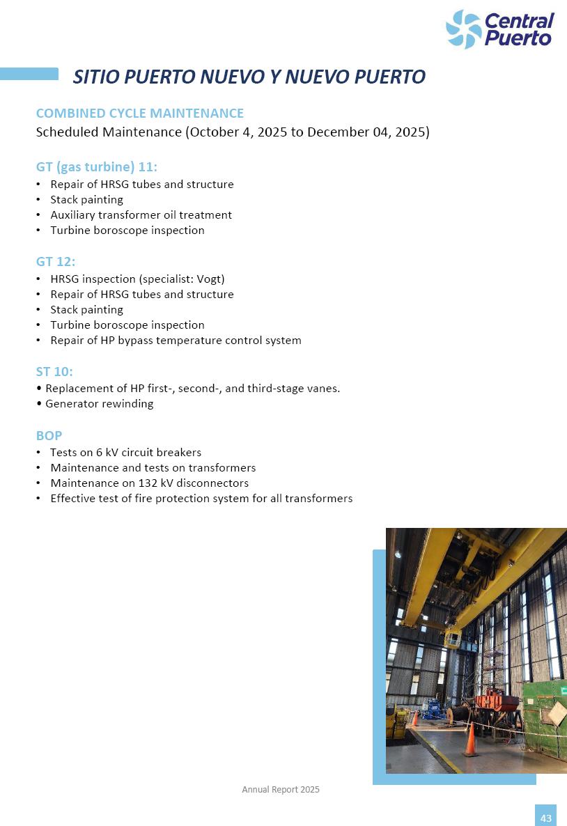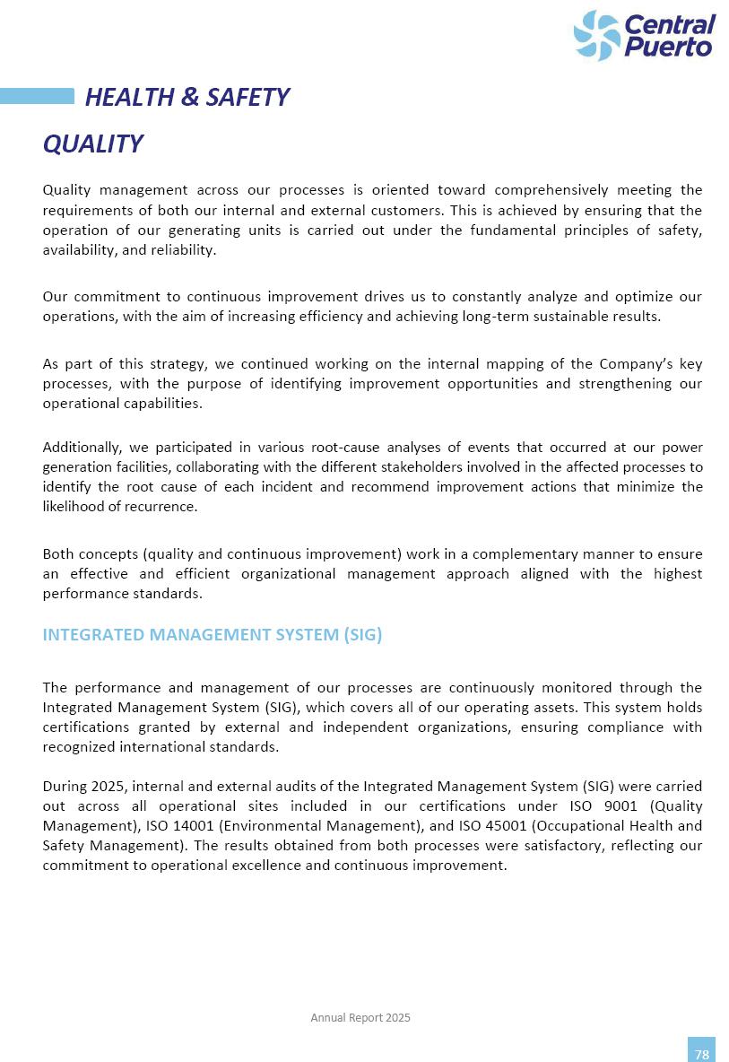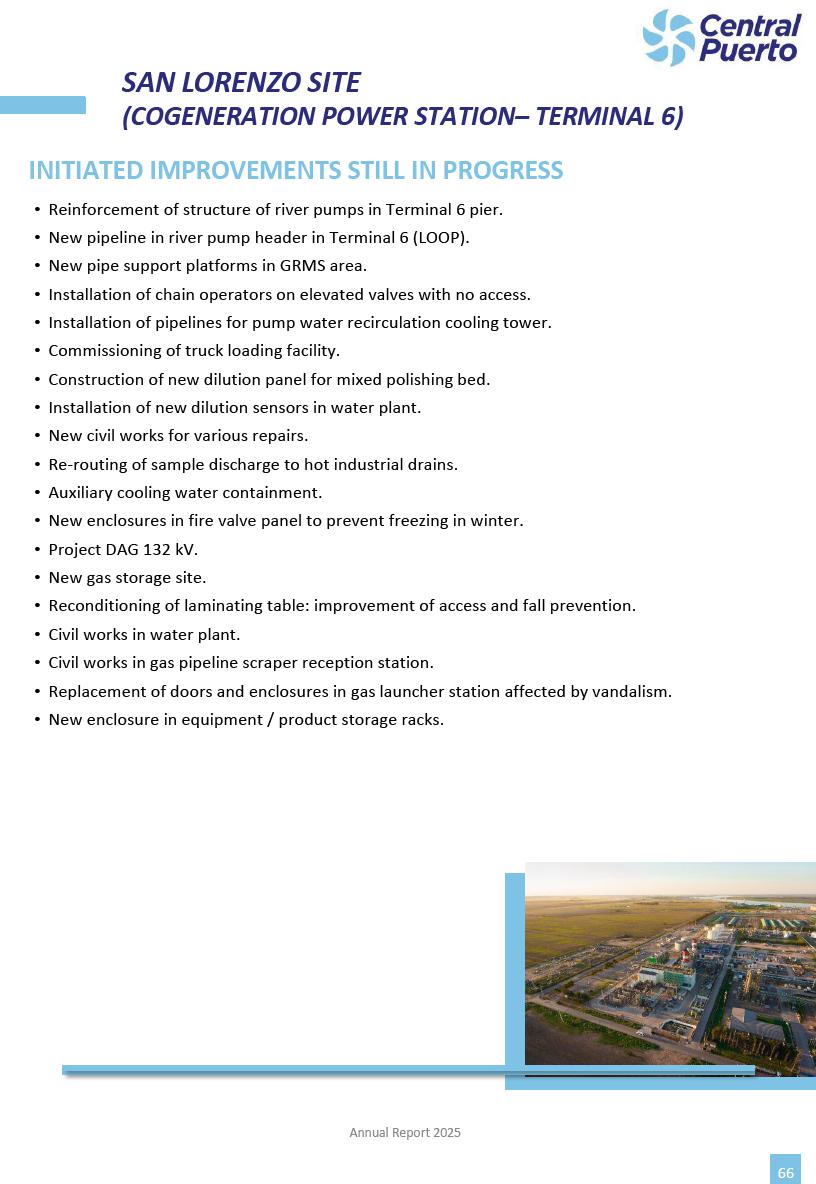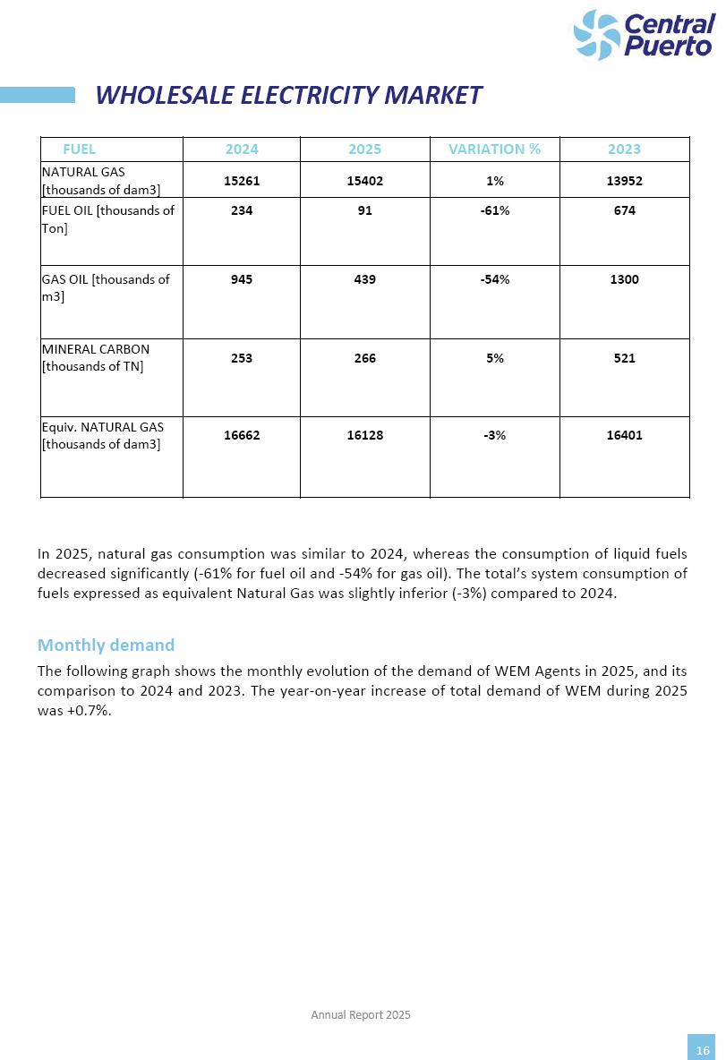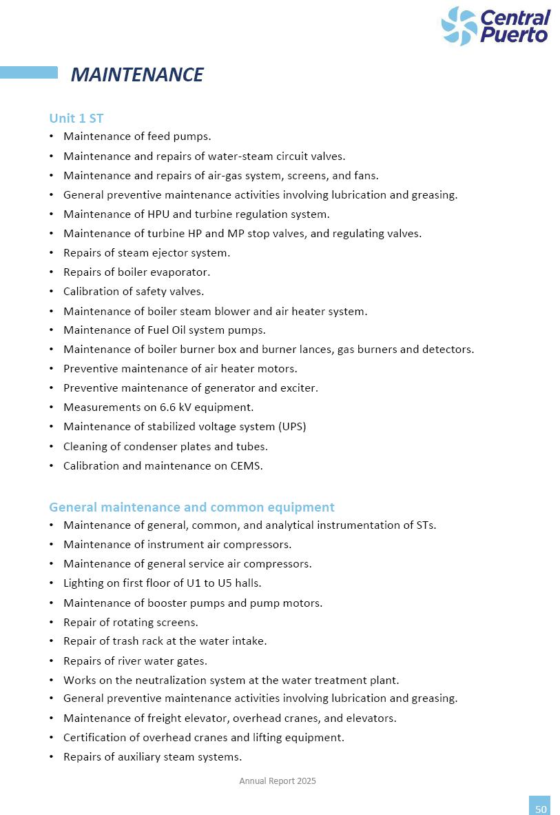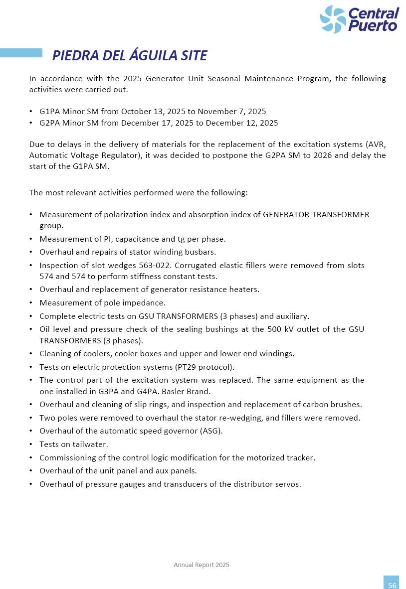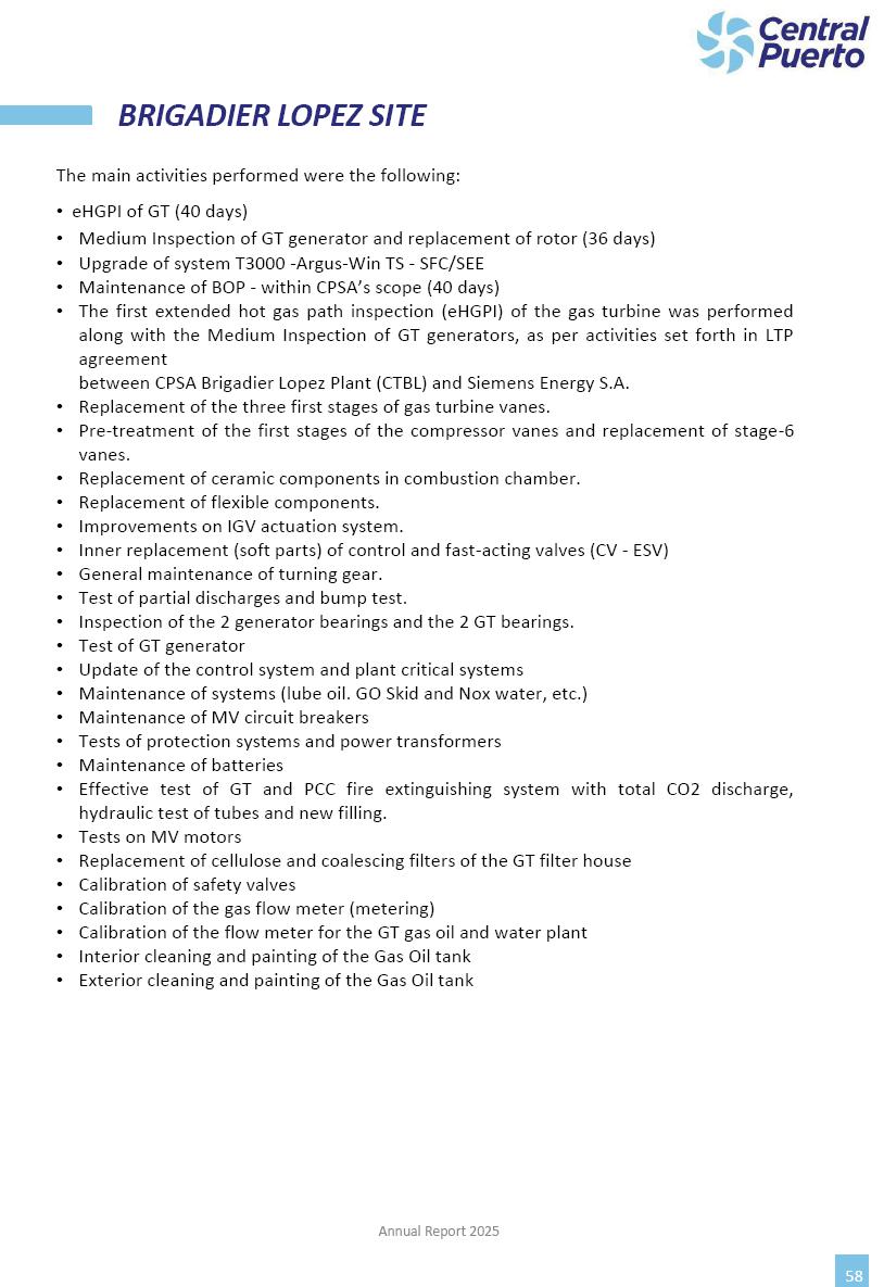 Annual Report Central Puerto December 2025 2 CONTENT 1. Company’s overview Corporate Governance Board of Directors, Statutory Audit Committee and Supervisory Committee Corporate information 2. Macroeconomic context 3. The Argentine Wholesale Electricity Market Trade Agreements in the forward market Liquid fuels and natural gas 4. Maintenance Puerto Nuevo & Nuevo Puerto Site Mendoza Piedra del Águila Site Brigadier López Site San Lorenzo Site – Terminal 6 5. Human Resource 6. Environment, Health & Safety and Quality Commitment Policy Environment Health & Safety Quality 7. Finances General remarks Outlook for the current fiscal year Allocation of fiscal year results Financial performance 01 Company’s overview CORPORATE GOVERNANCE Annual Report 2025 4 Directors Osvaldo Arturo RECA (Chairman) Miguel DODERO (Vice-Chairman) José Luis MOREA Tomás José WHITE Marcelo Atilio SUVA Jorge Eduardo VILLEGAS Martina BLANCO Diego Gustavo PETRACCHI Martín LHEZ Deputy Directors Fernando Roberto BONNET José Manuel ORTIZ Adrián Gustavo SALVATORE Martín OROZCO Mario ELIZALDE José Manuel PAZOS Alejo VILLEGAS Ramón Nazareno ULLOA CORPORATE GOVERNANCE Annual Report 2025 5 STATUTORY AUDIT COMMITTEE Statutory Auditors Carlos César Adolfo HALLADJIAN Eduardo Antonio EROSA Juan Antonio NICHOLSON Deputy Statutory Auditors Carlos Adolfo ZLOTNITZKY Cristina Margarita DE GIORGIO Lucas NICHOLSON SUPERVISORY COMMITTEE Members José Luis MOREA Tomás José WHITE (financial expert) Jorge Eduardo VILLEGAS Deputy members Juan Manuel ORTIZ Mario ELIZALDE Annual Report 2025 6 CORPORATE INFORMATION Central Puerto S.A. (the “Company” or “CPSA”) and the companies that make up the economic group (the “Group”) form an integrated group of companies related to the energy sector, mainly engaged in electric power generation and trade. CPSA was incorporated pursuant to the Executive Power (“PEN”) Decree No. 122/92, in accordance with Law No. 24065, which subjected to total privatization the electricity generation, transportation, distribution and trade in charge of Servicios Eléctricos del Gran Buenos Aires S.A. Our shares are listed on Bolsas y Mercados Argentinos (“BYMA”) and, since February 1, 2018, on the NYSE (“New York Stock Exchange”), under the ticker “CEPU”. The Company has the following assets to conduct its electric power generation activity: THERMAL AND HYDROELECTRIC POWER STATIONS (*) ST 140 MW with Commercial Authorization expected for 2026 Luján de Cuyo Thermal Station has a capacity of 125 tn/h of steam production and Terminal 6 – San Lorenzo Cogeneration Thermal Station has a steam production capacity of 340 tn/h. Annual Report 2025 7 CORPORATE INFORMATION The Company has a total installed capacity of 568.8 MW of commercially-authorized power from renewable sources, which is distributed as follows: RENEWABLE ENERGY FARMS (*) CPSA’s acquisition of the complex in September 2025 (**) Generation is considered from the Commercial Authorization of the farm in November 2025 Annual Report 2025 8 CORPORATE INFORMATION Central Puerto has shareholdings in three thermal companies: INVESTEES Annual Report 2025 9 CORPORATE INFORMATION ✓ On July 19, 2028, Ente Nacional Regulador del Gas (Enargas, Argentine Gas Regulating Entity) registered the Company in the Traders and Trade Agreements Register of Enargas. ✓ The company Puerto Energia S.A.U. (completely controlled by CPSA), was registered as trader of natural gas in the Traders Register of Enargas on March 22, 2024, and on September 20, 2024 its entry as Trader Participant in Wholesale Electricity Market (WEM) was authorized. ✓ On March 31, 2025, CPSA’s Board of Directors approved a corporate reorganization by which, subject to the approval of the Shareholders’ Meetings of the companies involved, CPSA absorbed the assets and liabilities of the subsidiary CPR. Since CPSA owned 100% of CPR’s shares, its equity did not increase as a result of the merger. Subsidiary CPR will be dissolved without liquidation. On May 22, 2025, the corresponding Shareholders’ Meetings approved the corporate reorganization. The merger’s effective date was defined to be October 1, 2025, once all the conditions established in the Merger Final Agreement were met and after the approval of the corporate reorganization by CNV, which occurred on September 10, 2025. ✓ Regarding the mining sector, the Company has a shareholding of: a) 9.9% in AbraSilver Resource Corp. (“AbraSilver”), a company listed on the Canadian Stock Exchange with mining concessions in Argentina, which includes the silver-gold project Diablillos, located in the Northwest area of Argentina, on the limit between the provinces of Salta and Catamarca, and b) 27.5% of the share capital of 3C Lithium Pte. Ltd. (“3C”) (incorporated under the regulations of Singapore), which owns 100% of the share capital of Minera Cordillera S.A., an Argentine company owning the mining rights of the project “Tres Cruces”, located in Catamarca, Argentina. The project “Tres Cruces” involves a recently-discovered lithium deposit, with the aim of developing exploring, drilling and exploitation activities of the mineral. ✓ The Group participates in the forestry sector with assets in the provinces of Entre Ríos and Corrientes, through the following subsidiaries of Proener S.A.U (a company completely owned by CPSA): a) Forestal Argentina S.A., owner of forestry assets consisting of approximately 141,000 hectares in the provinces of Entre Ríos and Corrientes, of which 67,000 hectares are planted with eucalyptus and pine, over a total of 77,500 arable hectares; and b) Loma Alta Forestal S.A., owner of forestry assets consisting of approximately 19,400 hectares in the province of Corrientes, of which approximately 10,400 hectares are planted with pine. Annual Report 2025 10 CORPORATE INFORMATION ✓ Finally, the Group was involved in the natural gas distribution sector in the regions of Cuyo 