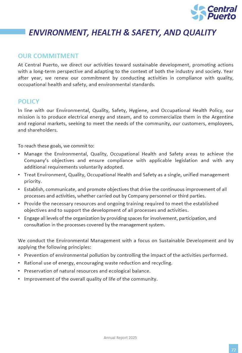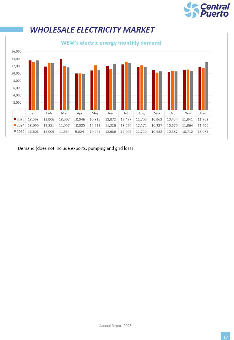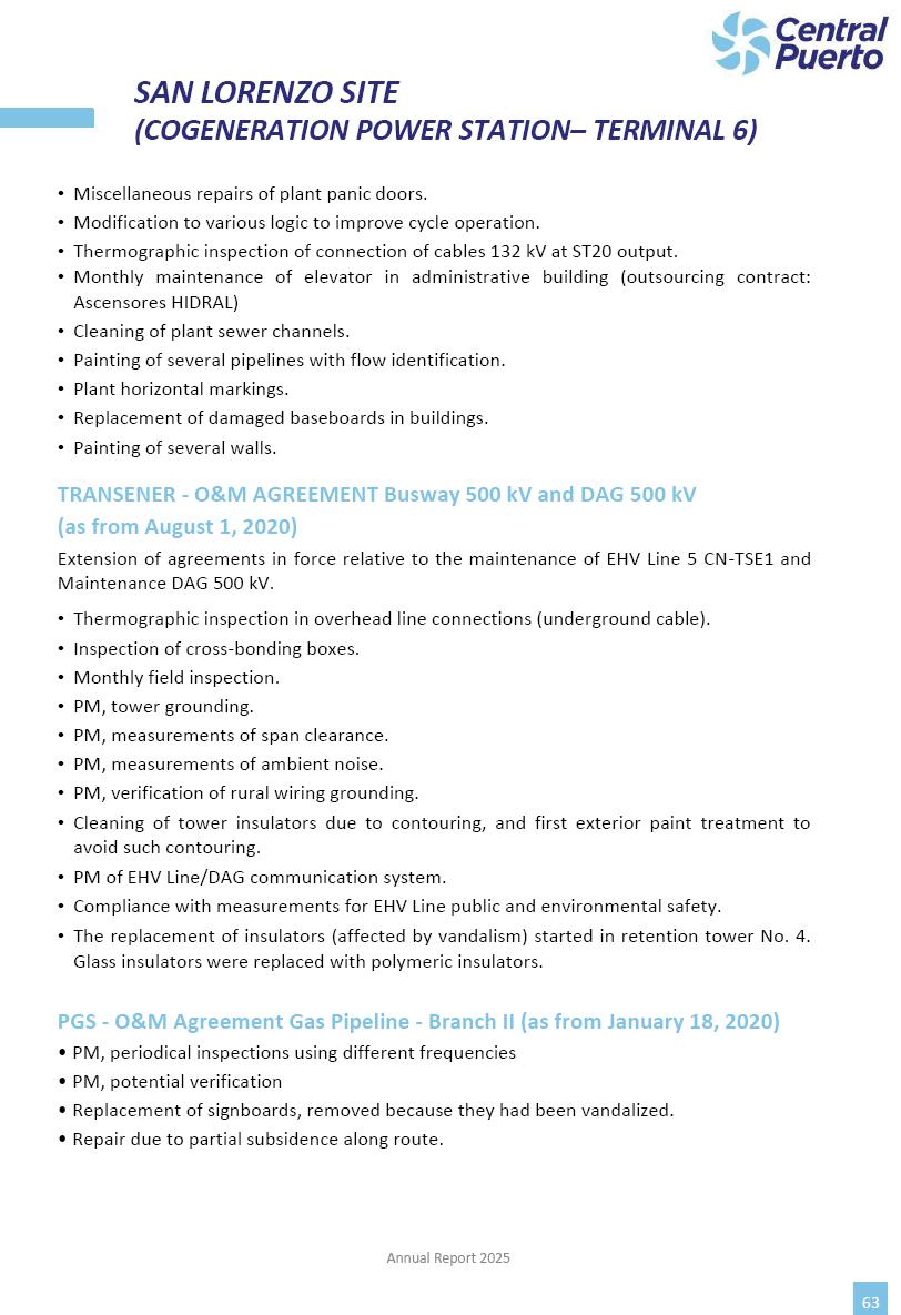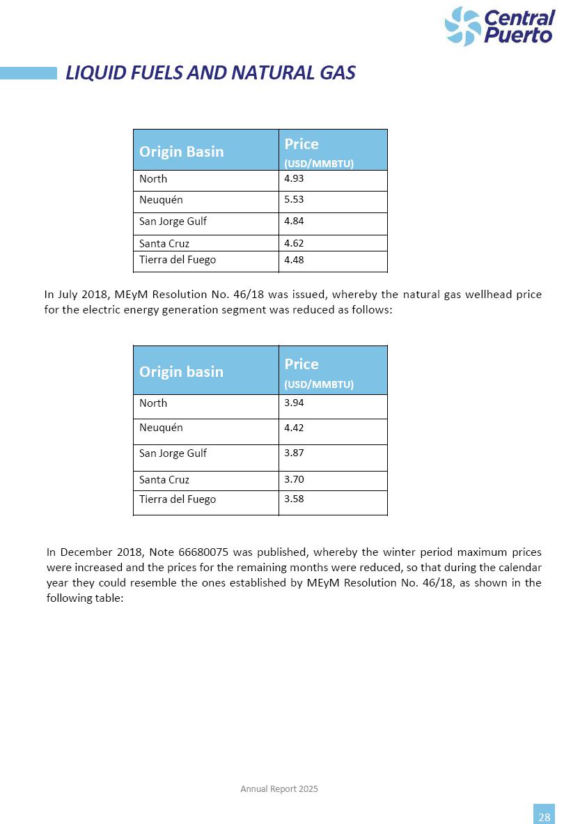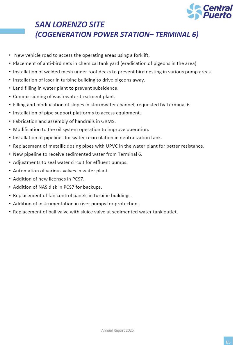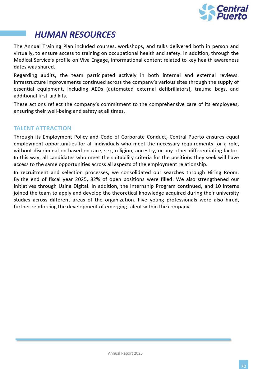 Annual Report Central Puerto December 2025 2 CONTENT 1. Company’s overview Corporate Governance Board of Directors, Statutory Audit Committee and Supervisory Committee Corporate information 2. Macroeconomic context 3. The Argentine Wholesale Electricity Market Trade Agreements in the forward market Liquid fuels and natural gas 4. Maintenance Puerto Nuevo & Nuevo Puerto Site Mendoza Piedra del Águila Site Brigadier López Site San Lorenzo Site – Terminal 6 5. Human Resource 6. Environment, Health & Safety and Quality Commitment Policy Environment Health & Safety Quality 7. Finances General remarks Outlook for the current fiscal year Allocation of fiscal year results Financial performance 01 Company’s overview CORPORATE GOVERNANCE Annual Report 2025 4 Directors Osvaldo Arturo RECA (Chairman) Miguel DODERO (Vice-Chairman) José Luis MOREA Tomás José WHITE Marcelo Atilio SUVA Jorge Eduardo VILLEGAS Martina BLANCO Diego Gustavo PETRACCHI Martín LHEZ Deputy Directors Fernando Roberto BONNET José Manuel ORTIZ Adrián Gustavo SALVATORE Martín OROZCO Mario ELIZALDE José Manuel PAZOS Alejo VILLEGAS Ramón Nazareno ULLOA CORPORATE GOVERNANCE Annual Report 2025 5 STATUTORY AUDIT COMMITTEE Statutory Auditors Carlos César Adolfo HALLADJIAN Eduardo Antonio EROSA Juan Antonio NICHOLSON Deputy Statutory Auditors Carlos Adolfo ZLOTNITZKY Cristina Margarita DE GIORGIO Lucas NICHOLSON SUPERVISORY COMMITTEE Members José Luis MOREA Tomás José WHITE (financial expert) Jorge Eduardo VILLEGAS Deputy members Juan Manuel ORTIZ Mario ELIZALDE Annual Report 2025 6 CORPORATE INFORMATION Central Puerto S.A. (the “Company” or “CPSA”) and the companies that make up the economic group (the “Group”) form an integrated group of companies related to the energy sector, mainly engaged in electric power generation and trade. CPSA was incorporated pursuant to the Executive Power (“PEN”) Decree No. 122/92, in accordance with Law No. 24065, which subjected to total privatization the electricity generation, transportation, distribution and trade in charge of Servicios Eléctricos del Gran Buenos Aires S.A. Our shares are listed on Bolsas y Mercados Argentinos (“BYMA”) and, since February 1, 2018, on the NYSE (“New York Stock Exchange”), under the ticker “CEPU”. The Company has the following assets to conduct its electric power generation activity: THERMAL AND HYDROELECTRIC POWER STATIONS (*) ST 140 MW with Commercial Authorization expected for 2026 Luján de Cuyo Thermal Station has a capacity of 125 tn/h of steam production and Terminal 6 – San Lorenzo Cogeneration Thermal Station has a steam production capacity of 340 tn/h. Annual Report 2025 7 CORPORATE INFORMATION The Company has a total installed capacity of 568.8 MW of commercially-authorized power from renewable sources, which is distributed as follows: RENEWABLE ENERGY FARMS (*) CPSA’s acquisition of the complex in September 2025 (**) Generation is considered from the Commercial Authorization of the farm in November 2025 Annual Report 2025 8 CORPORATE INFORMATION Central Puerto has shareholdings in three thermal companies: INVESTEES Annual Report 2025 9 CORPORATE INFORMATION ✓ On July 19, 2028, Ente Nacional Regulador del Gas (Enargas, Argentine Gas Regulating Entity) registered the Company in the Traders and Trade Agreements Register of Enargas. ✓ The company Puerto Energia S.A.U. (completely controlled by CPSA), was registered as trader of natural gas in the Traders Register of Enargas on March 22, 2024, and on September 20, 2024 its entry as Trader Participant in Wholesale Electricity Market (WEM) was authorized. ✓ On March 31, 2025, CPSA’s Board of Directors approved a corporate reorganization by which, subject to the approval of the Shareholders’ Meetings of the companies involved, CPSA absorbed the assets and liabilities of the subsidiary CPR. Since CPSA owned 100% of CPR’s shares, its equity did not increase as a result of the merger. Subsidiary CPR will be dissolved without liquidation. On May 22, 2025, the corresponding Shareholders’ Meetings approved the corporate reorganization. The merger’s effective date was defined to be October 1, 2025, once all the conditions established in the Merger Final Agreement were met and after the approval of the corporate reorganization by CNV, which occurred on September 10, 2025. ✓ Regarding the mining sector, the Company has a shareholding of: a) 9.9% in AbraSilver Resource Corp. (“AbraSilver”), a company listed on the Canadian Stock Exchange with mining concessions in Argentina, which includes the silver-gold project Diablillos, located in the Northwest area of Argentina, on the limit between the provinces of Salta and Catamarca, and b) 27.5% of the share capital of 3C Lithium Pte. Ltd. (“3C”) (incorporated under the regulations of Singapore), which owns 100% of the share capital of Minera Cordillera S.A., an Argentine company owning the mining rights of the project “Tres Cruces”, located in Catamarca, Argentina. The project “Tres Cruces” involves a recently-discovered lithium deposit, with the aim of developing exploring, drilling and exploitation activities of the mineral. ✓ The Group participates in the forestry sector with assets in the provinces of Entre Ríos and Corrientes, through the following subsidiaries of Proener S.A.U (a company completely owned by CPSA): a) Forestal Argentina S.A., owner of forestry assets consisting of approximately 141,000 hectares in the provinces of Entre Ríos and Corrientes, of which 67,000 hectares are planted with eucalyptus and pine, over a total of 77,500 arable hectares; and b) Loma Alta Forestal S.A., owner of forestry assets consisting of approximately 19,400 hectares in the province of Corrientes, of which approximately 10,400 hectares are planted with pine. Annual Report 2025 10 CORPORATE INFORMATION ✓ Finally, the Group was involved in the natural gas distribution sector in the regions of Cuyo 