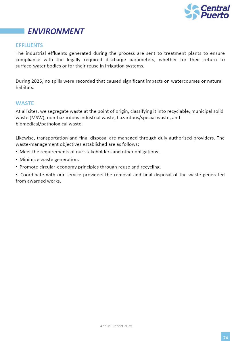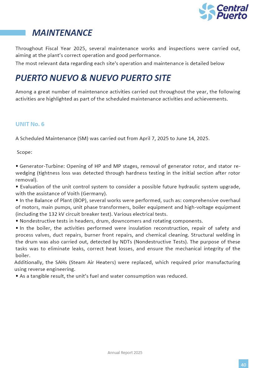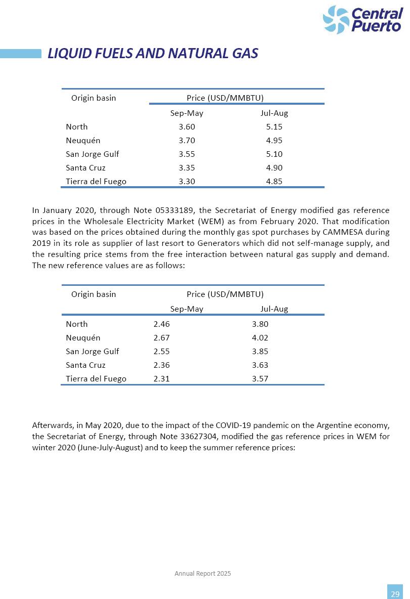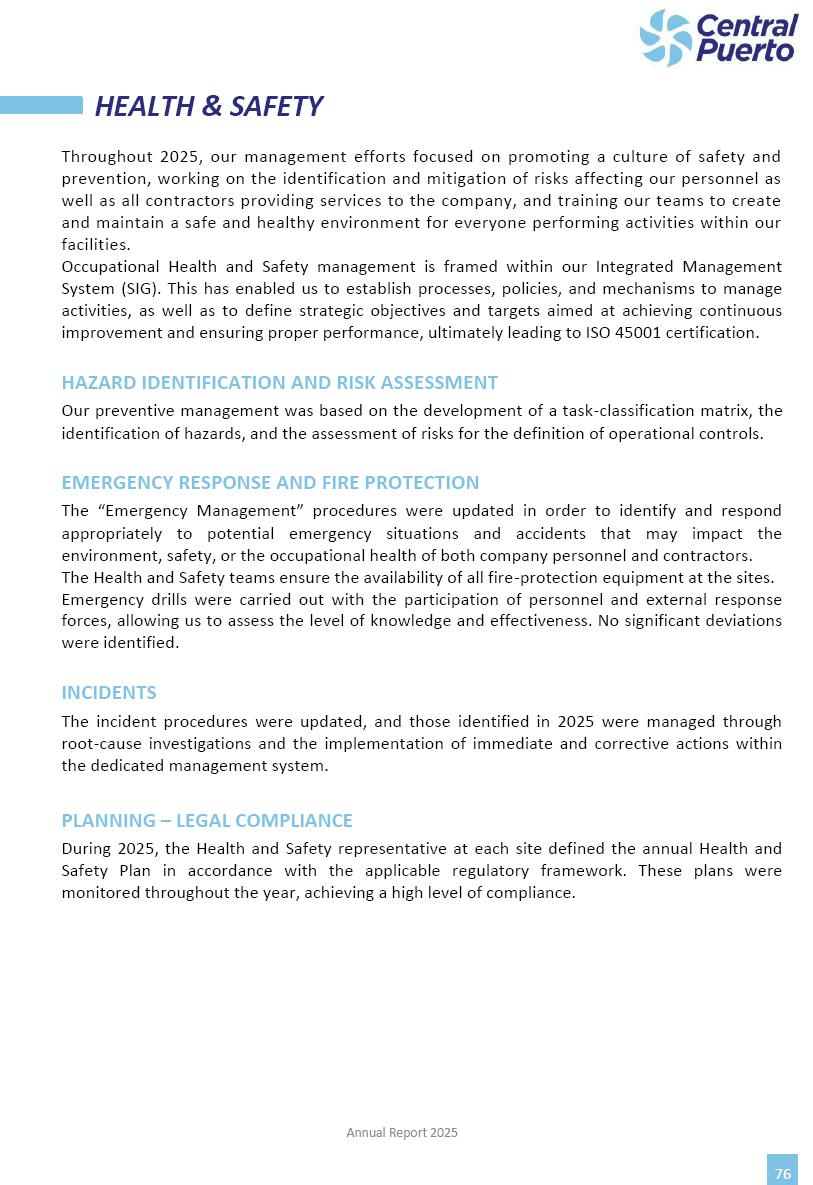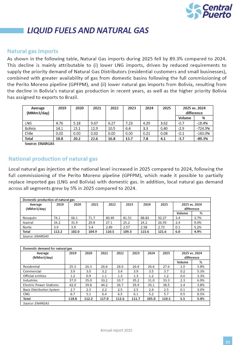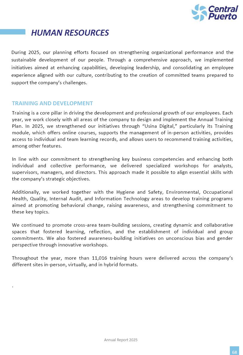 Annual Report Central Puerto December 2025 2 CONTENT 1. Company’s overview Corporate Governance Board of Directors, Statutory Audit Committee and Supervisory Committee Corporate information 2. Macroeconomic context 3. The Argentine Wholesale Electricity Market Trade Agreements in the forward market Liquid fuels and natural gas 4. Maintenance Puerto Nuevo & Nuevo Puerto Site Mendoza Piedra del Águila Site Brigadier López Site San Lorenzo Site – Terminal 6 5. Human Resource 6. Environment, Health & Safety and Quality Commitment Policy Environment Health & Safety Quality 7. Finances General remarks Outlook for the current fiscal year Allocation of fiscal year results Financial performance 01 Company’s overview CORPORATE GOVERNANCE Annual Report 2025 4 Directors Osvaldo Arturo RECA (Chairman) Miguel DODERO (Vice-Chairman) José Luis MOREA Tomás José WHITE Marcelo Atilio SUVA Jorge Eduardo VILLEGAS Martina BLANCO Diego Gustavo PETRACCHI Martín LHEZ Deputy Directors Fernando Roberto BONNET José Manuel ORTIZ Adrián Gustavo SALVATORE Martín OROZCO Mario ELIZALDE José Manuel PAZOS Alejo VILLEGAS Ramón Nazareno ULLOA CORPORATE GOVERNANCE Annual Report 2025 5 STATUTORY AUDIT COMMITTEE Statutory Auditors Carlos César Adolfo HALLADJIAN Eduardo Antonio EROSA Juan Antonio NICHOLSON Deputy Statutory Auditors Carlos Adolfo ZLOTNITZKY Cristina Margarita DE GIORGIO Lucas NICHOLSON SUPERVISORY COMMITTEE Members José Luis MOREA Tomás José WHITE (financial expert) Jorge Eduardo VILLEGAS Deputy members Juan Manuel ORTIZ Mario ELIZALDE Annual Report 2025 6 CORPORATE INFORMATION Central Puerto S.A. (the “Company” or “CPSA”) and the companies that make up the economic group (the “Group”) form an integrated group of companies related to the energy sector, mainly engaged in electric power generation and trade. CPSA was incorporated pursuant to the Executive Power (“PEN”) Decree No. 122/92, in accordance with Law No. 24065, which subjected to total privatization the electricity generation, transportation, distribution and trade in charge of Servicios Eléctricos del Gran Buenos Aires S.A. Our shares are listed on Bolsas y Mercados Argentinos (“BYMA”) and, since February 1, 2018, on the NYSE (“New York Stock Exchange”), under the ticker “CEPU”. The Company has the following assets to conduct its electric power generation activity: THERMAL AND HYDROELECTRIC POWER STATIONS (*) ST 140 MW with Commercial Authorization expected for 2026 Luján de Cuyo Thermal Station has a capacity of 125 tn/h of steam production and Terminal 6 – San Lorenzo Cogeneration Thermal Station has a steam production capacity of 340 tn/h. Annual Report 2025 7 CORPORATE INFORMATION The Company has a total installed capacity of 568.8 MW of commercially-authorized power from renewable sources, which is distributed as follows: RENEWABLE ENERGY FARMS (*) CPSA’s acquisition of the complex in September 2025 (**) Generation is considered from the Commercial Authorization of the farm in November 2025 Annual Report 2025 8 CORPORATE INFORMATION Central Puerto has shareholdings in three thermal companies: INVESTEES Annual Report 2025 9 CORPORATE INFORMATION ✓ On July 19, 2028, Ente Nacional Regulador del Gas (Enargas, Argentine Gas Regulating Entity) registered the Company in the Traders and Trade Agreements Register of Enargas. ✓ The company Puerto Energia S.A.U. (completely controlled by CPSA), was registered as trader of natural gas in the Traders Register of Enargas on March 22, 2024, and on September 20, 2024 its entry as Trader Participant in Wholesale Electricity Market (WEM) was authorized. ✓ On March 31, 2025, CPSA’s Board of Directors approved a corporate reorganization by which, subject to the approval of the Shareholders’ Meetings of the companies involved, CPSA absorbed the assets and liabilities of the subsidiary CPR. Since CPSA owned 100% of CPR’s shares, its equity did not increase as a result of the merger. Subsidiary CPR will be dissolved without liquidation. On May 22, 2025, the corresponding Shareholders’ Meetings approved the corporate reorganization. The merger’s effective date was defined to be October 1, 2025, once all the conditions established in the Merger Final Agreement were met and after the approval of the corporate reorganization by CNV, which occurred on September 10, 2025. ✓ Regarding the mining sector, the Company has a shareholding of: a) 9.9% in AbraSilver Resource Corp. (“AbraSilver”), a company listed on the Canadian Stock Exchange with mining concessions in Argentina, which includes the silver-gold project Diablillos, located in the Northwest area of Argentina, on the limit between the provinces of Salta and Catamarca, and b) 27.5% of the share capital of 3C Lithium Pte. Ltd. (“3C”) (incorporated under the regulations of Singapore), which owns 100% of the share capital of Minera Cordillera S.A., an Argentine company owning the mining rights of the project “Tres Cruces”, located in Catamarca, Argentina. The project “Tres Cruces” involves a recently-discovered lithium deposit, with the aim of developing exploring, drilling and exploitation activities of the mineral. ✓ The Group participates in the forestry sector with assets in the provinces of Entre Ríos and Corrientes, through the following subsidiaries of Proener S.A.U (a company completely owned by CPSA): a) Forestal Argentina S.A., owner of forestry assets consisting of approximately 141,000 hectares in the provinces of Entre Ríos and Corrientes, of which 67,000 hectares are planted with eucalyptus and pine, over a total of 77,500 arable hectares; and b) Loma Alta Forestal S.A., owner of forestry assets consisting of approximately 19,400 hectares in the province of Corrientes, of which approximately 10,400 hectares are planted with pine. Annual Report 2025 10 CORPORATE INFORMATION ✓ Finally, the Group was involved in the natural gas distribution sector in the regions of Cuyo 