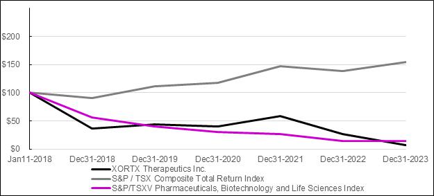 The following graph compares the yearly change in the cumulative total shareholder return since January 11, 2018, being the first trading date following the closing of the Company’s reverse take-over and acquisition of all of the issued and outstanding shares of XORTX Pharma Corp. to form XORTX, assuming an investment of C$100 was made on January 11, 2018 in the Common Shares, with the cumulative total return of the S&P/TSX Composite Total Return Index and the S&P/TSXV Pharmaceuticals, Biotechnology and Life Sciences Index for the comparable period.