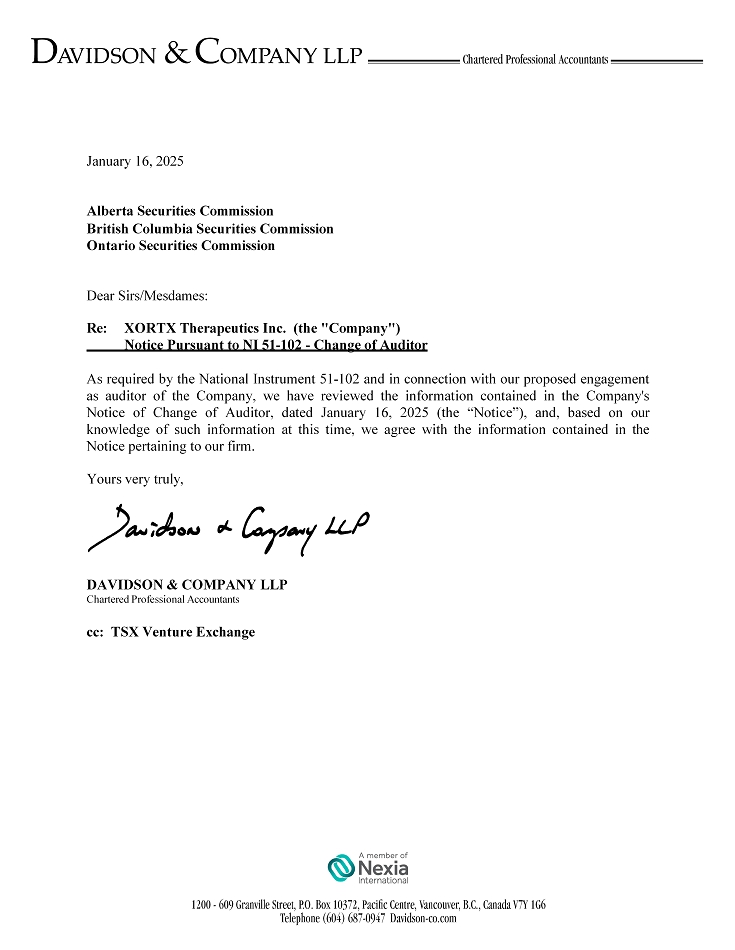 January 16, 2025 Alberta Securities Commission British Columbia Securities Commission Ontario Securities Commission Dear Sirs/Mesdames: Re: XORTX Therapeutics Inc. (the "Company") Notice Pursuant to NI 51 - 102 - Change of Auditor As required by the National Instrument 51 - 102 and in connection with our proposed engagement as auditor of the Company, we have reviewed the information contained in the Company's Notice of Change of Auditor, dated January 16 , 2025 (the “Notice”), and, based on our knowledge of such information at this time, we agree with the information contained in the Notice pertaining to our firm . Yours very truly, DAVIDSON & COMPANY LLP Chartered Professional Accountants cc: TSX Venture Exchange