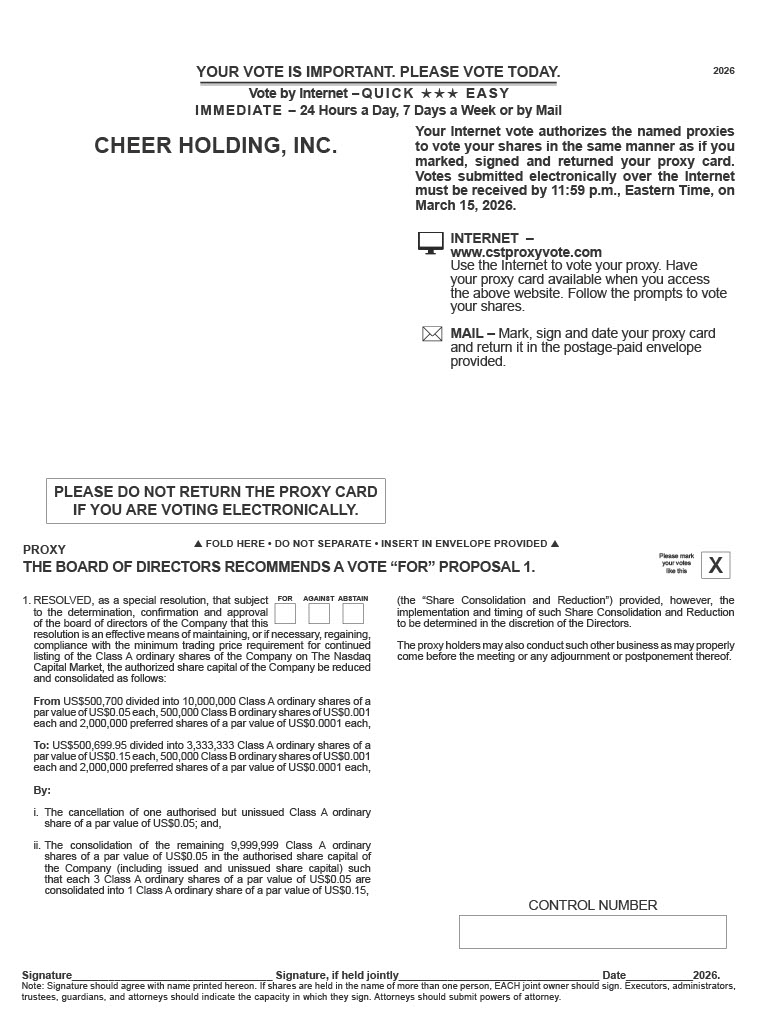 2026 (the “Share Consolidation and Reduction”) provided, however, the implementation and timing of such Share Consolidation and Reduction to be determined in the discretion of the Directors . The proxy holders may also conduct such other business as may properly come before the meeting or any adjournment or postponement thereof . 1. RESOLVED, as a special resolution, that subject to the determination, confirmation and approval of the board of directors of the Company that this resolution is an effective means of maintaining, or if necessary, regaining, compliance with the minimum trading price requirement for continued listing of the Class A ordinary shares of the Company on The Nasdaq Capital Market, the authorized share capital of the Company be reduced and consolidated as follows : Fro m US $ 500 , 70 0 divide d int o 10 , 000 , 00 0 Clas s A ordinar y share s o f a pa r valu e o f US $ 0 . 0 5 each , 500 , 00 0 Clas s B ordinar y share s o f US $ 0 . 001 eac h an d 2 , 000 , 00 0 preferre d share s o f a pa r valu e o f US $ 0 . 000 1 each, To : US $ 500 , 699 . 9 5 divide d int o 3 , 333 , 33 3 Clas s A ordinar y share s o f a pa r valu e o f US $ 0 . 1 5 each , 500 , 00 0 Clas s B ordinar y share s o f US $ 0 . 001 eac h an d 2 , 000 , 00 0 preferre d share s o f a pa r valu e o f US $ 0 . 000 1 each, By: i. The cancellation of one authorised but unissued Class A ordinary share of a par value of US $ 0 . 05 ; and, ii. The consolidation of the remaining 9 , 999 , 999 Class A ordinary shares of a par value of US $ 0 . 05 in the authorised share capital of the Company (including issued and unissued share capital) such that each 3 Class A ordinary shares of a par value of US $ 0 . 05 are consolidated into 1 Class A ordinary share of a par value of US $ 0 . 15 , CHEER HOLDING, INC.  FOLD HERE • DO NOT SEPARATE • INSERT IN ENVELOPE PROVIDED  Signature Signature, if held jointly Date 2026. Note: Signature should agree with name printed hereon. If shares are held in the name of more than one person, EACH joint owner should sign. Executors, administrators, trustees, guardians, and attorneys should indicate the capacity in which they sign. Attorneys should submit powers of attorney. Please mark like this X your votes CONTROL NUMBER PROXY THE BOARD OF DIRECTORS RECOMMENDS A VOTE “FOR” PROPOSAL 1. PLEASE DO NOT RETURN THE PROXY CARD IF YOU ARE VOTING ELECTRONICALLY. INTERNET – www.cstproxyvote.com Use the Internet to vote your proxy. Have your proxy card available when you access the above website. Follow the prompts to vote your shares. MAIL – Mark, sign and date your proxy card and return it in the postage - paid envelope provided. Your Internet vote authorizes the named proxies to vote your shares in the same manner as if you marked, signed and returned your proxy card . Votes submitted electronically over the Internet must be received by 11 : 59 p . m . , Eastern Time, on March 15 , 2026 . YOUR VOTE IS IMPORTANT. PLEASE VOTE TODAY. Vote by Internet - QUICK YYY EASY IMMEDIATE - 24 Hours a Day, 7 Days a Week or by Mail FOR AGAINST ABSTAIN