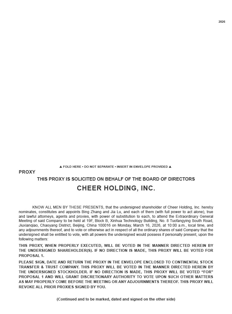 2026  FOLD HERE • DO NOT SEPARATE • INSERT IN ENVELOPE PROVIDED  PROXY THIS PROXY IS SOLICITED ON BEHALF OF THE BOARD OF DIRECTORS CHEER HOLDING, INC. KNOW ALL MEN BY THESE PRESENTS, that the undersigned shareholder of Cheer Holding, Inc . hereby nominates, constitutes and appoints Bing Zhang and Jia Lu, and each of them (with full power to act alone), true and lawful attorneys, agents and proxies, with power of substitution to each, to attend the Extraordinary General Meeting of said Company to be held at 19 F, Block B, Xinhua Technology Building, No . 8 Tuofangying South Road, Jiuxianqiao, Chaoyang District, Beijing, China 100016 on Monday, March 16 , 2026 , at 10 : 00 a . m . , local time, and any adjournments thereof, and to vote or otherwise act in respect of all the ordinary shares of said Company that the undersigned shall be entitled to vote, with all powers the undersigned would possess if personally present, upon the following matters : THIS PROXY, WHEN PROPERLY EXECUTED, WILL BE VOTED IN THE MANNER DIRECTED HEREIN BY THE UNDERSIGNED SHAREHOLDER(S) . IF NO DIRECTION IS MADE, THIS PROXY WILL BE VOTED FOR PROPOSAL 1 . PLEASE SIGN, DATE AND RETURN THE PROXY IN THE ENVELOPE ENCLOSED TO CONTINENTAL STOCK TRANSFER & TRUST COMPANY . THIS PROXY WILL BE VOTED IN THE MANNER DIRECTED HEREIN BY THE UNDERSIGNED STOCKHOLDER . IF NO DIRECTION IS MADE, THIS PROXY WILL BE VOTED “FOR” PROPOSAL 1 AND WILL GRANT DISCRETIONARY AUTHORITY TO VOTE UPON SUCH OTHER MATTERS AS MAY PROPERLY COME BEFORE THE MEETING OR ANY ADJOURNMENTS THEREOF . THIS PROXY WILL REVOKE ALL PRIOR PROXIES SIGNED BY YOU . (Continued and to be marked, dated and signed on the other side)