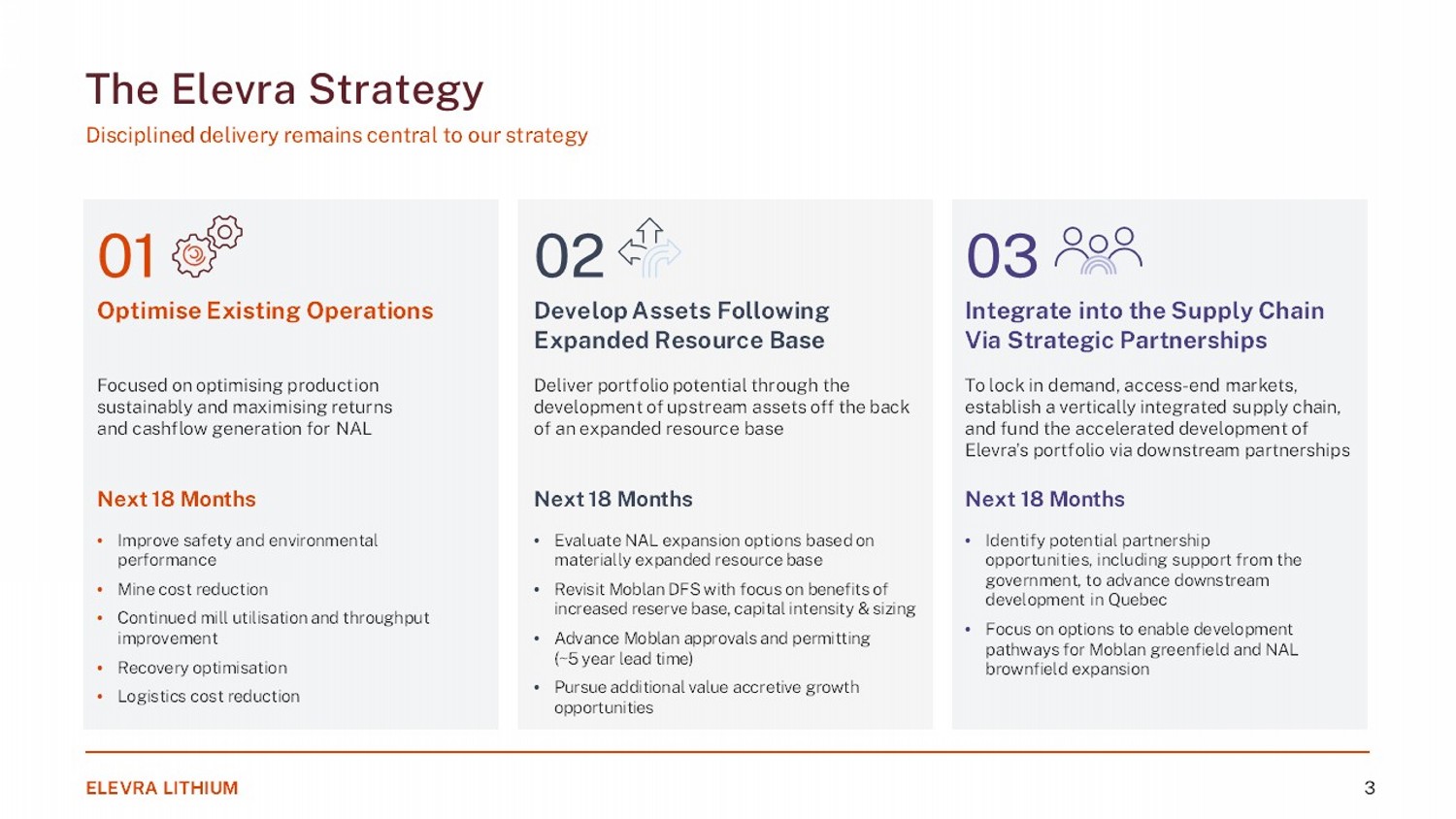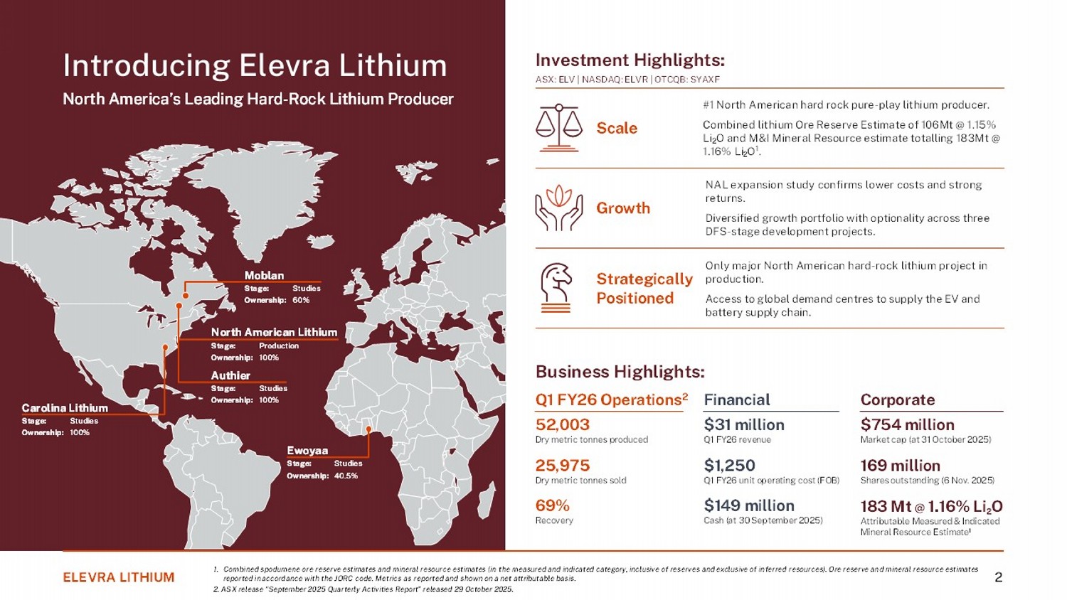 ELEVRA LITHIUM 2 Introducing Elevra Lithium North America’s Leading Hard - Rock Lithium Producer Business Highlights: Q1 FY26 Operations 2 Financial 52,003 Dry metric tonnes produced 25,975 Dry metric tonnes sold 69% Recovery $31 million Q1 FY26 revenue $1,250 Q1 FY26 unit operating cost (FOB) $149 million Cash (at 30 September 2025) Corporate $754 million Market cap (at 31 October 2025) 169 million Shares outstanding (6 Nov. 2025) 183 Mt @ 1.16% Li 2 O Attributable Measured & Indicated Mineral Resource Estimate 1 Investment Highlights: ASX: ELV | NASDAQ: ELVR | OTCQB: SYAXF #1 North American hard rock pure - play lithium producer. Combined lithium Ore Reserve Estimate of 106Mt @ 1.15% Li 2 O and M&I Mineral Resource estimate totalling 183Mt @ 1.16% Li 2 O 1 . Scale Growth Strategically Positioned NAL expansion study confirms lower costs and strong returns. Diversified growth portfolio with optionality across three DFS - stage development projects. Only major North American hard - rock lithium project in production. Access to global demand centres to supply the EV and battery supply chain. North American Lithium Production Stage: 100% Ownership: Authier Studies Stage: 100% Ownership: Moblan Studies Stage: 60% Ownership: Carolina Lithium Studies Stage: 100% Ownership: Ewoyaa Studies Stage: 40.5% Ownership: 1. Combined spodumene ore reserve estimates and mineral resource estimates (in the measured and indicated category, inclusive of reserves and exclusive of inferred resources). Ore reserve and mineral resource estimates reported in accordance with the JORC code. Metrics as reported and shown on a net attributable basis. 2. ASX release “September 2025 Quarterly Activities Report” released 29 October 2025.