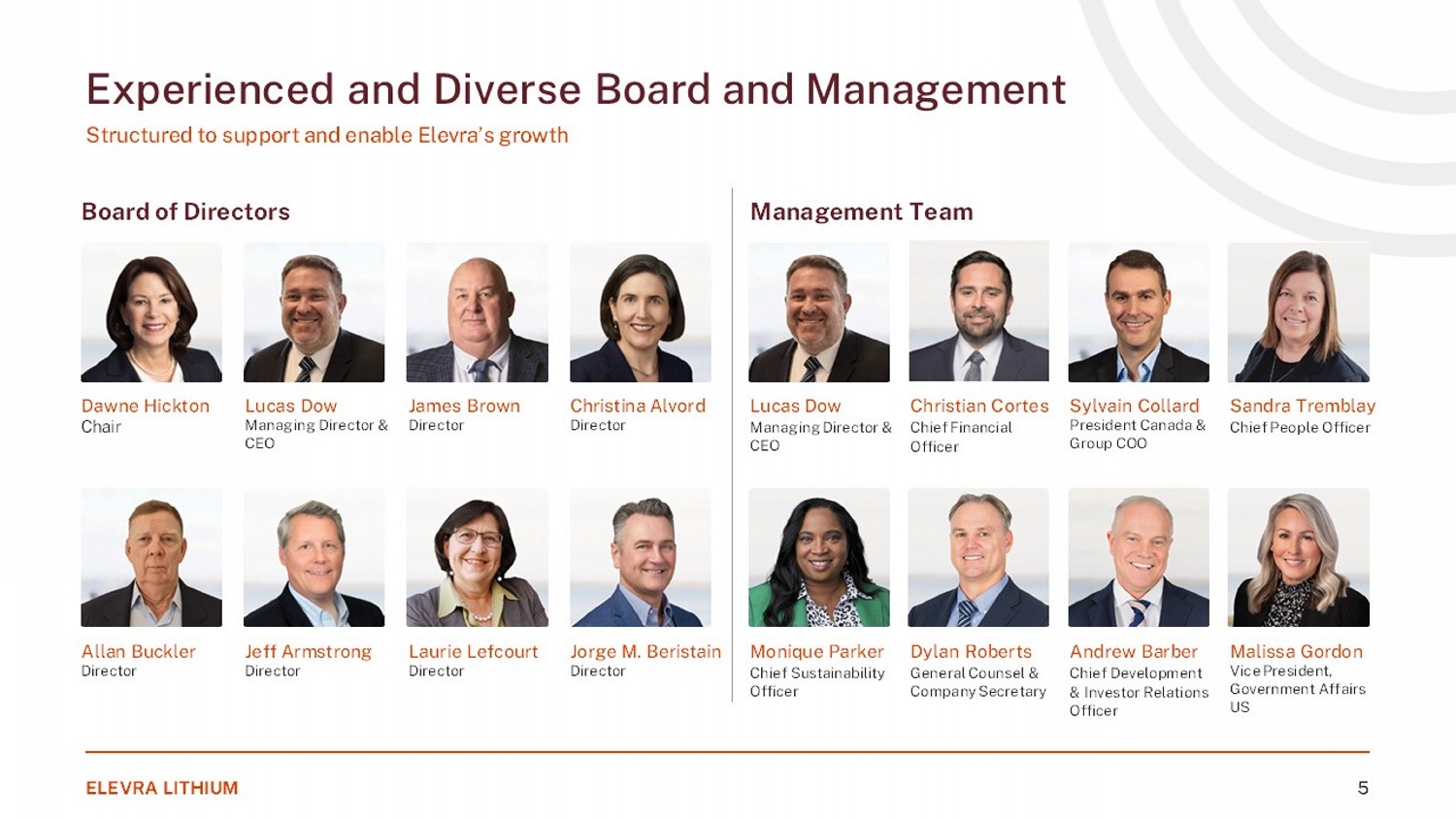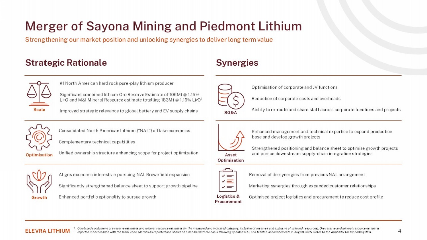 #1 North American hard rock pure - play lithium producer Significant combined lithium Ore Reserve Estimate of 106Mt @ 1.15% Li 2 O and M&I Mineral Resource estimate totalling 183Mt @ 1.16% Li 2 O 1 Improved strategic relevance to global battery and EV supply chains Aligns economic interests in pursuing NAL Brownfield expansion Significantly strengthened balance sheet to support growth pipeline Enhanced portfolio optionality to pursue growth Merger of Sayona Mining and Piedmont Lithium Strengthening our market position and u nlocking synergies to deliver long term value 1. Combined spodumene ore reserve estimates and mineral resource estimates (in the measured and indicated category, inclusive of reserves and exclusive of inferred resources). Ore reserve and mineral resource estimates reported in accordance with the JORC code. Metrics as reported and shown on a net attributable basis following updated NAL and Moblan announcements in August 2025. Refer to the Appendix for supporting data. Strategic Rationale ELEVRA LITHIUM 4 Scale Optimisation Growth Consolidated North American Lithium (“NAL”) offtake economics Complementary technical capabilities Unified ownership structure enhancing scope for project optimization Synergies SG&A Optimisation of corporate and JV functions Reduction of corporate costs and overheads Ability to re - route and share staff across corporate functions and projects Asset Optimisation Logistics & Procurement Enhanced management and technical expertise to expand production base and develop growth projects Strengthened positioning and balance sheet to optimise growth projects and pursue downstream supply - chain integration strategies Removal of de - synergies from previous NAL arrangement Marketing synergies through expanded customer relationships Optimised project logistics and procurement to reduce cost profile
