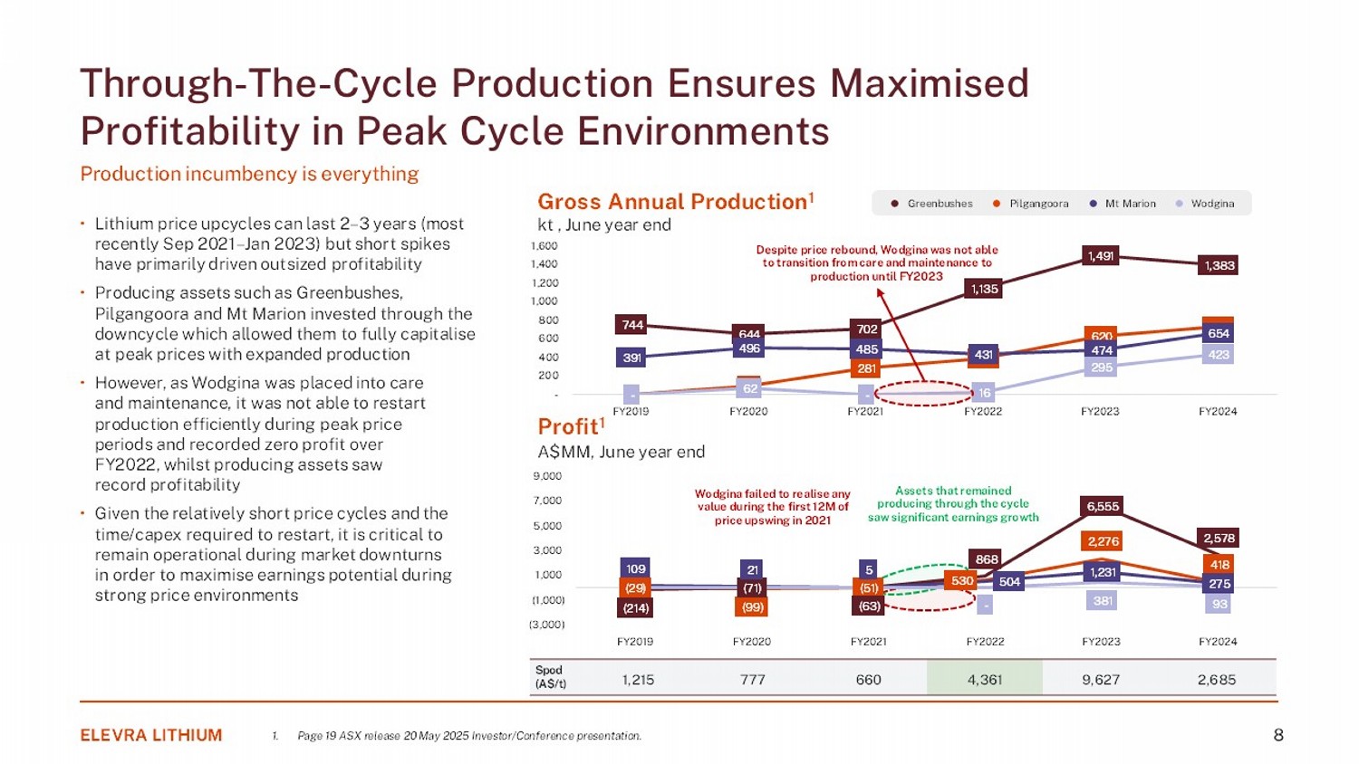 Greenbushes Pilgangoora Mt Marion Wodgina Through - The - Cycle Production Ensures Maximised Profitability in Peak Cycle Environments Production incumbency is everything • Lithium price upcycles can last 2 – 3 years (most recently Sep 2021 – Jan 2023) but short spikes have primarily driven outsized profitability • Producing assets such as Greenbushes, Pilgangoora and Mt Marion invested through the downcycle which allowed them to fully capitalise at peak prices with expanded production • However, as Wodgina was placed into care and maintenance, it was not able to restart production efficiently during peak price periods and recorded zero profit over FY2022, whilst producing assets saw record profitability • Given the relatively short price cycles and the time/capex required to restart, it is critical to remain operational during market downturns in order to maximise earnings potential during strong price environments Gross Annual Production 1 k t , June year end Profit 1 A$MM, June year end 2,685 9,627 4,361 660 777 1,215 Spod (A$/t) ELEVRA LITHIUM 8 - 91 281 378 620 725 744 644 702 1,135 1,491 1,383 391 496 485 431 474 654 - 62 - 16 295 423 - 200 400 600 800 1,000 1,200 1,400 1,600 FY2019 FY2020 FY2021 FY2022 FY2023 FY2024 Despite price rebound, Wodgina was not able to transition from care and maintenance to production until FY2023 (29) (99) (51) 530 2,276 418 (214) (71) (63) 868 6,555 2,578 109 21 5 504 1,231 275 - 381 93 (3,000) (1,000) 1,000 3,000 5,000 7,000 9,000 FY2019 FY2020 FY2021 FY2022 FY2023 FY2024 Wodgina failed to realise any value during the first 12M of price upswing in 2021 Assets that remained producing through the cycle saw significant earnings growth 1. Page 19 ASX release 20 May 2025 Investor/Conference presentation.
