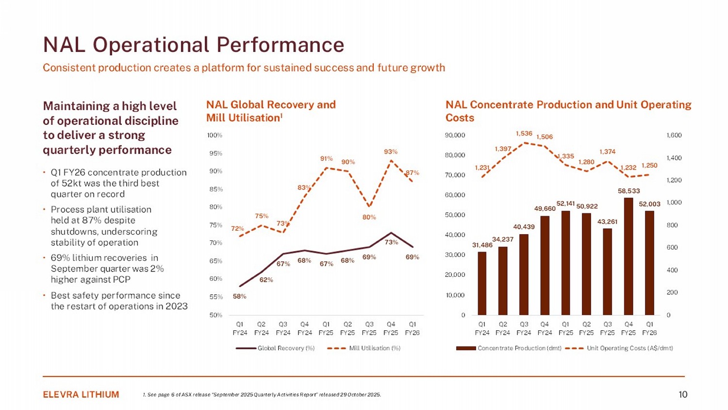 Maintaining a high level of operational discipline to deliver a strong quarterly performance • Q1 FY26 concentrate production of 52kt was the third best quarter on record • Process plant utilisation held at 87% despite shutdowns, underscoring stability of operation • 69% lithium recoveries in September quarter was 2 % higher against PCP • Best safety performance since the restart of operations in 2023 NAL Operational Performance Consistent production creates a p latform for sustained success and future growth NAL Global Recovery and Mill Utilisation 1 NAL Concentrate Production and Unit Operating Costs ELEVRA LITHIUM 10 58% 62% 67% 68% 67% 68% 69% 73% 69% 72% 75% 73% 83% 91% 90% 80% 93% 87% 50% 55% 60% 65% 70% 75% 80% 85% 90% 95% 100% Q1 FY24 Q2 FY24 Q3 FY24 Q4 FY24 Q1 FY25 Q2 FY25 Q3 FY25 Q4 FY25 Q1 FY26 Global Recovery (%) Mill Utilisation (%) 31,486 34,237 40,439 49,660 52,141 50,922 43,261 58,533 52,003 1,231 1,397 1,536 1,506 1,335 1,280 1,374 1,232 1,250 0 200 400 600 800 1,000 1,200 1,400 1,600 0 10,000 20,000 30,000 40,000 50,000 60,000 70,000 80,000 90,000 Q1 FY24 Q2 FY24 Q3 FY24 Q4 FY24 Q1 FY25 Q2 FY25 Q3 FY25 Q4 FY25 Q1 FY26 Concentrate Production (dmt) Unit Operating Costs (A$/dmt) 1. See page 6 of ASX release “September 2025 Quarterly Activities Report” released 29 October 2025.