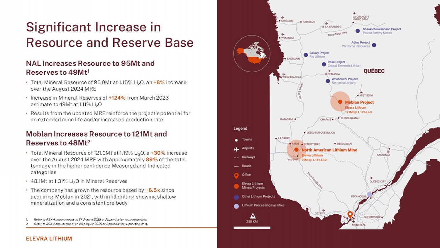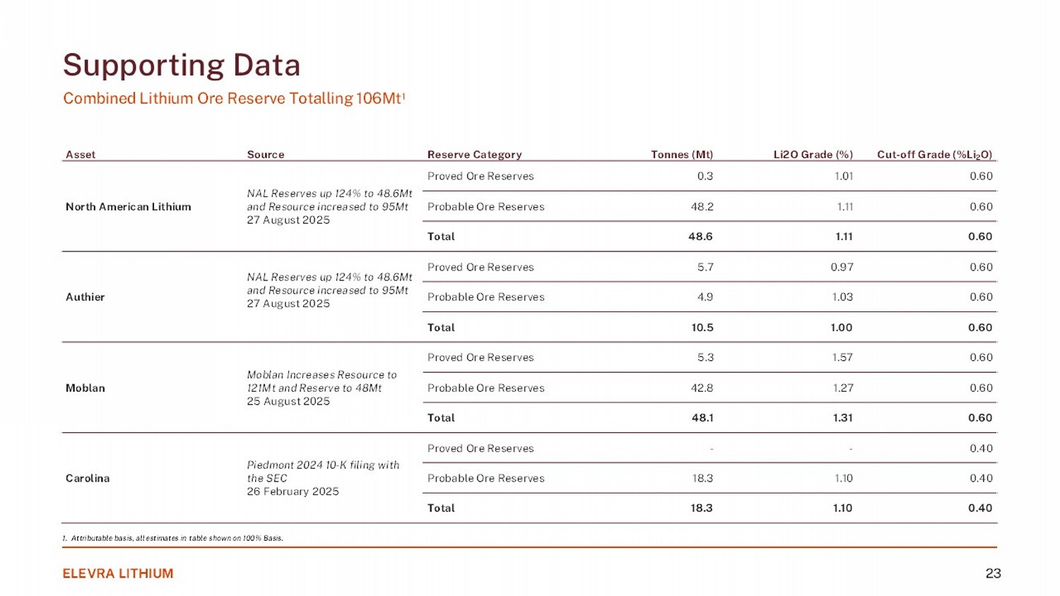 ELEVRA LITHIUM 23 Cut - off Grade (%Li 2 O) Li2O Grade (%) Tonnes (Mt) Reserve Category Source Asset 0.60 1.01 0.3 Proved Ore Reserves NAL Reserves up 124% to 48.6Mt and Resource increased to 95Mt 27 August 2025 North American Lithium 0.60 1.11 48.2 Probable Ore Reserves 0.60 1.11 48.6 Total 0.60 0.97 5.7 Proved Ore Reserves NAL Reserves up 124% to 48.6Mt and Resource increased to 95Mt 27 August 2025 Authier 0.60 1.03 4.9 Probable Ore Reserves 0.60 1.00 10.5 Total 0.60 1.57 5.3 Proved Ore Reserves Moblan Increases Resource to 121Mt and Reserve to 48Mt 25 August 2025 Moblan 0.60 1.27 42.8 Probable Ore Reserves 0.60 1.31 48.1 Total 0.40 - - Proved Ore Reserves Piedmont 2024 10 - K filing with the SEC 26 February 2025 Carolina 0.40 1.10 18.3 Probable Ore Reserves 0.40 1.10 18.3 Total Supporting Data Combined Lithium Ore Reserve Totalling 106Mt 1 1. Attributable basis, all estimates in table shown on 100% Basis.