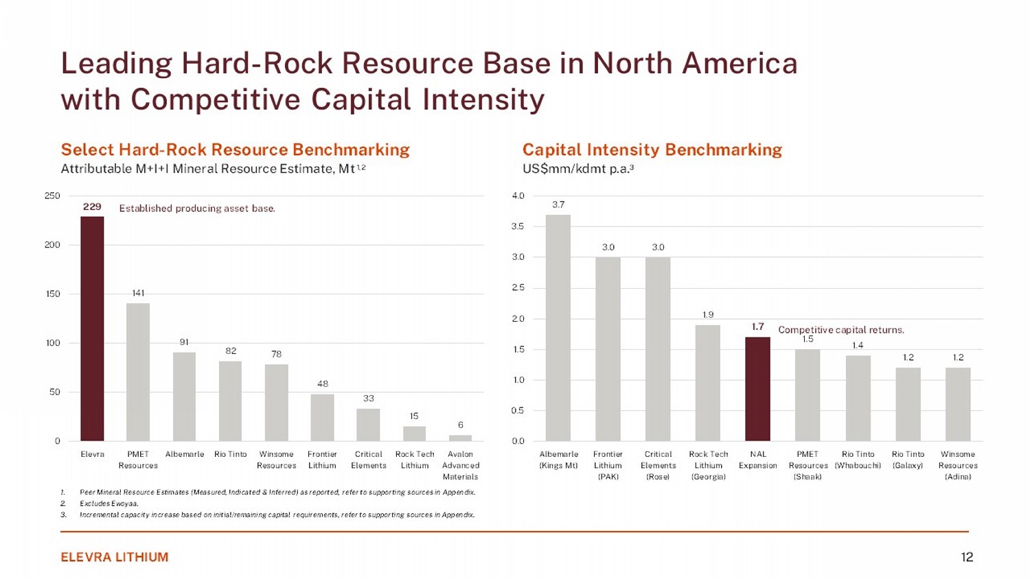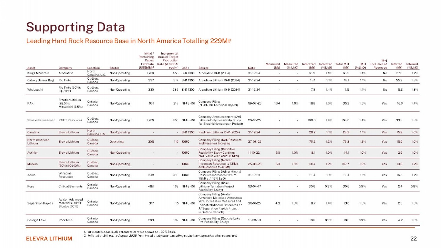 1. Attributable basis, all estimates in table shown on 100% Basis. 2. Inflated at 2% p.a. to August 2025 from initial study date excluding capital contingencies where reported. ELEVRA LITHIUM 22 Inferred (%Li 2 O) Inferred (Mt) M+I Inclusive of Reserves M+I (%Li 2 O) Total M+I (Mt) Indicated (%Li 2 O) Indicated (Mt) Measured (% Li 2 O) Measured (Mt) Date Source Code Incremental Annual Target Production Rate (kt SC5.5 equiv.) Initial / Remaining Capex Estimate (US$MM) 2 Status Location Company Asset 1.2% 27.6 No 1.4% 63.9 1.4% 63.9 - - 31 - 12 - 24 Albemarle 10 - K (2024) S - K 1300 458 1,700 Non - Operating North Carolina, U.S. Albemarle Kings Mountain 1.3% 55.9 No 1.1% 18.1 1.1% 18.1 - - 31 - 12 - 24 Arcadium Lithium 10 - K (2024) S - K 1300 317 397 Non - Operating Québec, Canada Rio Tinto Galaxy (James Bay) 1.3% 8.3 No 1.4% 7.8 1.4% 7.8 - - 31 - 12 - 24 Arcadium Lithium 10 - K (2024) S - K 1300 235 330 Non - Operating Québec, Canada Rio Tinto (50%); IQ (50%) Whabouchi 1.4% 16.6 Yes 1.5% 35.2 1.5% 18.8 1.6% 16.4 09 - 07 - 25 Company Filing (NI 43 - 101 Technical Report) NI 43 - 101 218 661 Non - Operating Ontario, Canada Frontier Lithium (92.5%); Mitsubishi (7.5%) PAK 1.3% 33.3 Yes 1.4% 108.0 1.4% 108.0 - - 20 - 10 - 25 Company Announcement (CV5 Lithium - Only Feasibility Study for Shaakichiuwaanaan Project) NI 43 - 101 800 1,200 Non - Operating Québec, Canada PMET Resources Shaakichiuwaanaan 1.0% 15.9 Yes 1.1% 28.2 1.1% 28.2 - - 31 - 12 - 24 Piedmont Lithium 10 - K (2024) S - K 1300 - - Non - Operating North Carolina, U.S. Elevra Lithium Carolina 1.0% 18.9 Yes 1.2% 76.2 1.2% 76.2 - - 27 - 08 - 25 Company Filing (NAL Resource and Reserves Increase) JORC 119 208 Operating Québec, Canada Elevra Lithium North American Lithium 1.0% 2.9 Yes 1.0% 14.1 1.0% 8.1 1.0% 6.0 11 - 10 - 22 Company Filing (Definitive Feasibility Study Confirms NAL Value with A$2.2B NPV) JORC - - Non - Operating Québec, Canada Elevra Lithium Authier 1.2% 13.3 Yes 1.2% 107.7 1.2% 101.4 1.5% 6.3 25 - 08 - 25 Company Filing (Moblan Increases Resource to 121Mt and Reserves to 48Mt) JORC - - Non - Operating Québec, Canada Elevra Lithium (60%); IQ (40%) Moblan 1.2% 16.5 Yes 1.1% 61.4 1.1% 61.4 - - 31 - 12 - 23 Company Filing (Adina Mineral Resource Increases 33% to 78Mt at 1.15% Li 2 O) JORC 280 348 Non - Operating Québec, Canada Winsome Resources Adina 0.8% 2.4 Yes 0.9% 30.6 0.9% 30.6 - - 03 - 04 - 17 Company Filing (Rose Lithium - Tantalum Project Feasibility Study) NI 43 - 101 163 488 Non - Operating Ontario, Canada Critical Elements Rose 1.5% 2.3 Yes 1.3% 13.0 1.4% 8.7 1.3% 4.3 30 - 01 - 25 Company Filing (Avalon Advanced Materials Announces 28% Increase in Measures and Indicated Mineral Resources at JV Separation Rapids Project in Ontario Canada) NI 43 - 101 15 317 Non - Operating Ontario, Canada Avalon Advanced Materials (40%); Sibelco (60%) Separation Rapids 1.0% 4.2 Yes 0.9% 10.6 0.9% 10.6 - - 10 - 08 - 23 Company Filing (Georgia Lake Pre - Feasibility Study) NI 43 - 101 109 203 Non - Operating Ontario, Canada RockTech Georgia Lake Supporting Data Leading Hard Rock Resource Base in North America Totalling 229Mt 1