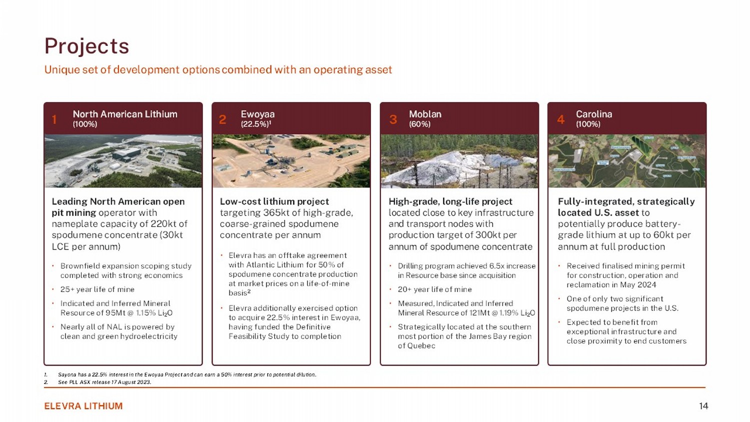 P rojects Unique set of development options combined with an operating asset ELEVRA LITHIUM 14 Leading North American open pit mining operator with nameplate capacity of 220kt of spodumene concentrate (30kt LCE per annum) • Brownfield expansion scoping study completed with strong economics • 25+ year life of mine • Indicated and Inferred Mineral Resource of 95Mt @ 1.15% Li 2 O • Nearly all of NAL is powered by clean and green hydroelectricity 1. Sayona has a 22.5% interest in the Ewoyaa Project and can earn a 50% interest prior to potential dilution. 2. See PLL ASX release 17 August 2023. North American Lithium (100%) 1 Low - cost lithium project targeting 365kt of high - grade, coarse - grained spodumene concentrate per annum • Elevra has an offtake agreement with Atlantic Lithium for 50% of spodumene concentrate production at market prices on a life - of - mine basis 2 • Elevra additionally exercised option to acquire 22.5% interest in Ewoyaa , having funded the Definitive Feasibility Study to completion Ewoyaa (22.5%) 1 2 High - grade, long - life project located close to key infrastructure and transport nodes with production target of 300kt per annum of spodumene concentrate • Drilling program achieved 6.5x increase in Resource base since acquisition • 20+ year life of mine • Measured, Indicated and Inferred Mineral Resource of 121Mt @ 1.19% Li 2 O • Strategically located at the southern most portion of the James Bay region of Quebec Moblan (60%) 3 Fully - integrated, strategically located U.S. asset to potentially produce battery - grade lithium at up to 60kt per annum at full production • Received finalised mining permit for construction, operation and reclamation in May 2024 • One of only two significant spodumene projects in the U.S. • Expected to benefit from exceptional infrastructure and close proximity to end customers Carolina (100%) 4