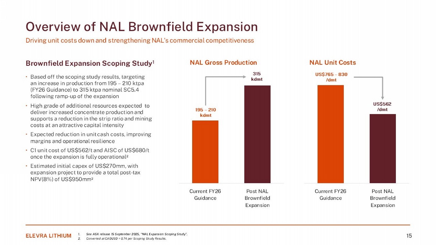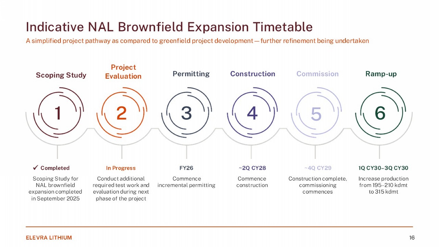 Brownfield Expansion Scoping Study 1 • Based off the scoping study results, targeting an increase in production from 19 5 – 210 ktpa (FY26 Guidance) to 315 ktpa nominal SC5.4 following ramp - up of the expansion • High grade of additional resources expected to deliver increased concentrate production and supports a reduction in the strip ratio and mining costs at an attractive capital intensity • Expected reduction in unit cash costs, improving margins and operational resilience • C1 unit cost of US$562/t and AISC of US$680/t once the expansion is fully operational 2 • Estimated initial capex of US$270mm, with expansion project to provide a total post - tax NPV(8%) of US$950mm 2 Overview of NAL Brownfield Expansion Driving unit costs down and strengthening NAL’s commercial competitiveness ELEVRA LITHIUM 15 NAL Gross Production Current FY26 Guidance Post NAL Brownfield Expansion 195 – 210 kdmt 315 kdmt NAL Unit Costs Current FY26 Guidance Post NAL Brownfield Expansion US$765 – 830 / dmt US$562 / dmt 1. See ASX release 15 September 2025, “NAL Expansion Scoping Study”. 2. Converted at CADUSD = 0.74 per Scoping Study Results.
