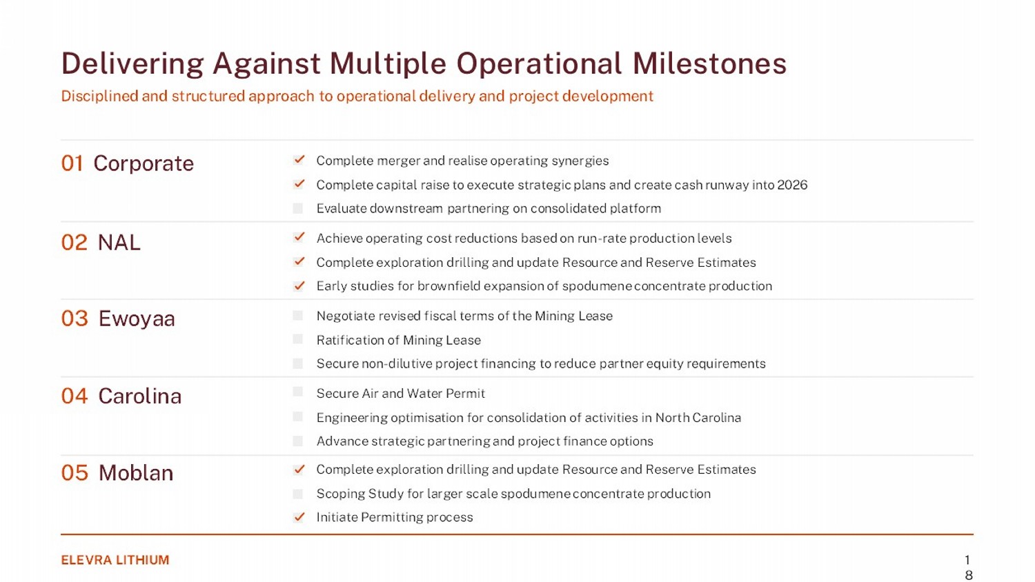 01 Corporate 02 NAL 03 Ewoyaa 04 Carolina 05 Moblan Delivering Against Multiple Operational Milestones Disciplined and structured approach to operational delivery and project development Complete merger and realise operating synergies Complete capital raise to execute strategic plans and create cash runway into 2026 Evaluate downstream partnering on consolidated platform Achieve operating cost reductions based on run - rate production levels Complete exploration drilling and update Resource and Reserve Estimates Early studies for brownfield expansion of spodumene concentrate production Negotiate revised fiscal terms of the Mining Lease Ratification of Mining Lease Secure non - dilutive project financing to reduce partner equity requirements Secure Air and Water Permit Engineering optimisation for consolidation of activities in North Carolina Advance strategic partnering and project finance options Complete exploration drilling and update Resource and Reserve Estimates Scoping Study for larger scale spodumene concentrate production Initiate Permitting process ELEVRA LITHIUM 1 8