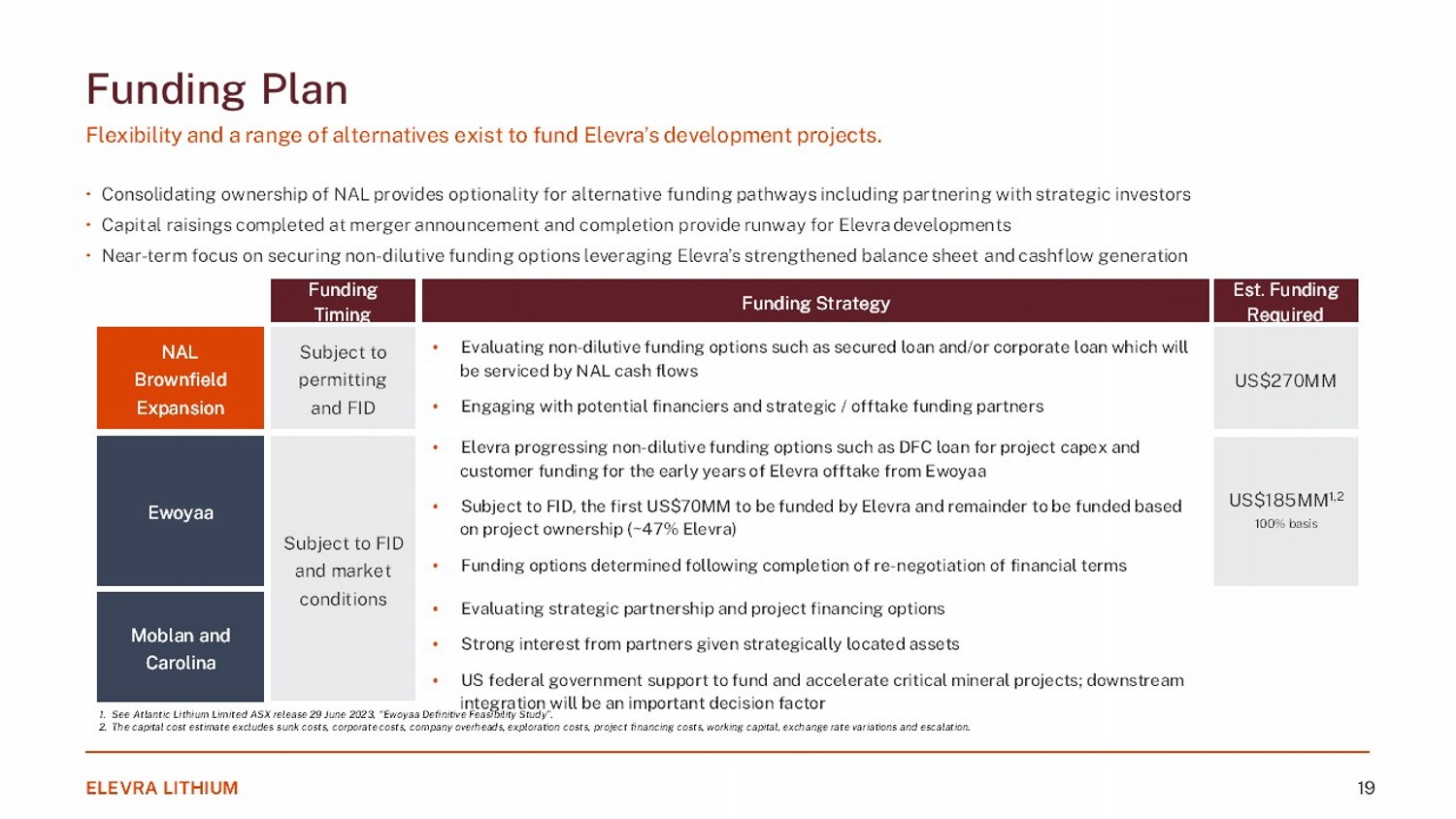 Funding Plan Flexibility and a range of alternatives exist to fund Elevra’s development projects. • Consolidating ownership of NAL provides optionality for alternative funding pathways including partnering with strategic investors • Capital raisings completed at merger announcement and completion provide runway for Elevra developments • Near - term focus on securing non - dilutive funding options leveraging Elevra’s strengthened balance sheet and cashflow generation 1. See Atlantic Lithium Limited ASX release 29 June 2023, “Ewoyaa Definitive Feasibility Study”. 2. The capital cost estimate excludes sunk costs, corporate costs, company overheads, exploration costs, project financing costs, working capital, exchange rate variations and escalation. ELEVRA LITHIUM 19 NAL Brownfield Expansion Ewoyaa Moblan and Carolina • Evaluating non - dilutive funding options such as secured loan and/or corporate loan which will be serviced by NAL cash flows • Engaging with potential financiers and strategic / offtake funding partners • Elevra progressing non - dilutive funding options such as DFC loan for project capex and customer funding for the early years of Elevra offtake from Ewoyaa • Subject to FID, the first US$70MM to be funded by Elevra and remainder to be funded based on project ownership (~47% Elevra) • Funding options determined following completion of re - negotiation of financial terms • Evaluating strategic partnership and project financing options • Strong interest from partners given strategically located assets • US federal government support to fund and accelerate critical mineral projects; downstream integration will be an important decision factor US$270MM Subject to permitting and FID Subject to FID and market conditions Funding Strategy Est. Funding Required Funding Timing US$185MM 1,2 100% basis