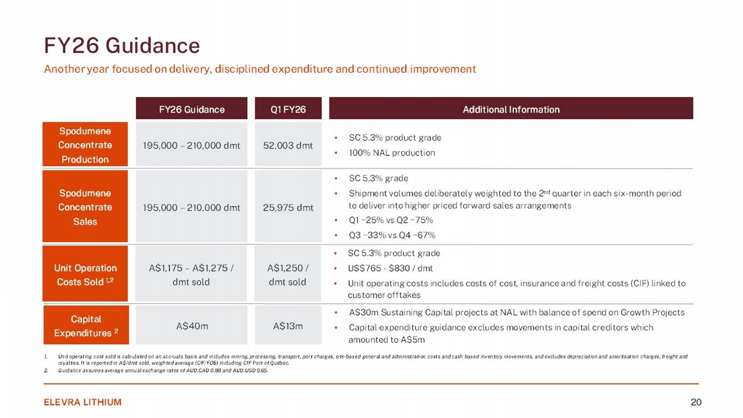 FY26 Guidance Another year focused on delivery, disciplined expenditure and continued improvement 1. Unit operating cost sold is calculated on an accruals basis and includes mining, processing, transport, port charges, site - based general and administration costs and cash based inventory movements, and excludes depreciation and amortisation charges, freight an d royalties. It is reported in A$/dmt sold, weighted average (CIF/FOB) including CIF Port of Québec. 2. Guidance assumes average annual exchange rates of AUD:CAD 0.88 and AUD:USD 0.65 . ELEVRA LITHIUM 20 Spodumene Concentrate Production Spodumene Concentrate Sales Unit Operation Costs Sold 1,2 • SC 5.3% product grade • 100% NAL production • SC 5.3% grade • Shipment volumes deliberately weighted to the 2 nd quarter in each six - month period to deliver into higher priced forward sales arrangements • Q1 ~25% vs Q2 ~75% • Q3 ~33% vs Q4 ~67% • SC 5.3% product grade • US$765 - $830 / dmt • Unit operating costs includes costs of cost, insurance and freight costs (CIF) linked to customer offtakes 195,000 – 210,000 dmt Additional Information FY26 Guidance Capital Expenditures 2 • A$30m Sustaining Capital projects at NAL with balance of spend on Growth Projects • Capital expenditure guidance excludes movements in capital creditors which amounted to A$5m 195,000 – 210,000 dmt A$1,175 – A$1,275 / dmt sold A$40m 52,003 dmt Q1 FY26 25,975 dmt A$1,250 / dmt sold A$13m