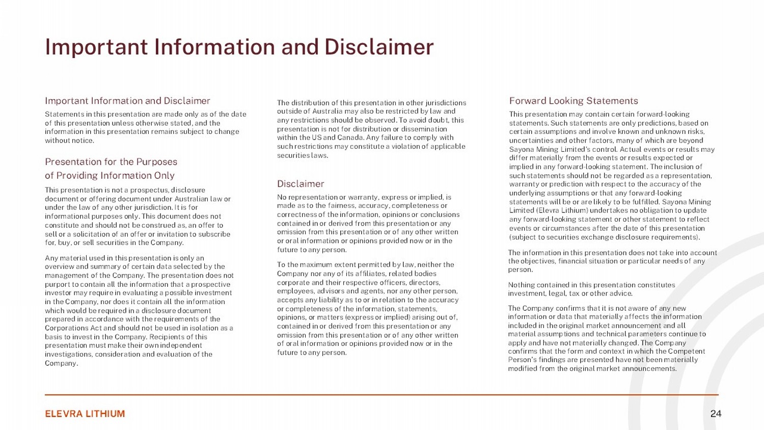 Important Information and Disclaimer ELEVRA LITHIUM 24 Important Information and Disclaimer Statements in this presentation are made only as of the date of this presentation unless otherwise stated, and the information in this presentation remains subject to change without notice. Presentation for the Purposes of Providing Information Only This presentation is not a prospectus, disclosure document or offering document under Australian law or under the law of any other jurisdiction. It is for informational purposes only. This document does not constitute and should not be construed as, an offer to sell or a solicitation of an offer or invitation to subscribe for, buy, or sell securities in the Company. Any material used in this presentation is only an overview and summary of certain data selected by the management of the Company. The presentation does not purport to contain all the information that a prospective investor may require in evaluating a possible investment in the Company, nor does it contain all the information which would be required in a disclosure document prepared in accordance with the requirements of the Corporations Act and should not be used in isolation as a basis to invest in the Company. Recipients of this presentation must make their own independent investigations, consideration and evaluation of the Company. The distribution of this presentation in other jurisdictions outside of Australia may also be restricted by law and any restrictions should be observed. To avoid doubt, this presentation is not for distribution or dissemination within the US and Canada. Any failure to comply with such restrictions may constitute a violation of applicable securities laws. Disclaimer No representation or warranty, express or implied, is made as to the fairness, accuracy, completeness or correctness of the information, opinions or conclusions contained in or derived from this presentation or any omission from this presentation or of any other written or oral information or opinions provided now or in the future to any person. To the maximum extent permitted by law, neither the Company nor any of its affiliates, related bodies corporate and their respective officers, directors, employees, advisors and agents, nor any other person, accepts any liability as to or in relation to the accuracy or completeness of the information, statements, opinions, or matters (express or implied) arising out of, contained in or derived from this presentation or any omission from this presentation or of any other written of oral information or opinions provided now or in the future to any person. Forward Looking Statements This presentation may contain certain forward - looking statements. Such statements are only predictions, based on certain assumptions and involve known and unknown risks, uncertainties and other factors, many of which are beyond Sayona Mining Limited’s control. Actual events or results may differ materially from the events or results expected or implied in any forward - looking statement. The inclusion of such statements should not be regarded as a representation, warranty or prediction with respect to the accuracy of the underlying assumptions or that any forward - looking statements will be or are likely to be fulfilled. Sayona Mining Limited (Elevra Lithium) undertakes no obligation to update any forward - looking statement or other statement to reflect events or circumstances after the date of this presentation (subject to securities exchange disclosure requirements). The information in this presentation does not take into account the objectives, financial situation or particular needs of any person. Nothing contained in this presentation constitutes investment, legal, tax or other advice. The Company confirms that it is not aware of any new information or data that materially affects the information included in the original market announcement and all material assumptions and technical parameters continue to apply and have not materially changed. The Company confirms that the form and context in which the Competent Person’s findings are presented have not been materially modified from the original market announcements.