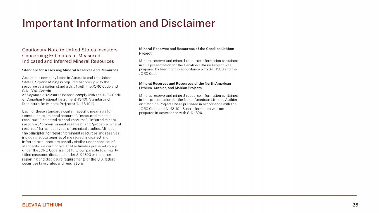 Important Information and Disclaimer ELEVRA LITHIUM 25 Cautionary Note to United States Investors Concerning Estimates of Measured, Indicated and Inferred Mineral Resources Standard for Assessing Mineral Reserves and Resources As a public company listed in Australia and the United States, Sayona Mining is required to comply with the resource estimation standards of both the JORC Code and S - K 1300. Certain of Sayona’s disclosures instead comply with the JORC Code or Canadian National Instrument 43 - 101, Standards of Disclosure for Mineral Projects (“NI 43 - 101”). Each of these standards contain specific meanings for terms such as “mineral resource”, “measured mineral resource”, “indicated mineral resource”, “inferred mineral resource”, “proven mineral reserves”, and “probable mineral reserves” for various types of technical studies. Although the principles for reporting mineral resources and reserves, including subcategories of measured, indicated, and inferred resources, are broadly similar under each set of standards, we caution you that estimates prepared solely under the JORC Code are not fully comparable to similarly titled measures disclosed under S - K 1300 or the other reporting and disclosure requirements of the U.S. federal securities laws, rules and regulations. Mineral Reserves and Resources of the Carolina Lithium Project Mineral reserve and mineral resource information contained in this presentation for the Carolina Lithium Project was prepared by Piedmont in accordance with S - K 1300 and the JORC Code. Mineral Reserves and Resources of the North American Lithium, Authier, and Moblan Projects Mineral reserve and mineral resource information contained in this presentation for the North American Lithium, Authier, and Moblan Projects were prepared in accordance with the JORC Code and NI 43 - 101. Such information was not prepared in accordance with S - K 1300.