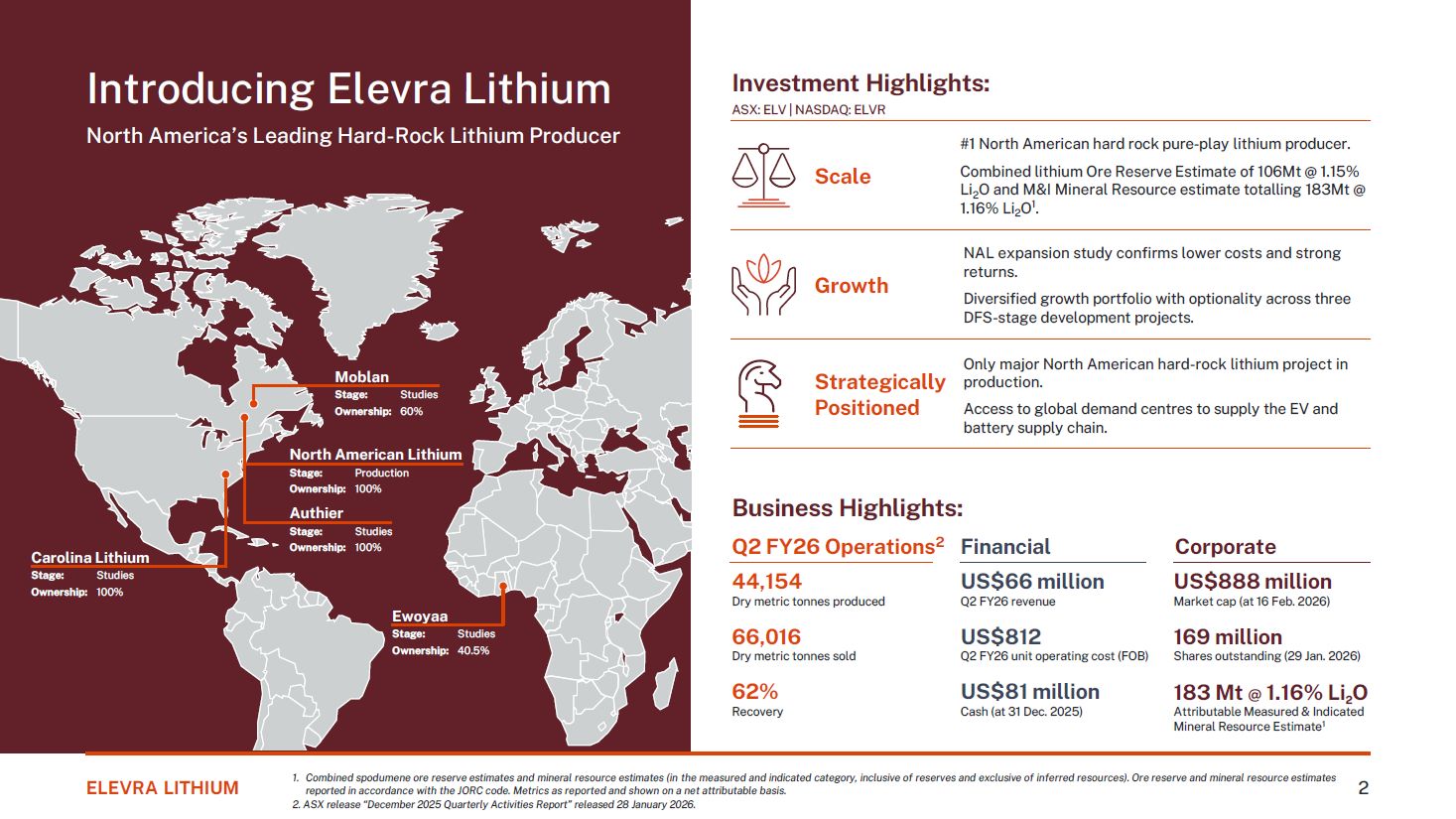 ELEVRA LITHIUM  2  Introducing Elevra Lithium  North America’s Leading Hard-Rock Lithium Producer  Business Highlights:  Q2 FY26 Operations2 Financial  44,154  Dry metric tonnes produced  66,016  Dry metric tonnes sold  62%  Recovery  US$66 million  Q2 FY26 revenue  US$812  Q2 FY26 unit operating cost (FOB)  US$81 million  Cash (at 31 Dec. 2025)  Corporate  US$888 million  Market cap (at 16 Feb. 2026)  169 million  Shares outstanding (29 Jan. 2026)  183 Mt @ 1.16% Li2O  Attributable Measured & Indicated Mineral Resource Estimate1  Investment Highlights:  ASX: ELV | NASDAQ: ELVR  #1 North American hard rock pure-play lithium producer.  Combined lithium Ore Reserve Estimate of 106Mt @ 1.15% Li2O and M&I Mineral Resource estimate totalling 183Mt @ 1.16% Li2O1.  Scale  Growth  Strategically  Positioned  NAL expansion study confirms lower costs and strong returns.  Diversified growth portfolio with optionality across three DFS-stage development projects.  Only major North American hard-rock lithium project in production.  Access to global demand centres to supply the EV and battery supply chain.  North American Lithium  Stage:  Production  Ownership:  100%  Authier  Stage:  Studies  Ownership:  100%  Moblan  Stage:  Studies  Ownership:  60%  Carolina Lithium  Stage:  Studies  Ownership:  100%  Ewoyaa  Stage:  Studies  Ownership:  40.5%  Combined spodumene ore reserve estimates and mineral resource estimates (in the measured and indicated category, inclusive of reserves and exclusive of inferred resources). Ore reserve and mineral resource estimates reported in accordance with the JORC code. Metrics as reported and shown on a net attributable basis.  ASX release “December 2025 Quarterly Activities Report” released 28 January 2026.