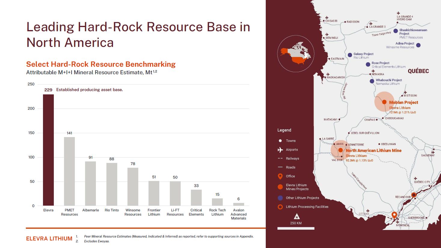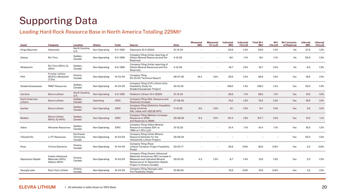 1. All estimates in table shown on 100% Basis.  ELEVRA LITHIUM  20  Asset  Company  Location  Status  Code  Source  Date  Measured  (Mt)  Measured (% Li2O)  Indicated  (Mt)  Indicated (%Li2O)  Total M+I  (Mt)  M+I (%Li2O)  M+I Inclusive of Reserves  Inferred  (Mt)  Inferred (%Li2O)  Kings Mountain  Albemarle  North Carolina, U.S.  Non-Operating  S-K 1300  Albemarle 10-K (2024)  31-12-24  -  -  63.9  1.4%  63.9  1.4%  No  27.6  1.2%  Galaxy  Rio Tinto  Québec, Canada  Non-Operating  S-K 1300  Company Filing (Initial reporting of lithium Mineral Resources and Ore Reserves)  4-12-25  -  -  18.1  1.1%  18.1  1.1%  No  55.9  1.3%  Whabouchi  Rio Tinto (50%); IQ (50%)  Québec, Canada  Non-Operating  S-K 1300  Company Filing (Initial reporting of lithium Mineral Resources and Ore Reserves)  4-12-25  -  -  18.7  1.5%  18.7  1.5%  No  8.3  1.3%  PAK  Frontier Lithium (92.5%); Mitsubishi  (7.5%)  Ontario,  Canada  Non-Operating  NI 43-101  Company Filing  (NI 43-101 Technical Report)  09-07-25  16.4  1.6%  20.5  1.5%  36.9  1.6%  Yes  18.6  1.5%  Shaakichiuwaanaan  PMET Resources  Québec, Canada  Non-Operating  NI 43-101  Company Filing (CV5 Lithium-Only Feasibility Study for Shaakichiuwaanaan Project)  20-10-25  -  -  108.0  1.4%  108.0  1.4%  Yes  33.3  1.3%  Carolina  Elevra Lithium  North Carolina, U.S.  Non-Operating  S-K 1300  Piedmont Lithium 10-K (2024)  31-12-24  -  -  28.2  1.1%  28.2  1.1%  Yes  15.9  1.0%  North American  Lithium  Elevra Lithium  Québec,  Canada  Operating  JORC  Company Filing (NAL Resource and  Reserves Increase)  27-08-25  -  -  76.2  1.2%  76.2  1.2%  Yes  18.9  1.0%  Authier  Elevra Lithium  Québec,  Canada  Non-Operating  JORC  Company Filing (Definitive Feasibility Study Confirms  NAL Value with A$2.2B NPV)  11-10-22  6.0  1.0%  8.1  1.0%  14.1  1.0%  Yes  2.9  1.0%  Moblan  Elevra Lithium (60%); IQ (40%)  Québec, Canada  Non-Operating  JORC  Company Filing (Moblan Increases Resource to 121Mt  and Reserves to 48Mt)  25-08-25  6.3  1.5%  101.4  1.2%  107.7  1.2%  Yes  13.3  1.1%  Adina  Winsome Resources  Québec, Canada  Non-Operating  JORC  Company Filing (Adina Mineral Resource Increases 33% to 78Mt at 1.15% Li2O)  31-12-23  -  -  61.4  1.1%  61.4  1.1%  Yes  16.5  1.2%  Yellowknife  Li-FT Resources  Northwest Territories, Canada  Non-Operating  NI 43-101  Company Filing (Initial Mineral Resource Estimate for the Yellowknife Lithium Project)  25-09-24  -  -  -  -  -  -  Yes  50.4  1.0%  Rose  Critical Elements  Ontario, Canada  Non-Operating  NI 43-101  Company Filing (Rose  Lithium-Tantalum Project Feasibility Study)  03-04-17  -  -  30.6  0.9%  30.6  0.9%  Yes  2.4  0.8%  Separation Rapids  Avalon Advanced Materials (40%);  Sibelco (60%)  Ontario, Canada  Non-Operating  NI 43-101  Company Filing (Avalon Advanced Materials Announces 28% Increase in Measures and Indicated Mineral Resources at JV Separation Rapids Project in Ontario Canada)  30-01-25  4.3  1.3%  8.7  1.4%  13.0  1.3%  Yes  2.3  1.5%  Georgia Lake  Rock Tech Lithium  Ontario, Canada  Non-Operating  NI 43-101  Company Filing (Georgia Lake Pre-Feasibility Study)  10-08-23  -  -  10.6  0.9%  10.6  0.9%  Yes  4.2  1.0%  Supporting Data  Leading Hard Rock Resource Base in North America Totalling 229Mt1
