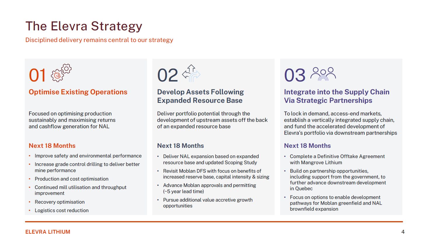 01  Optimise Existing Operations  Focused on optimising production sustainably and maximising returns and cashflow generation for NAL  Next 18 Months  Improve safety and environmental performance  Increase grade control drilling to deliver better mine performance  Production and cost optimisation  Continued mill utilisation and throughput improvement  Recovery optimisation  Logistics cost reduction  02  Develop Assets Following Expanded Resource Base  Deliver portfolio potential through the development of upstream assets off the back of an expanded resource base  Next 18 Months  Deliver NAL expansion based on expanded resource base and updated Scoping Study  Revisit Moblan DFS with focus on benefits of increased reserve base, capital intensity & sizing  Advance Moblan approvals and permitting  (~5 year lead time)  Pursue additional value accretive growth opportunities  03  Integrate into the Supply Chain Via Strategic Partnerships  To lock in demand, access-end markets, establish a vertically integrated supply chain, and fund the accelerated development of Elevra’s portfolio via downstream partnerships  Next 18 Months  Complete a Definitive Offtake Agreement with Mangrove Lithium  Build on partnership opportunities, including support from the government, to further advance downstream development in Quebec  Focus on options to enable development pathways for Moblan greenfield and NAL brownfield expansion  The Elevra Strategy  Disciplined delivery remains central to our strategy  ELEVRA LITHIUM  4