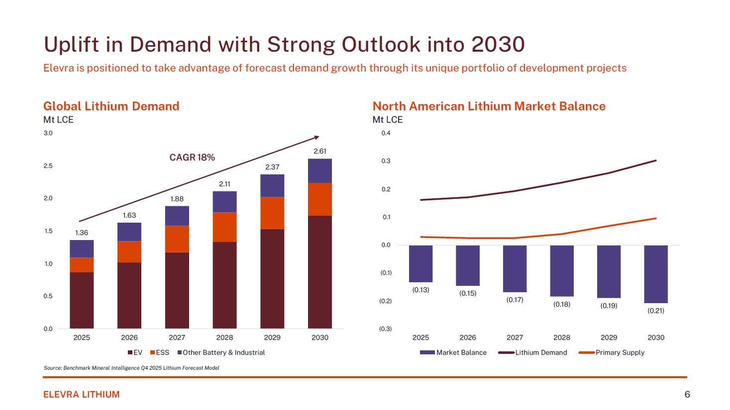 Uplift in Demand with Strong Outlook into 2030  Elevra is positioned to take advantage of forecast demand growth through its unique portfolio of development projects  North American Lithium Market Balance  Mt LCE  0.4  ELEVRA LITHIUM  6  1.36  1.63  1.88  2.11  2.37  2.61  Global Lithium Demand  Mt LCE  3.0  0.0  0.5  1.0  1.5  2.0  2.5  2025  2026  2027 2028  2029  2030  EV ESS Other Battery & Industrial  Source: Benchmark Mineral Intelligence Q4 2025 Lithium Forecast Model  CAGR 18%  (0.13)  (0.15)  (0.17)  (0.18)  (0.19)  (0.21)  (0.3)  (0.2)  (0.1)  0.0  0.1  0.2  0.3  2025  2026  2029  2030  Market Balance  2027 2028  Lithium Demand  Primary Supply