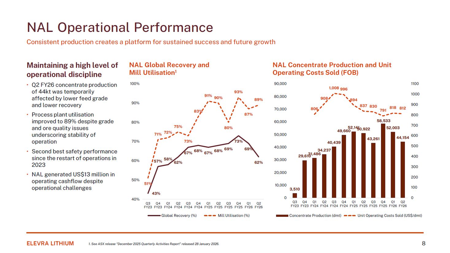 Maintaining a high level of operational discipline  Q2 FY26 concentrate production of 44kt was temporarily affected by lower feed grade and lower recovery  Process plant utilisation improved to 89% despite grade and ore quality issues underscoring stability of operation  Second best safety performance since the restart of operations in 2023  NAL generated US$13 million in operating cashflow despite operational challenges  NAL Operational Performance  Consistent production creates a platform for sustained success and future growth  NAL Global Recovery and  Mill Utilisation1  100%  ELEVRA LITHIUM  8  43%  57%  58%  62%  67%  68%  67%  68% 69%  73%  69%  62%  51%  71% 72%  75%  73%  83%  91% 90%  80%  93%  87%  89%  40%  50%  60%  70%  80%  90%  Q3 Q4 Q1 Q2 Q3 Q4 Q1 Q2 Q3 Q4 Q1 Q2  FY23 FY23 FY24 FY24 FY24 FY24 FY25 FY25 FY25 FY25 FY26 FY26  Global Recovery (%) Mill Utilisation (%)  3,510  29,610  31,486  34,237  40,439  49,660  52,14510,922  43,261  58,533  52,003  44,154 600  806  908  1,008  NAL Concentrate Production and Unit  Operating Costs Sold (FOB)  90,000  996  894  837 830  791 818 812  0  100  200  300  400  500  700  800  900  1000  1100  0  10,000  20,000  30,000  40,000  50,000  60,000  70,000  80,000  Q3 Q4 Q1 Q2 Q3 Q4 Q1 Q2 Q3 Q4 Q1 Q2  FY23 FY23 FY24 FY24 FY24 FY24 FY25 FY25 FY25 FY25 FY26 FY26  Concentrate Production (dmt) Unit Operating Costs Sold (US$/dmt)  1. See ASX release “December 2025 Quarterly Activities Report” released 28 January 2026.