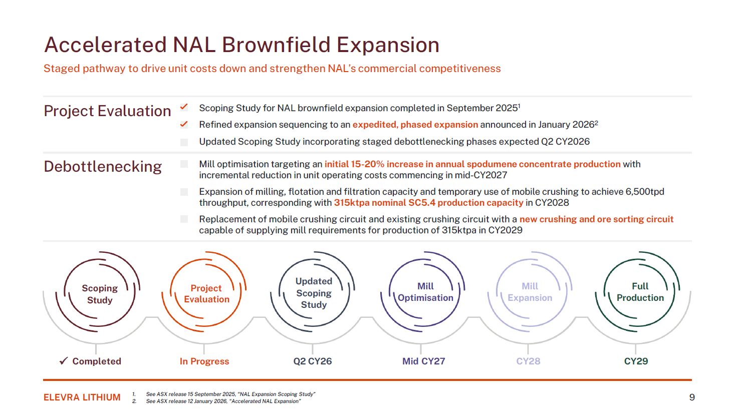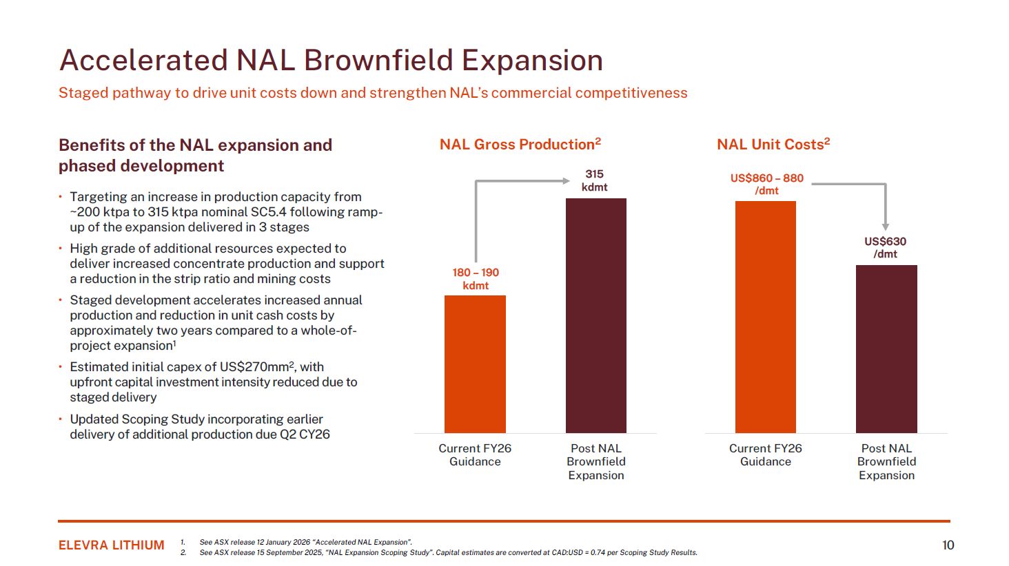 Accelerated NAL Brownfield Expansion  Staged pathway to drive unit costs down and strengthen NAL’s commercial competitiveness  ELEVRA LITHIUM  9  See ASX release 15 September 2025, “NAL Expansion Scoping Study”  See ASX release 12 January 2026, “Accelerated NAL Expansion”  Project Evaluation  Debottlenecking  Scoping Study for NAL brownfield expansion completed in September 20251  Refined expansion sequencing to an expedited, phased expansion announced in January 20262 Updated Scoping Study incorporating staged debottlenecking phases expected Q2 CY2026  Mill optimisation targeting an initial 15-20% increase in annual spodumene concentrate production with  incremental reduction in unit operating costs commencing in mid-CY2027  Expansion of milling, flotation and filtration capacity and temporary use of mobile crushing to achieve 6,500tpd throughput, corresponding with 315ktpa nominal SC5.4 production capacity in CY2028  Replacement of mobile crushing circuit and existing crushing circuit with a new crushing and ore sorting circuit  capable of supplying mill requirements for production of 315ktpa in CY2029  Scoping  Study  Project Evaluation  Updated Scoping Study  Mill  Optimisation  Mill  Expansion  Full  Production  In Progress  Q2 CY26  Mid CY27  CY29  CY28  Completed