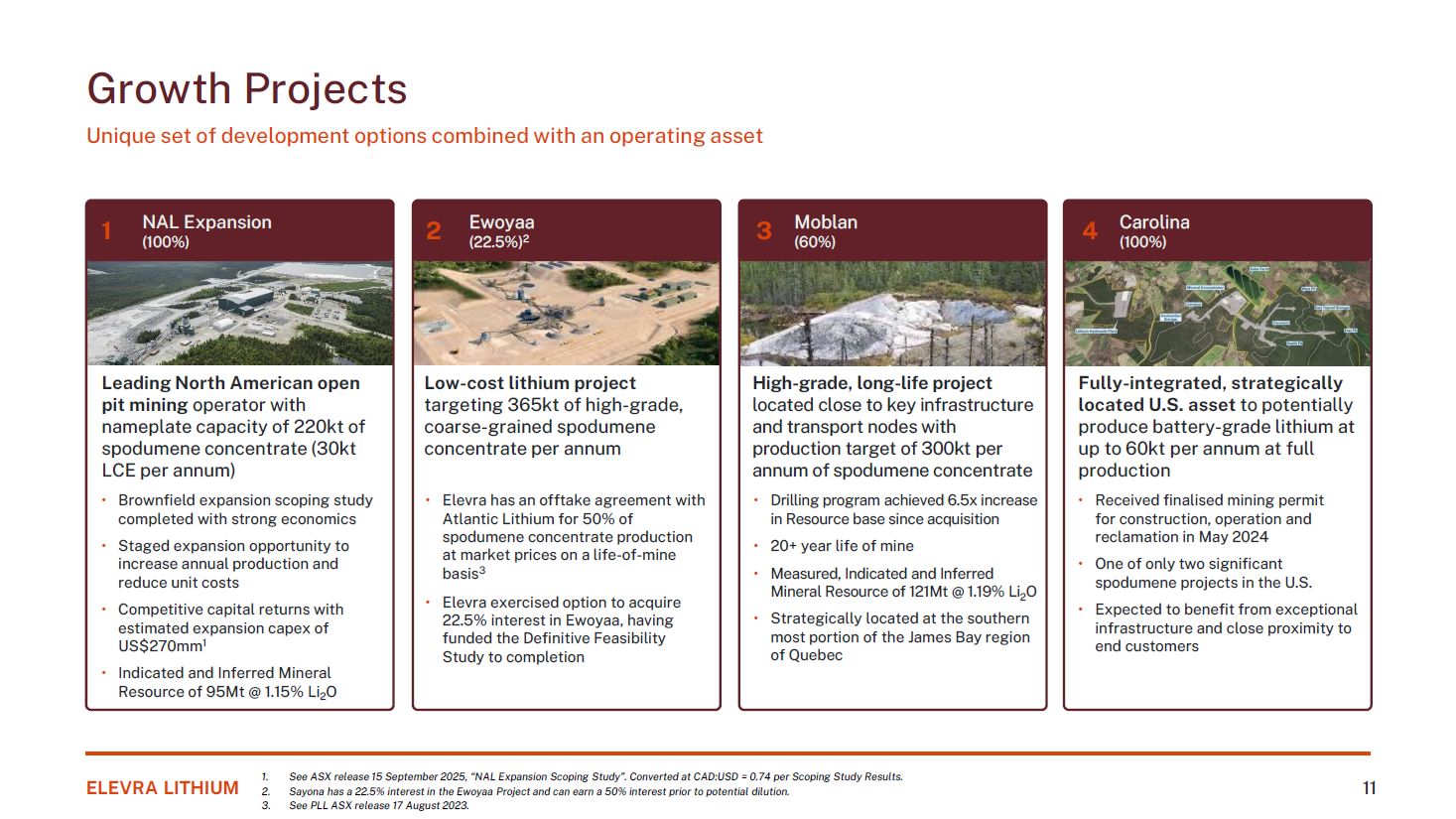 Growth Projects  Unique set of development options combined with an operating asset  ELEVRA LITHIUM  11  Leading North American open pit mining operator with nameplate capacity of 220kt of spodumene concentrate (30kt LCE per annum)  See ASX release 15 September 2025, “NAL Expansion Scoping Study”. Converted at CAD:USD = 0.74 per Scoping Study Results.  Sayona has a 22.5% interest in the Ewoyaa Project and can earn a 50% interest prior to potential dilution.  See PLL ASX release 17 August 2023.  NAL Expansion  (100%)  1  Low-cost lithium project targeting 365kt of high-grade, coarse-grained spodumene concentrate per annum  Ewoyaa  (22.5%)2  2  High-grade, long-life project located close to key infrastructure and transport nodes with production target of 300kt per annum of spodumene concentrate  Moblan  (60%)  3  Fully-integrated, strategically located U.S. asset to potentially produce battery-grade lithium at up to 60kt per annum at full production  Carolina  (100%)  4  Brownfield expansion scoping study completed with strong economics  Staged expansion opportunity to increase annual production and reduce unit costs  Competitive capital returns with estimated expansion capex of US$270mm1  Indicated and Inferred Mineral Resource of 95Mt @ 1.15% Li2O  Elevra has an offtake agreement with Atlantic Lithium for 50% of spodumene concentrate production at market prices on a life-of-mine basis3  Elevra exercised option to acquire 22.5% interest in Ewoyaa, having funded the Definitive Feasibility Study to completion  Drilling program achieved 6.5x increase in Resource base since acquisition  20+ year life of mine  Measured, Indicated and Inferred Mineral Resource of 121Mt @ 1.19% Li2O  Strategically located at the southern most portion of the James Bay region of Quebec  Received finalised mining permit for construction, operation and reclamation in May 2024  One of only two significant  spodumene projects in the U.S.  Expected to benefit from exceptional infrastructure and close proximity to end customers