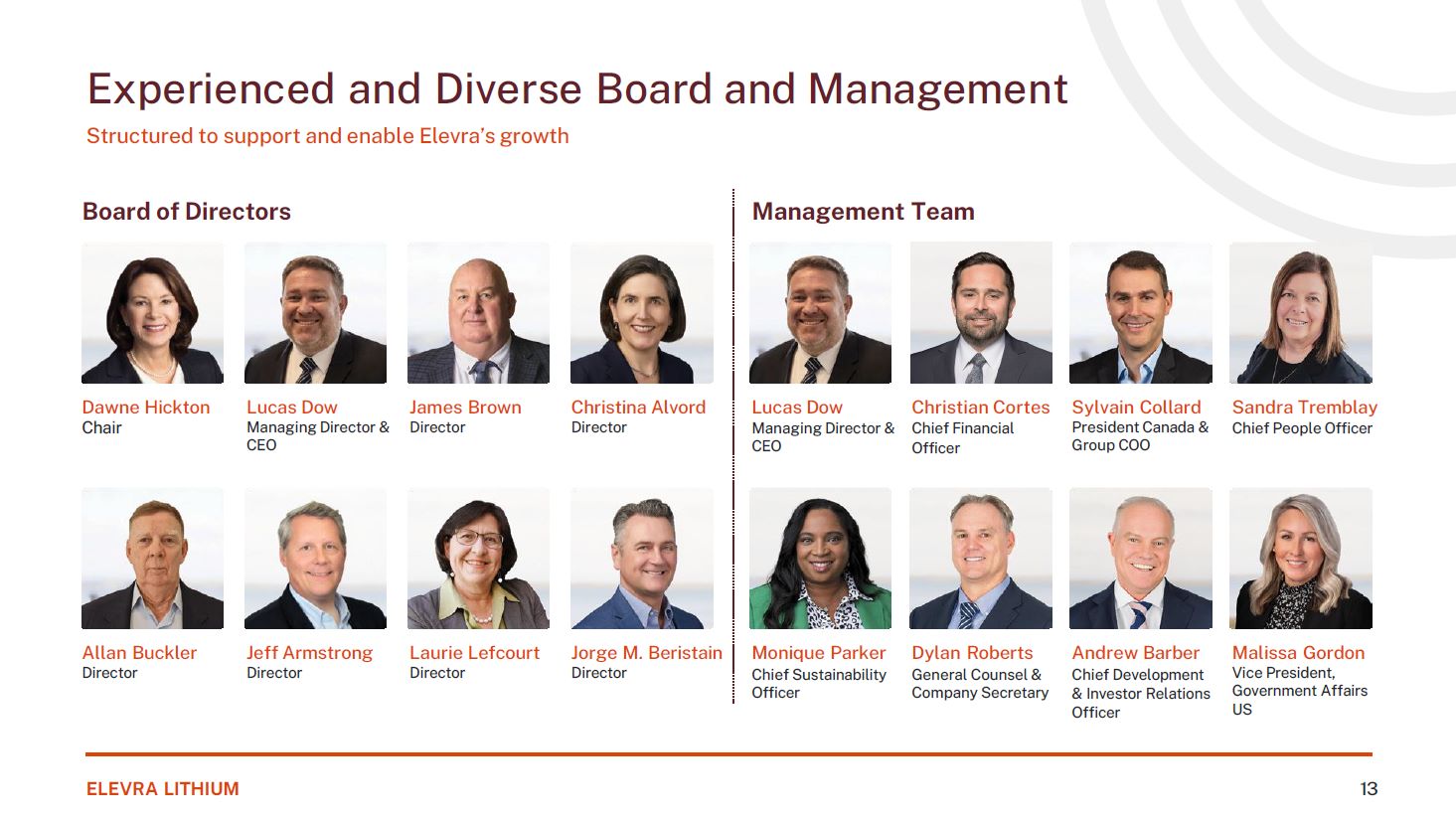 Experienced and Diverse Board and Management  Structured to support and enable Elevra’s growth  Board of Directors  Dawne Hickton  Chair  Allan Buckler  Director  Lucas Dow Managing Director & CEO  Jeff Armstrong  Director  James Brown  Director  Laurie Lefcourt  Director  Christina Alvord  Director  Jorge M. Beristain  Director  ELEVRA LITHIUM  13  Management Team  Monique Parker Chief Sustainability Officer  Christian Cortes Chief Financial Officer  Lucas Dow Managing Director & CEO  Dylan Roberts General Counsel & Company Secretary  Sylvain Collard President Canada & Group COO  Andrew Barber Chief Development & Investor Relations Officer  Sandra Tremblay  Chief People Officer  Malissa Gordon Vice President, Government Affairs US