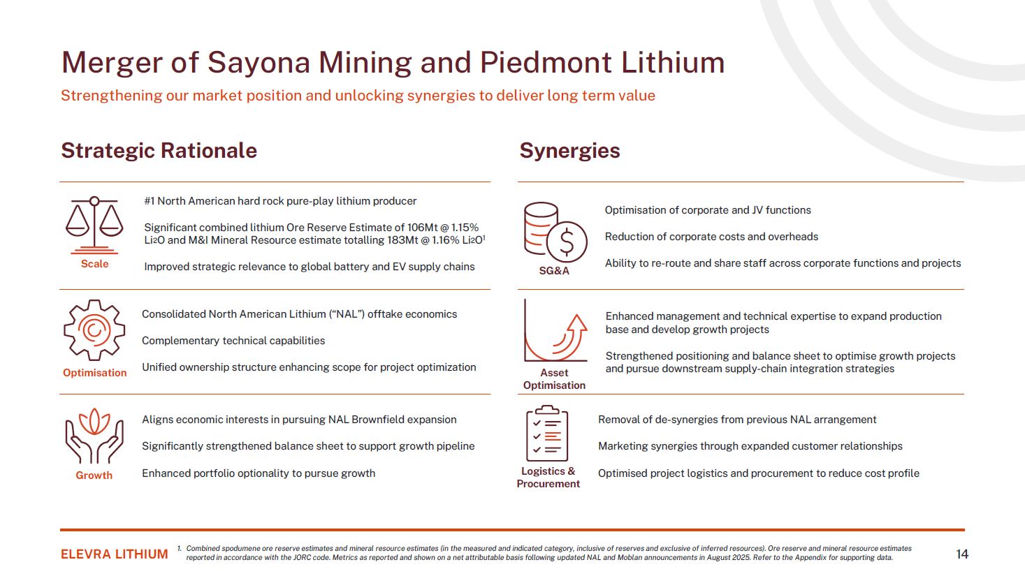 #1 North American hard rock pure-play lithium producer  Significant combined lithium Ore Reserve Estimate of 106Mt @ 1.15% Li2O and M&I Mineral Resource estimate totalling 183Mt @ 1.16% Li2O1  Improved strategic relevance to global battery and EV supply chains  Aligns economic interests in pursuing NAL Brownfield expansion  Significantly strengthened balance sheet to support growth pipeline  Enhanced portfolio optionality to pursue growth  Merger of Sayona Mining and Piedmont Lithium  Strengthening our market position and unlocking synergies to deliver long term value  1. Combined spodumene ore reserve estimates and mineral resource estimates (in the measured and indicated category, inclusive of reserves and exclusive of inferred resources). Ore reserve and mineral resource estimates reported in accordance with the JORC code. Metrics as reported and shown on a net attributable basis following updated NAL and Moblan announcements in August 2025. Refer to the Appendix for supporting data.  ELEVRA LITHIUM  14  Scale  Optimisation  Growth  Strategic Rationale Synergies  Consolidated North American Lithium (“NAL”) offtake economics  Complementary technical capabilities  Unified ownership structure enhancing scope for project optimization  SG&A  Optimisation of corporate and JV functions  Reduction of corporate costs and overheads  Ability to re-route and share staff across corporate functions and projects  Asset  Optimisation  Logistics & Procurement  Enhanced management and technical expertise to expand production base and develop growth projects  Strengthened positioning and balance sheet to optimise growth projects and pursue downstream supply-chain integration strategies  Removal of de-synergies from previous NAL arrangement  Marketing synergies through expanded customer relationships  Optimised project logistics and procurement to reduce cost profile