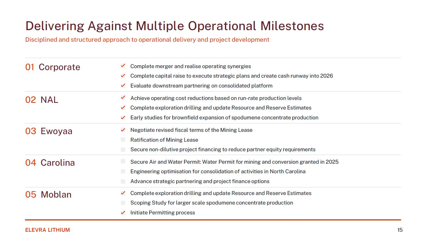 01 Corporate  02 NAL  03 Ewoyaa  04 Carolina  05 Moblan  Delivering Against Multiple Operational Milestones  Disciplined and structured approach to operational delivery and project development  Complete merger and realise operating synergies  Complete capital raise to execute strategic plans and create cash runway into 2026 Evaluate downstream partnering on consolidated platform  Achieve operating cost reductions based on run-rate production levels Complete exploration drilling and update Resource and Reserve Estimates Early studies for brownfield expansion of spodumene concentrate production  Negotiate revised fiscal terms of the Mining Lease Ratification of Mining Lease  Secure non-dilutive project financing to reduce partner equity requirements  Secure Air and Water Permit: Water Permit for mining and conversion granted in 2025 Engineering optimisation for consolidation of activities in North Carolina  Advance strategic partnering and project finance options  Complete exploration drilling and update Resource and Reserve Estimates Scoping Study for larger scale spodumene concentrate production Initiate Permitting process  ELEVRA LITHIUM  15
