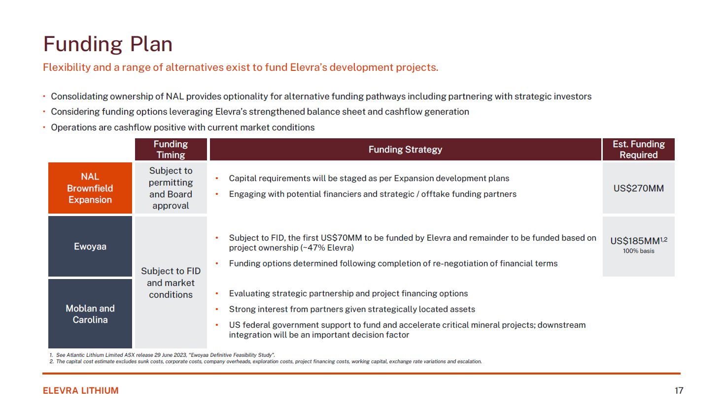 Funding Plan  Flexibility and a range of alternatives exist to fund Elevra’s development projects.  Consolidating ownership of NAL provides optionality for alternative funding pathways including partnering with strategic investors  Considering funding options leveraging Elevra’s strengthened balance sheet and cashflow generation  Operations are cashflow positive with current market conditions  See Atlantic Lithium Limited ASX release 29 June 2023, “Ewoyaa Definitive Feasibility Study”.  The capital cost estimate excludes sunk costs, corporate costs, company overheads, exploration costs, project financing costs, working capital, exchange rate variations and escalation.  ELEVRA LITHIUM  17  Funding Timing  Funding Strategy  Est. Funding Required  NAL  Brownfield  Expansion  Subject to permitting and Board approval  Capital requirements will be staged as per Expansion development plans  Engaging with potential financiers and strategic / offtake funding partners   Subject to FID, the first US$70MM to be funded by Elevra and remainder to be funded based on project ownership (~47% Elevra)  Funding options determined following completion of re-negotiation of financial terms  US$270MM  Ewoyaa  Subject to FID and market conditions  US$185MM1,2  100% basis  Moblan and  Carolina  Evaluating strategic partnership and project financing options  Strong interest from partners given strategically located assets   US federal government support to fund and accelerate critical mineral projects; downstream integration will be an important decision factor