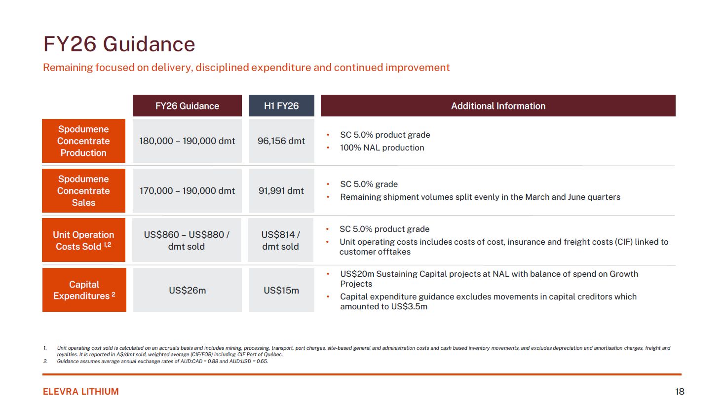 FY26 Guidance  Remaining focused on delivery, disciplined expenditure and continued improvement  Unit operating cost sold is calculated on an accruals basis and includes mining, processing, transport, port charges, site-based general and administration costs and cash based inventory movements, and excludes depreciation and amortisation charges, freight and royalties. It is reported in A$/dmt sold, weighted average (CIF/FOB) including CIF Port of Québec.  Guidance assumes average annual exchange rates of AUD:CAD = 0.88 and AUD:USD = 0.65.  ELEVRA LITHIUM  18  Spodumene Concentrate Production  Spodumene Concentrate Sales  Unit Operation Costs Sold 1,2  SC 5.0% product grade  100% NAL production  SC 5.0% grade  Remaining shipment volumes split evenly in the March and June quarters  SC 5.0% product grade   Unit operating costs includes costs of cost, insurance and freight costs (CIF) linked to customer offtakes  180,000 – 190,000 dmt  Additional Information  FY26 Guidance  Capital  Expenditures 2   US$20m Sustaining Capital projects at NAL with balance of spend on Growth Projects   Capital expenditure guidance excludes movements in capital creditors which amounted to US$3.5m  170,000 – 190,000 dmt  US$860 – US$880 /  dmt sold  US$26m  96,156 dmt  H1 FY26  91,991 dmt  US$814 /  dmt sold  US$15m