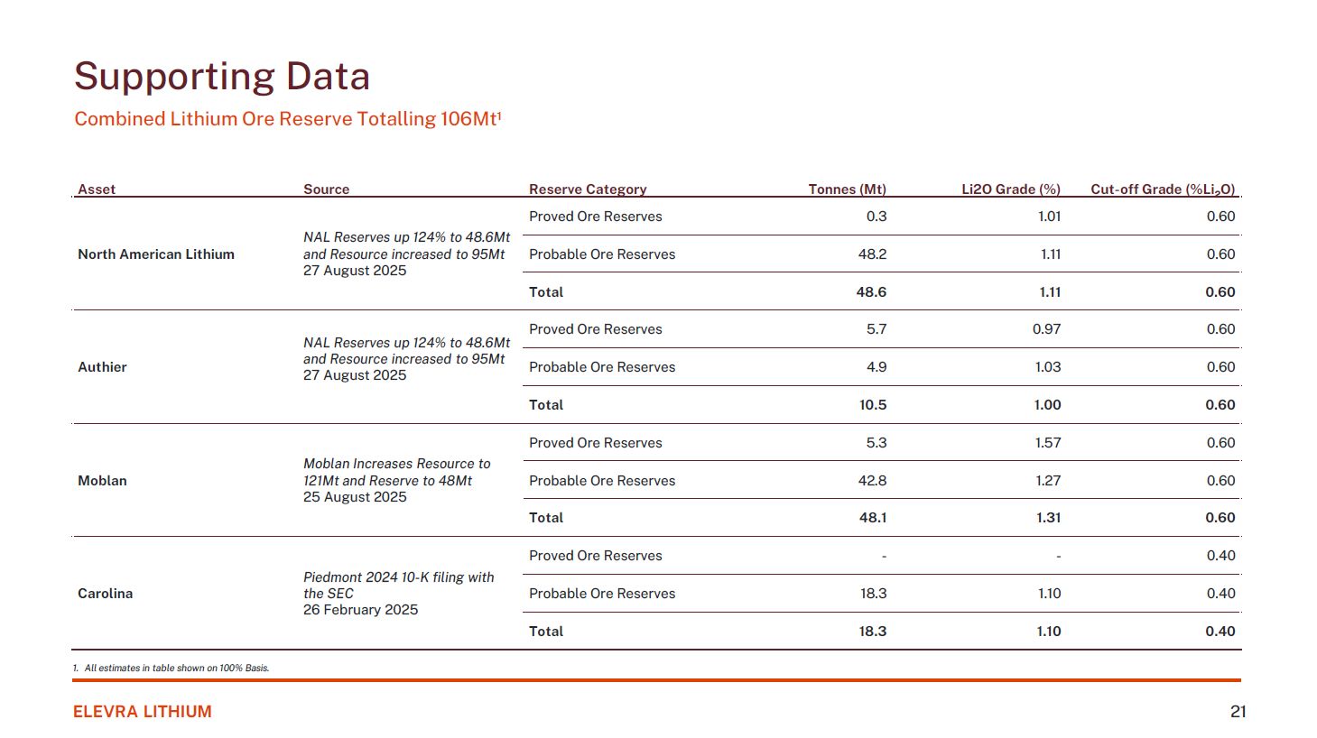 ELEVRA LITHIUM  21  Asset  Source  Reserve Category  Tonnes (Mt)  Li2O Grade (%)  Cut-off Grade (%Li2O)  NAL Reserves up 124% to 48.6Mt and Resource increased to 95Mt 27 August 2025  Proved Ore Reserves  0.3  1.01  0.60  North American Lithium  Probable Ore Reserves  48.2  1.11  0.60  Total  48.6  1.11  0.60  NAL Reserves up 124% to 48.6Mt and Resource increased to 95Mt 27 August 2025  Proved Ore Reserves  5.7  0.97  0.60  Authier  Probable Ore Reserves  4.9  1.03  0.60  Total  10.5  1.00  0.60  Moblan Increases Resource to 121Mt and Reserve to 48Mt 25 August 2025  Proved Ore Reserves  5.3  1.57  0.60  Moblan  Probable Ore Reserves  42.8  1.27  0.60  Total  48.1  1.31  0.60  Piedmont 2024 10-K filing with  the SEC  26 February 2025  Proved Ore Reserves  -  -  0.40  Carolina  Probable Ore Reserves  18.3  1.10  0.40  Total  18.3  1.10  0.40  Supporting Data  Combined Lithium Ore Reserve Totalling 106Mt1  1. All estimates in table shown on 100% Basis.