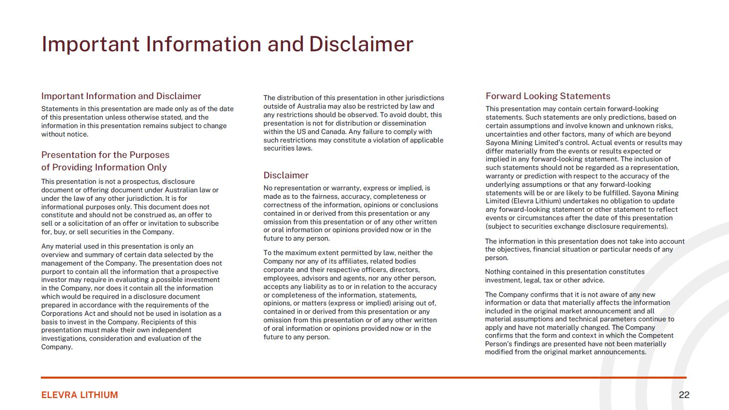 Important Information and Disclaimer  ELEVRA LITHIUM  22  Important Information and Disclaimer  Statements in this presentation are made only as of the date of this presentation unless otherwise stated, and the information in this presentation remains subject to change without notice.  Presentation for the Purposes  of Providing Information Only  This presentation is not a prospectus, disclosure document or offering document under Australian law or under the law of any other jurisdiction. It is for informational purposes only. This document does not constitute and should not be construed as, an offer to sell or a solicitation of an offer or invitation to subscribe for, buy, or sell securities in the Company.  Any material used in this presentation is only an overview and summary of certain data selected by the management of the Company. The presentation does not purport to contain all the information that a prospective investor may require in evaluating a possible investment in the Company, nor does it contain all the information which would be required in a disclosure document prepared in accordance with the requirements of the Corporations Act and should not be used in isolation as a basis to invest in the Company. Recipients of this presentation must make their own independent investigations, consideration and evaluation of the Company.  The distribution of this presentation in other jurisdictions outside of Australia may also be restricted by law and any restrictions should be observed. To avoid doubt, this presentation is not for distribution or dissemination within the US and Canada. Any failure to comply with such restrictions may constitute a violation of applicable securities laws.  Disclaimer  No representation or warranty, express or implied, is made as to the fairness, accuracy, completeness or correctness of the information, opinions or conclusions contained in or derived from this presentation or any omission from this presentation or of any other written or oral information or opinions provided now or in the future to any person.  To the maximum extent permitted by law, neither the Company nor any of its affiliates, related bodies corporate and their respective officers, directors, employees, advisors and agents, nor any other person, accepts any liability as to or in relation to the accuracy or completeness of the information, statements, opinions, or matters (express or implied) arising out of, contained in or derived from this presentation or any omission from this presentation or of any other written of oral information or opinions provided now or in the future to any person.  Forward Looking Statements  This presentation may contain certain forward-looking statements. Such statements are only predictions, based on certain assumptions and involve known and unknown risks, uncertainties and other factors, many of which are beyond Sayona Mining Limited’s control. Actual events or results may differ materially from the events or results expected or implied in any forward-looking statement. The inclusion of such statements should not be regarded as a representation, warranty or prediction with respect to the accuracy of the underlying assumptions or that any forward-looking statements will be or are likely to be fulfilled. Sayona Mining Limited (Elevra Lithium) undertakes no obligation to update any forward-looking statement or other statement to reflect events or circumstances after the date of this presentation (subject to securities exchange disclosure requirements).  The information in this presentation does not take into account the objectives, financial situation or particular needs of any person.  Nothing contained in this presentation constitutes investment, legal, tax or other advice.  The Company confirms that it is not aware of any new information or data that materially affects the information included in the original market announcement and all material assumptions and technical parameters continue to apply and have not materially changed. The Company confirms that the form and context in which the Competent Person’s findings are presented have not been materially modified from the original market announcements.