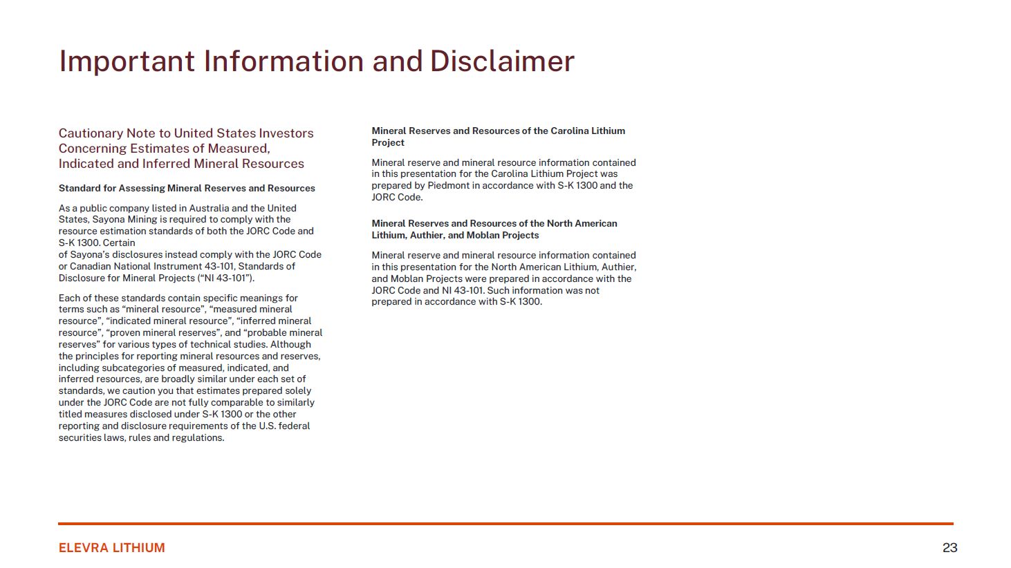 Important Information and Disclaimer  ELEVRA LITHIUM  23  Cautionary Note to United States Investors Concerning Estimates of Measured, Indicated and Inferred Mineral Resources  Standard for Assessing Mineral Reserves and Resources  As a public company listed in Australia and the United States, Sayona Mining is required to comply with the resource estimation standards of both the JORC Code and S-K 1300. Certain  of Sayona’s disclosures instead comply with the JORC Code  or Canadian National Instrument 43-101, Standards of  Disclosure for Mineral Projects (“NI 43-101”).  Each of these standards contain specific meanings for  terms such as “mineral resource”, “measured mineral  resource”, “indicated mineral resource”, “inferred mineral resource”, “proven mineral reserves”, and “probable mineral reserves” for various types of technical studies. Although the principles for reporting mineral resources and reserves, including subcategories of measured, indicated, and inferred resources, are broadly similar under each set of standards, we caution you that estimates prepared solely under the JORC Code are not fully comparable to similarly titled measures disclosed under S-K 1300 or the other reporting and disclosure requirements of the U.S. federal securities laws, rules and regulations.  Mineral Reserves and Resources of the Carolina Lithium Project  Mineral reserve and mineral resource information contained in this presentation for the Carolina Lithium Project was prepared by Piedmont in accordance with S-K 1300 and the JORC Code.  Mineral Reserves and Resources of the North American  Lithium, Authier, and Moblan Projects  Mineral reserve and mineral resource information contained in this presentation for the North American Lithium, Authier, and Moblan Projects were prepared in accordance with the JORC Code and NI 43-101. Such information was not prepared in accordance with S-K 1300.