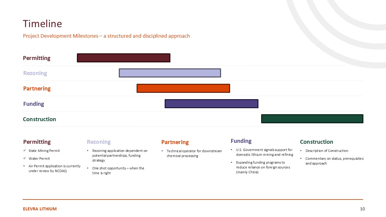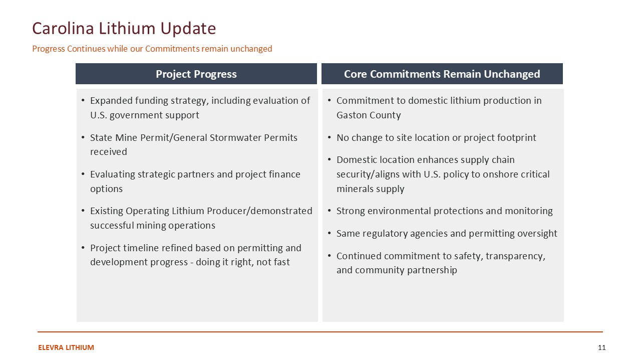 ELEVRA LITHIUM  10  Timeline  Project Development Milestones – a structured and disciplined approach  Permitting  Partnering  Funding  Rezoning  Construction  Permitting  State Mining Permit  Water Permit  Air Permit application is currently under review by NCDAQ  Partnering  Technical operator for downstream chemical processing   Funding  U.S. Government signals support for domestic lithium mining and refining  Expanding funding programs to reduce reliance on foreign sources (mainly China)  Rezoning  Rezoning application dependent on potential partnerships, funding strategy  One shot opportunity – when the time is right   Construction  Description of Construction  Commentary on status, prerequisites and approach