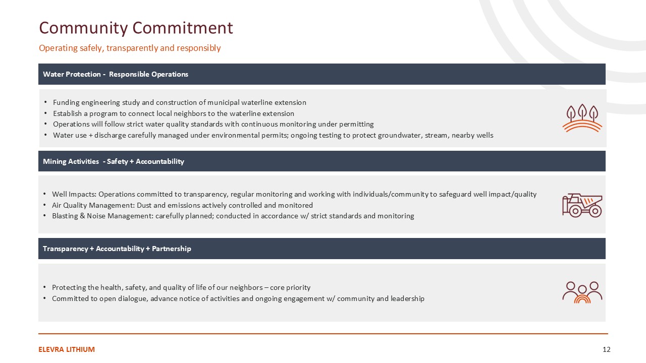 ELEVRA LITHIUM  12  Funding engineering study and construction of municipal waterline extension   Establish a program to connect local neighbors to the waterline extension   Operations will follow strict water quality standards with continuous monitoring under permitting   Water use + discharge carefully managed under environmental permits; ongoing testing to protect groundwater, stream, nearby wells  Water Protection - Responsible Operations   Well Impacts: Operations committed to transparency, regular monitoring and working with individuals/community to safeguard well impact/quality   Air Quality Management: Dust and emissions actively controlled and monitored   Blasting & Noise Management: carefully planned; conducted in accordance w/ strict standards and monitoring   Mining Activities - Safety + Accountability   Transparency + Accountability + Partnership   Protecting the health, safety, and quality of life of our neighbors – core priority   Committed to open dialogue, advance notice of activities and ongoing engagement w/ community and leadership   Community Commitment  Operating safely, transparently and responsibly