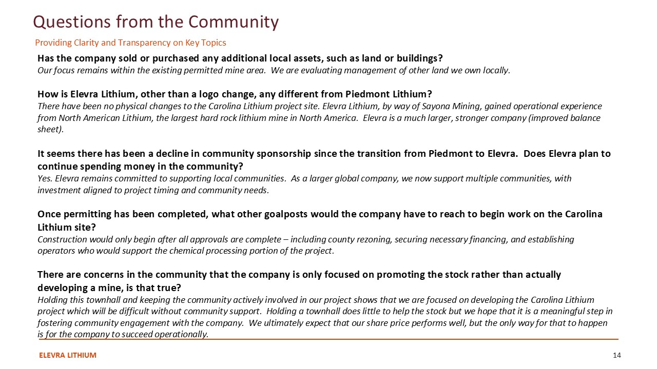 Has the company sold or purchased any additional local assets, such as land or buildings?   Our focus remains within the existing permitted mine area. We are evaluating management of other land we own locally.   How is Elevra Lithium, other than a logo change, any different from Piedmont Lithium?   There have been no physical changes to the Carolina Lithium project site. Elevra Lithium, by way of Sayona Mining, gained operational experience from North American Lithium, the largest hard rock lithium mine in North America. Elevra is a much larger, stronger company (improved balance sheet).  It seems there has been a decline in community sponsorship since the transition from Piedmont to Elevra. Does Elevra plan to continue spending money in the community?   Yes. Elevra remains committed to supporting local communities. As a larger global company, we now support multiple communities, with investment aligned to project timing and community needs.   Once permitting has been completed, what other goalposts would the company have to reach to begin work on the Carolina Lithium site?  Construction would only begin after all approvals are complete – including county rezoning, securing necessary financing, and establishing operators who would support the chemical processing portion of the project.   There are concerns in the community that the company is only focused on promoting the stock rather than actually developing a mine, is that true?   Holding this townhall and keeping the community actively involved in our project shows that we are focused on developing the Carolina Lithium project which will be difficult without community support. Holding a townhall does little to help the stock but we hope that it is a meaningful step in fostering community engagement with the company. We ultimately expect that our share price performs well, but the only way for that to happen is for the company to succeed operationally.   ELEVRA LITHIUM  14  Questions from the Community    Providing Clarity and Transparency on Key Topics