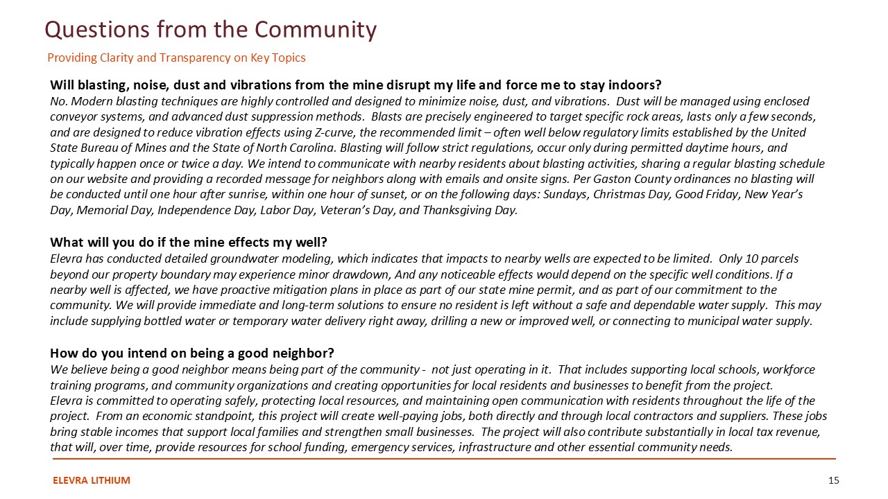 Will blasting, noise, dust and vibrations from the mine disrupt my life and force me to stay indoors?   No. Modern blasting techniques are highly controlled and designed to minimize noise, dust, and vibrations. Dust will be managed using enclosed conveyor systems, and advanced dust suppression methods. Blasts are precisely engineered to target specific rock areas, lasts only a few seconds, and are designed to reduce vibration effects using Z-curve, the recommended limit – often well below regulatory limits established by the United State Bureau of Mines and the State of North Carolina. Blasting will follow strict regulations, occur only during permitted daytime hours, and typically happen once or twice a day. We intend to communicate with nearby residents about blasting activities, sharing a regular blasting schedule on our website and providing a recorded message for neighbors along with emails and onsite signs. Per Gaston County ordinances no blasting will be conducted until one hour after sunrise, within one hour of sunset, or on the following days: Sundays, Christmas Day, Good Friday, New Year’s Day, Memorial Day, Independence Day, Labor Day, Veteran’s Day, and Thanksgiving Day.  What will you do if the mine effects my well?   Elevra has conducted detailed groundwater modeling, which indicates that impacts to nearby wells are expected to be limited. Only 10 parcels beyond our property boundary may experience minor drawdown, And any noticeable effects would depend on the specific well conditions. If a nearby well is affected, we have proactive mitigation plans in place as part of our state mine permit, and as part of our commitment to the community. We will provide immediate and long-term solutions to ensure no resident is left without a safe and dependable water supply. This may include supplying bottled water or temporary water delivery right away, drilling a new or improved well, or connecting to municipal water supply.  How do you intend on being a good neighbor?   We believe being a good neighbor means being part of the community - not just operating in it. That includes supporting local schools, workforce training programs, and community organizations and creating opportunities for local residents and businesses to benefit from the project.   Elevra is committed to operating safely, protecting local resources, and maintaining open communication with residents throughout the life of the project. From an economic standpoint, this project will create well-paying jobs, both directly and through local contractors and suppliers. These jobs bring stable incomes that support local families and strengthen small businesses. The project will also contribute substantially in local tax revenue, that will, over time, provide resources for school funding, emergency services, infrastructure and other essential community needs.   ELEVRA LITHIUM  15  Questions from the Community    Providing Clarity and Transparency on Key Topics