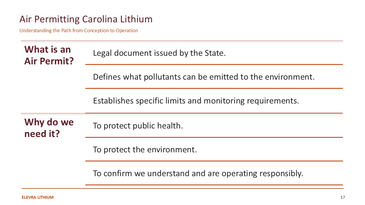Air Permitting Carolina Lithium  Understanding the Path from Conception to Operation  ELEVRA LITHIUM  17
