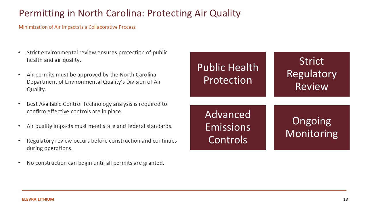 Strict environmental review ensures protection of public health and air quality.  Air permits must be approved by the North Carolina Department of Environmental Quality’s Division of Air Quality.  Best Available Control Technology analysis is required to confirm effective controls are in place.  Air quality impacts must meet state and federal standards.  Regulatory review occurs before construction and continues during operations.   No construction can begin until all permits are granted.  Permitting in North Carolina: Protecting Air Quality   Minimization of Air Impacts is a Collaborative Process  ELEVRA LITHIUM  18