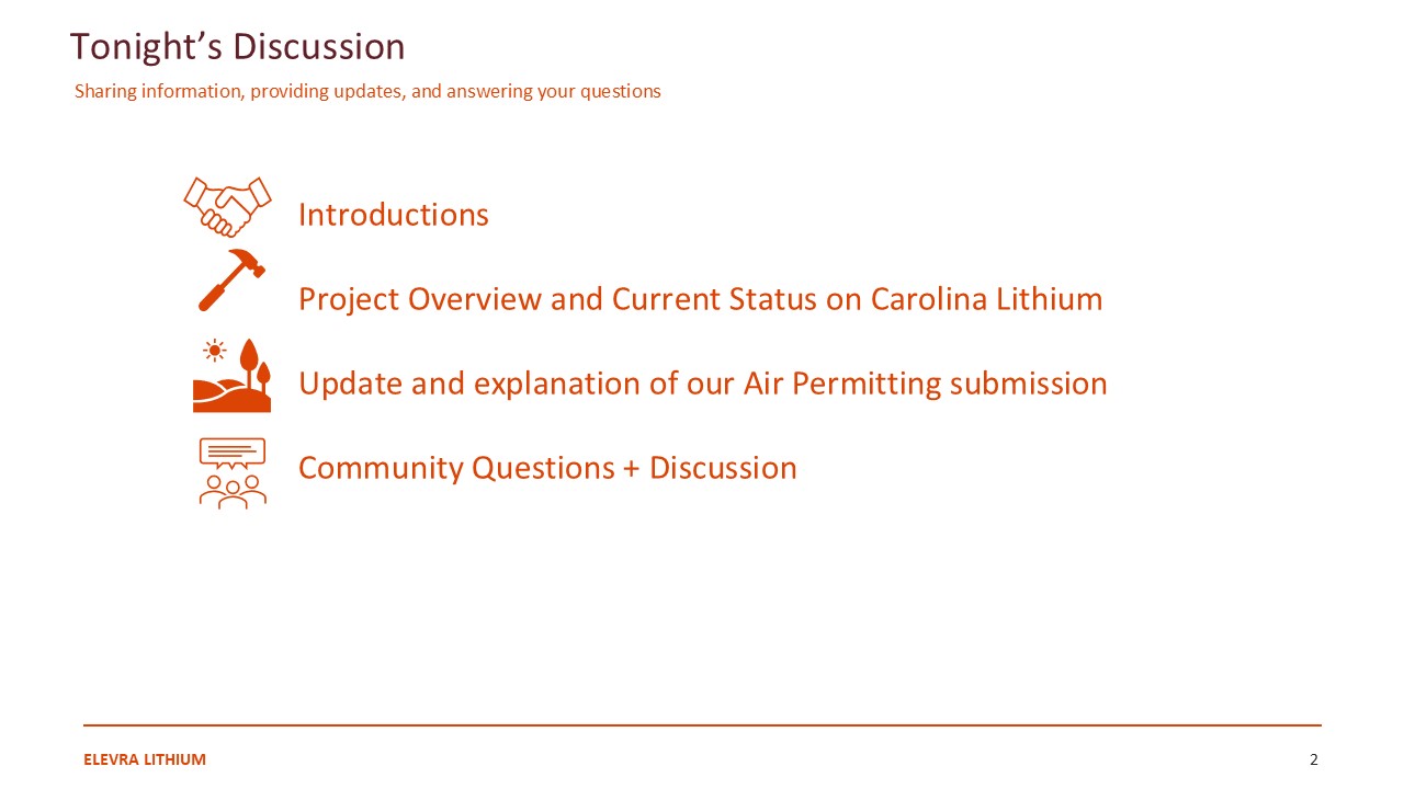 Introductions   Project Overview and Current Status on Carolina Lithium   Update and explanation of our Air Permitting submission   Community Questions + Discussion   ELEVRA LITHIUM  2  Tonight’s Discussion   Sharing information, providing updates, and answering your questions