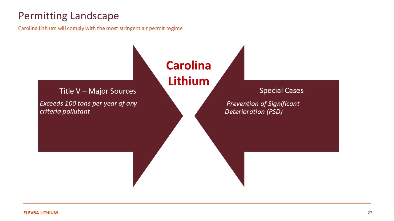 Carolina  Lithium   Permitting Landscape  Carolina Lithium will comply with the most stringent air permit regime  ELEVRA LITHIUM  22