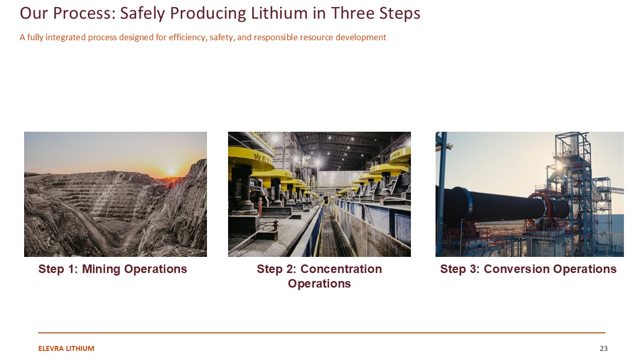 Our Process: Safely Producing Lithium in Three Steps  A fully integrated process designed for efficiency, safety, and responsible resource development   Step 1: Mining Operations   Step 2: Concentration Operations   Step 3: Conversion Operations   ELEVRA LITHIUM  23