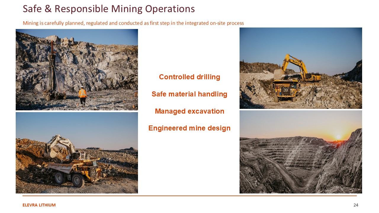 Safe & Responsible Mining Operations   Mining is carefully planned, regulated and conducted as first step in the integrated on-site process  ELEVRA LITHIUM  24  Controlled drilling  Safe material handling   Managed excavation   Engineered mine design